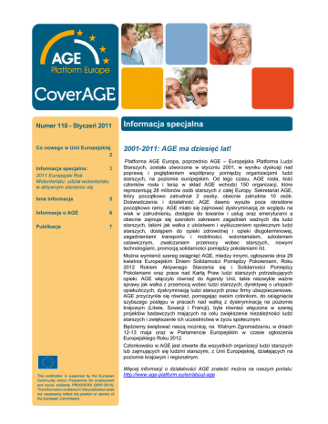 Numer 110 - Styczeń 2011 Co nowego w Unii Europejskiej 2 3 Informacja specjalna: 2011 Europejski Rok Wolontariatu: udział wolontariatu w aktywnym starzeniu się Inne informacje 5 Informacje o AGE 6 Publikacje 7 Informacja specjalna 2001-2011: AGE ma dziesięć lat! Platforma AGE Europa, poprzednio AGE – Europejska Platforma Ludzi Starszych, została utworzona w styczniu 2001, w wyniku dyskusji nad poprawą i pogłębieniem współpracy pomiędzy organizacjami ludzi starszych, na poziomie europejskim. Od tego czasu, AGE rosła, ilość członków rosła i teraz w skład AGE wchodzi 150 organizacji, które reprezentują 28 milionów osób starszych z całej Europy. Sekretariat AGE, który początkowo zatrudniał 2 osoby, obecnie zatrudnia 10 osób. Doświadczenia i działalność AGE dawno wyszła poza określone początkowo ramy. AGE miało się zajmować dyskryminacją ze względu na wiek w zatrudnieniu, dostępie do towarów i usług oraz emeryturami a obecnie zajmuje się szerokim zakresem zagadnień ważnych dla ludzi starszych, takimi jak walka z ubóstwem i wykluczeniem społecznym ludzi starszych, dostępem do opieki zdrowotnej i opieki długoterminowej, zagadnieniami transportu i mobilności, wolontariatem, szkoleniem ustawicznym, zwalczaniem przemocy wobec starszych, nowymi technologiami, promocją solidarności pomiędzy pokoleniami itd. Można wymienić szereg osiągnięć AGE, miedzy innymi, ogłoszenie dnia 29 kwietnia Europejskim Dniem Solidarności Pomiędzy Pokoleniami, Roku 2012 Rokiem Aktywnego Starzenia się i Solidarności Pomiędzy Pokoleniami oraz prace nad Kartą Praw ludzi starszych potrzebujących opieki. AGE włączyło również do Agendy Unii, takie niezwykle ważne sprawy jak walka z przemocą wobec ludzi starszych, dyrektywę o urlopach opiekuńczych, dyskryminację ludzi starszych przez firmy ubezpieczeniowe. AGE przyczyniła się również, pomagając swoim członkom, do osiągnięcia szybszego postępu w pracach nad walką z dyskryminacją na poziomie krajowym (Litwie, Szwecji i Francji), była również włączona w szereg projektów badawczych mających na celu zwiększenie niezależności ludzi starszych i zwiększenie ich uczestnictwa w życiu społecznym. Będziemy świętować naszą rocznicę, na Walnym Zgromadzeniu, w dniach 12-13 maja oraz w Parlamencie Europejskim w czasie ogłoszenia Europejskiego Roku 2012. Członkowsko w AGE jest otwarte dla wszystkich organizacji ludzi starszych lub zajmujących się ludźmi starszymi, z Unii Europejskiej, działających na poziomie krajowym i regionalnym. Więcej informacji o działalności AGE znaleźć można na naszym portalu: http://www.age-platform.eu/en/about-age 2 Co nowego w Unii Europejskiej Rada Podsumowanie Prezydencji Belgijskiej, lipiec-grudzień 2010 AGE gratuluje Prezydencji Belgijskiej za jej działania w sferze społecznej, co przyczyniło się do znacznego postępu w kilku dziedzinach takich jak: ‐ Walka z ubóstwem i wykluczeniem społecznym ‐ Emerytury ‐ Zdrowie Początek Prezydencji Węgierskiej Priorytetem Prezydencji Węgierskiej jest wzrost, praca i integracja społeczna. W dziedzinie spraw socjalnych Prezydencja zajmować się będzie ubóstwem dzieci, integracją Romów, znalezieniem odpowiedzi na wyzwania demograficzne w systemach zdrowotnych oraz poprawą polityki rodzinnej. Pełna informacja dostępna w języku angielskim pod adresem: http://www.age-platform.eu/en Można skorzystać z tłumaczenia automatycznego Google pod adresem: http://translate.google.pl/# lub zwrócić się z prośbą o tłumaczenie określonego fragment tekstu do Forum 50+: [email protected] Parlament Europejski AGE jest bardzo zadowolone z inicjatyw Parlamentu Europejskiego w roku 2010 i wzywa do działania w roku 2011 i 2012! *Informacja dostępna w języku angielskim pod adresem: http://www.age-platform.eu/en Można skorzystać z tłumaczenia automatycznego Google pod adresem: http://translate.google.pl/# lub zwrócić się z prośbą o tłumaczenie określonego fragment tekstu do Forum 50+: [email protected] Spotkanie intergrupy zajmującej sie sprawami starości i solidarności pomiędzy pokoleniami Debata nad partnerstwem Europejskim działającym w dziedzinie aktywnego i zdrowego starzenia się: *Informacja dostępna w języku angielskim pod adresem: http://www.age-platform.eu/en Można skorzystać z tłumaczenia automatycznego Google pod adresem: http://translate.google.pl/# lub zwrócić się z prośbą o tłumaczenie określonego fragment tekstu do Forum 50+: [email protected] Komisja Europejska EU ratyfikuje Konwencję ONZ o prawach niepełnosprawnych *Informacja dostępna w języku angielskim pod adresem: http://www.age-platform.eu/en Można skorzystać z tłumaczenia automatycznego Google pod adresem: http://translate.google.pl/# lub zwrócić się z prośbą o tłumaczenie określonego fragment tekstu do Forum 50+: [email protected] EU rozpoczyna nowa strategię dla niepełnosprawnych *Informacja dostępna w języku angielskim pod adresem: http://www.age-platform.eu/en 3 można skorzystać z tłumaczenia automatycznego Google pod adresem: http://translate.google.pl/# lub zwrócić się z prośbą o tłumaczenie określonego fragment tekstu do Forum 50+: [email protected] Nowe umiejętności dla nowych miejsc pracy *Informacja dostępna w języku angielskim pod adresem: http://www.age-platform.eu/en Można skorzystać z tłumaczenia automatycznego Google pod adresem: http://translate.google.pl/# lub zwrócić się z prośbą o tłumaczenie określonego fragment tekstu do Forum 50+: [email protected] Projekty badawcze Unii Europejskiej potwierdzają, że SME i władze publiczne powinny służyć ludziom starszym *Informacja dostępna w języku angielskim pod adresem: http://www.age-platform.eu/en Można skorzystać z tłumaczenia automatycznego Google pod adresem: http://translate.google.pl/# lub zwrócić się z prośbą o tłumaczenie określonego fragment tekstu do Forum 50+: [email