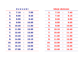 d z w o n k i 1. 7.10 — 7.55 2. 8.00 — 8.45 3. 8.55 — 9.40 4. 9.50