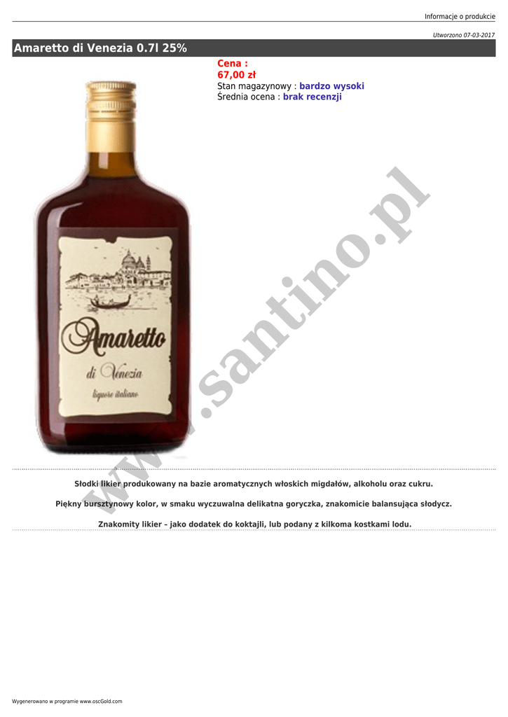 Informacje o produkcie Utworzono 07-03-2017 Amaretto di Venezia 0.7l 25% Cena : 67,00 zł w w w .s an t in o. pl Stan magazynowy : bardzo wysoki Średnia ocena : brak recenzji Słodki likier produkowany na bazie aromatycznych włoskich migdałów, alkoholu oraz cukru. Piękny bursztynowy kolor, w smaku wyczuwalna delikatna goryczka, znakomicie balansująca słodycz. Znakomity likier – jako dodatek do koktajli, lub podany z kilkoma kostkami lodu. Wygenerowano w programie www.oscGold.com
