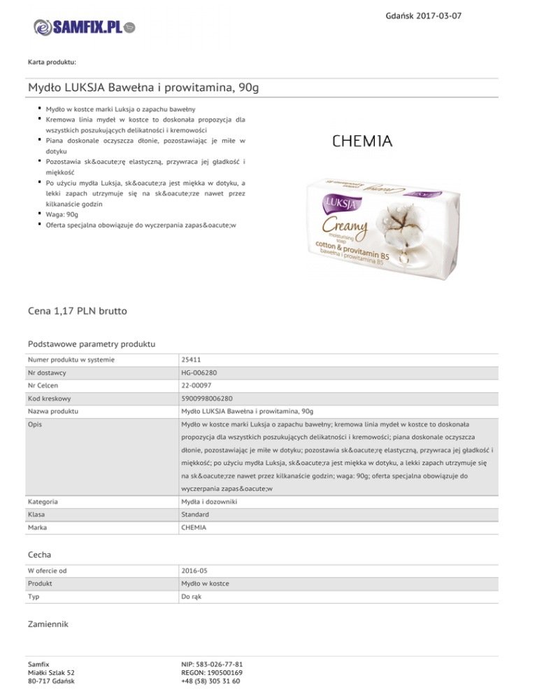 Gdańsk 2017-03-07 Karta produktu: Mydło LUKSJA Bawełna i prowitamina, 90g Mydło w kostce marki Luksja o zapachu bawełny Kremowa linia mydeł w kostce to doskonała propozycja dla wszystkich poszukujących delikatności i kremowości Piana doskonale oczyszcza dłonie, pozostawiając je miłe w dotyku Pozostawia skórę elastyczną, przywraca jej gładkość i miękkość Po użyciu mydła Luksja, skóra jest miękka w dotyku, a lekki zapach utrzymuje się na skórze nawet przez kilkanaście godzin Waga: 90g Oferta specjalna obowiązuje do wyczerpania zapasów Cena 1,17 PLN brutto Podstawowe parametry produktu Numer produktu w systemie 25411 Nr dostawcy HG-006280 Nr Celcen 22-00097 Kod kreskowy 5900998006280 Nazwa produktu Mydło LUKSJA Bawełna i prowitamina, 90g Opis Mydło w kostce marki Luksja o zapachu bawełny; kremowa linia mydeł w kostce to doskonała propozycja dla wszystkich poszukujących delikatności i kremowości; piana doskonale oczyszcza dłonie, pozostawiając je miłe w dotyku; pozostawia skórę elastyczną, przywraca jej gładkość i miękkość; po użyciu mydła Luksja, skóra jest miękka w dotyku, a lekki zapach utrzymuje się na skórze nawet przez kilkanaście godzin; waga: 90g; oferta specjalna obowiązuje do wyczerpania zapasów Kategoria Mydła i dozowniki Klasa Standard Marka CHEMIA Cecha W ofercie od 2016-05 Produkt Mydło w kostce Typ Do rąk Zamiennik Samfix Miałki Szlak 52 80-717 Gdańsk NIP: 583-026-77-81 REGON: 190500169 +48 (58) 305 31 60 Gdańsk 2017-03-07 Karta katalogowa produktu cd. Mydło LUKSJA Bawełna i prowitamina, 90g Zamiennik HG-005047 Wspólny słownik zamówień CPV 33741000-6 Certyfikaty Nowy produkt w ofercie Standard Hit Standard Serdecznie zapraszamy do współpracy Zespół Samfix. Samfix Miałki Szlak 52 80-717 Gdańsk NIP: 583-026-77-81 REGON: 190500169 +48 (58) 305 31 60