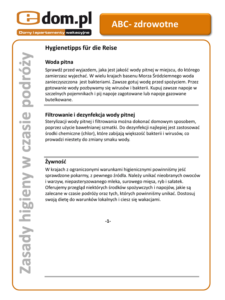 ABC- zdrowotne Hygienetipps für die Reise Woda pitna Sprawdź przed wyjazdem, jaka jest jakośd wody pitnej w miejscu, do którego zamierzasz wyjechad. W wielu krajach basenu Morza Śródziemnego woda zanieczyszczona jest bakteriami. Zawsze gotuj wodę przed spożyciem. Przez gotowanie wody pozbywamy się wirusów i bakterii. Kupuj zawsze napoje w szczelnych pojemnikach i pij napoje zagotowane lub napoje gazowane butelkowane. Filtrowanie i dezynfekcja wody pitnej Sterylizacji wody pitnej i filtrowania można dokonad domowym sposobem, poprzez użycie bawełnianej szmatki. Do dezynfekcji najlepiej jest zastosowad środki chemiczne (chlor), które zabijają większośd bakterii i wirusów, co prowadzi niestety do zmiany smaku wody. Żywnośd W krajach z ograniczonymi warunkami higienicznymi powinniśmy jeśd sprawdzone pokarmy, z pewnego źródła. Należy unikad nieobranych owoców i warzyw, niepasteryzowanego mleka, surowego mięsa, ryb i sałatek. Oferujemy przegląd niektórych środków spożywczych i napojów, jakie są zalecane w czasie podróży oraz tych, których powinniśmy unikad. Dostosuj swoją dietę do warunków lokalnych i ciesz się wakacjami. -1- ABC- zdrowotne Polecamy następujące potrawy Potrawy świeżo ugotowane i usmażone, n.p. chude, smażone mięso Makarony, ryż, ziemniaki, zupy, oraz cebulę, fasolę, groch, itp. Obrane owoce: banany, pomaraocze, ananasy, orzechy kokosowe, mango Woda mineralna, herbata i kawa oraz napoje szczelnie zamknięte Przyprawy : sól, pieprz, ocet, olej, curry, ostre przyprawy, itp. Potrawy budzące wątpliwości: Drób, ryby, owoce morza, kraby, raki, małże Produkty mleczne: świeże mleko, sery, jogurt, twaróg Mrożonki Potrawy, których powinniśmy unikad: Surowe ryby i surowe mięso, n.p. tatar zimne przekąski: sałaty, szynka, kiełbasa, tłuste opotrawyl, n.p. sałatka ziemniaczana z majonezem, Jaja, kanapki Kostki lodu, lody, otwarte zimne napoje, nie pakowane szczelnie Środki spożywcze pakowane w folie, n.p. pocięte owoce -2-
