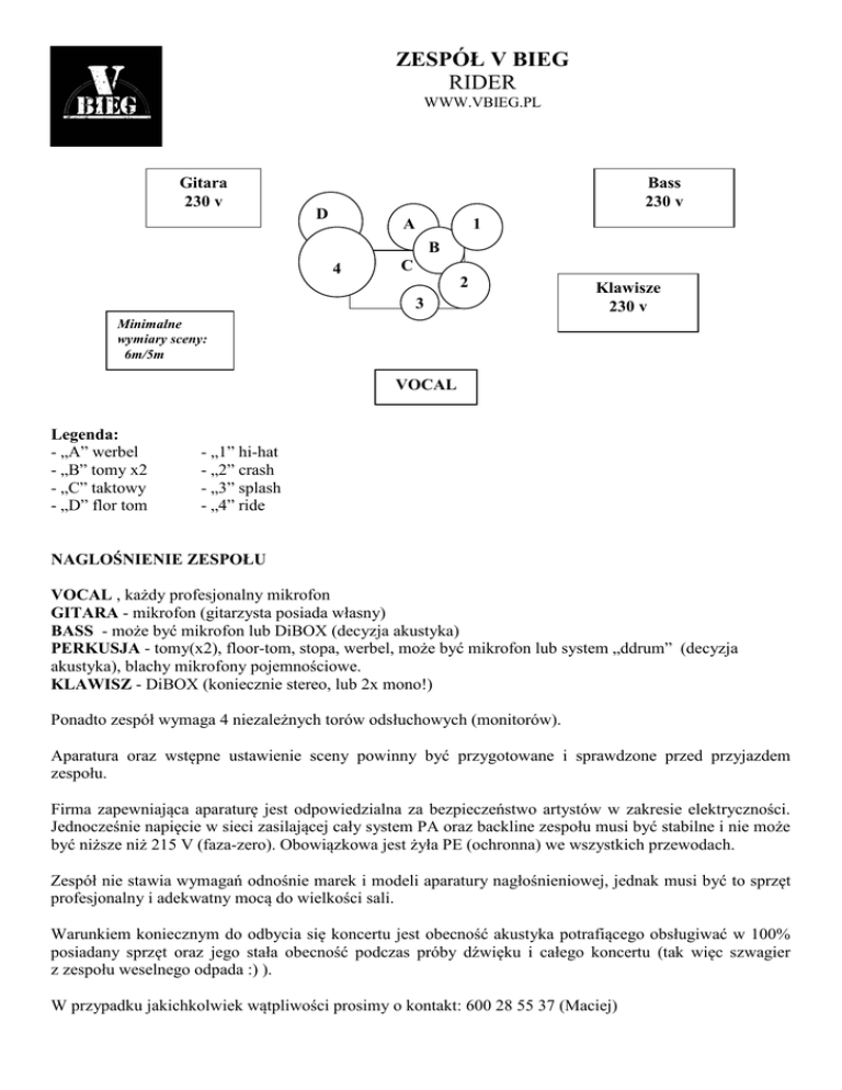 ZESPÓŁ V BIEG RIDER WWW.VBIEG.PL Gitara 230 v Bass 230 v D A 1 B 4 C 2 3 Klawisze 230 v Minimalne wymiary sceny: 6m/5m VOCAL Legenda: - „A” werbel - „B” tomy x2 - „C” taktowy - „D” flor tom - „1” hi-hat - „2” crash - „3” splash - „4” ride NAGLOŚNIENIE ZESPOŁU VOCAL , każdy profesjonalny mikrofon GITARA - mikrofon (gitarzysta posiada własny) BASS - może być mikrofon lub DiBOX (decyzja akustyka) PERKUSJA - tomy(x2), floor-tom, stopa, werbel, może być mikrofon lub system „ddrum” (decyzja akustyka), blachy mikrofony pojemnościowe. KLAWISZ - DiBOX (koniecznie stereo, lub 2x mono!) Ponadto zespół wymaga 4 niezależnych torów odsłuchowych (monitorów). Aparatura oraz wstępne ustawienie sceny powinny być przygotowane i sprawdzone przed przyjazdem zespołu. Firma zapewniająca aparaturę jest odpowiedzialna za bezpieczeństwo artystów w zakresie elektryczności. Jednocześnie napięcie w sieci zasilającej cały system PA oraz backline zespołu musi być stabilne i nie może być niższe niż 215 V (faza-zero). Obowiązkowa jest żyła PE (ochronna) we wszystkich przewodach. Zespół nie stawia wymagań odnośnie marek i modeli aparatury nagłośnieniowej, jednak musi być to sprzęt profesjonalny i adekwatny mocą do wielkości sali. Warunkiem koniecznym do odbycia się koncertu jest obecność akustyka potrafiącego obsługiwać w 100% posiadany sprzęt oraz jego stała obecność podczas próby dźwięku i całego koncertu (tak więc szwagier z zespołu weselnego odpada :) ). W przypadku jakichkolwiek wątpliwości prosimy o kontakt: 600 28 55 37 (Maciej)