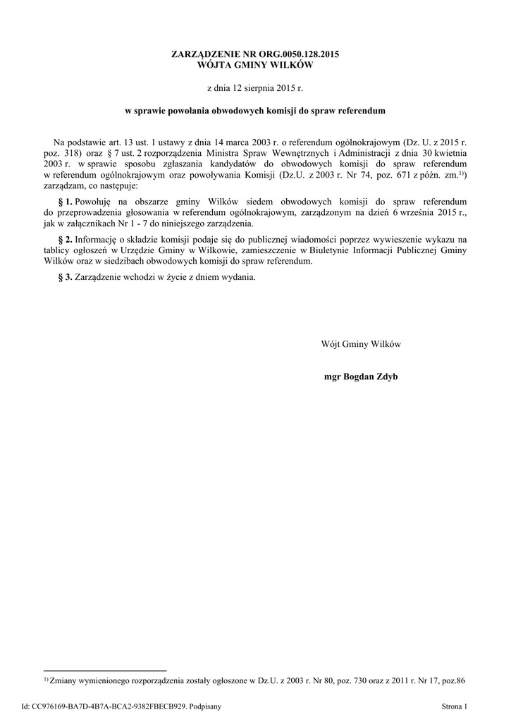ZARZĄDZENIE NR ORG.0050.128.2015 WÓJTA GMINY WILKÓW z dnia 12 sierpnia 2015 r. w sprawie powołania obwodowych komisji do spraw referendum Na podstawie art. 13 ust. 1 ustawy z dnia 14 marca 2003 r. o referendum ogólnokrajowym (Dz. U. z 2015 r. poz. 318) oraz § 7 ust. 2 rozporządzenia Ministra Spraw Wewnętrznych i Administracji z dnia 30 kwietnia 2003 r. w sprawie sposobu zgłaszania kandydatów do obwodowych komisji do spraw referendum w referendum ogólnokrajowym oraz powoływania Komisji (Dz.U. z 2003 r. Nr 74, poz. 671 z późn. zm.1)) zarządzam, co następuje: § 1. Powołuję na obszarze gminy Wilków siedem obwodowych komisji do spraw referendum do przeprowadzenia głosowania w referendum ogólnokrajowym, zarządzonym na dzień 6 września 2015 r., jak w załącznikach Nr 1 - 7 do niniejszego zarządzenia. § 2. Informację o składzie komisji podaje się do publicznej wiadomości poprzez wywieszenie wykazu na tablicy ogłoszeń w Urzędzie Gminy w Wilkowie, zamieszczenie w Biuletynie Informacji Publicznej Gminy Wilków oraz w siedzibach obwodowych komisji do spraw referendum. § 3. Zarządzenie wchodzi w życie z dniem wydania. Wójt Gminy Wilków mgr Bogdan Zdyb 1) Zmiany wymienionego rozporządzenia zostały ogłoszone w Dz.U. z 2003 r. Nr 80, poz. 730 oraz z 2011 r. Nr 17, poz.86 Id: CC976169-BA7D-4B7A-BCA2-9382FBECB929. Podpisany Strona 1 Załącznik Nr 1 do Zarządzenia Nr ORG.0050.128.2015 Wójta Gminy Wilków z dnia 12 sierpnia 2015 r. Obwodowa Komisja do spraw Referendum Nr 1 w Bukowiu Adres siedziby Obwodowej Komisji do spraw Referendum: Szkoła Podstawowa, ul. Lipowa 54, Bukowie, 46-113 Wilków Lp. Imię (imiona) i nazwisko Miejsce zamieszkania Podmiot uprawniony 1. Magdalena Józefa Łambucka Bukowie Partia polityczna Prawo i Sprawiedliwość 2. Justyna Agnieszka Mela Pągów 3. Andrzej Marek Zychowicz Wilków 4. Jagoda Helena Mazurek Bukowie 5. Bogumiła Małgorzata Noga Wilków 6. Dorota Palica Wilków 7. Michał Łukasz Kowalik Pągów 8. Agata Mašek Bukowie Id: CC976169-BA7D-4B7A-BCA2-9382FBECB929. Podpisany Partia polityczna Polskie Stronnictwo Ludowe Partia polityczna Sojusz Lewicy Demokratycznej Stowarzyszenie Klub Młodych Solidarnej Polski Fundacja Lepsza Polska Stowarzyszenie Klub ZachowawczoMonarchistyczny Partia polityczna Platforma Obywatelska Rzeczypospolitej Polskiej Wójt Gminy Wilków Strona 1 Załącznik Nr 2 do Zarządzenia Nr ORG.0050.128.2015 Wójta Gminy Wilków z dnia 12 sierpnia 2015 r. Obwodowa Komisja do spraw Referendum Nr 2 w Lubskiej Adres siedziby Obwodowej Komisji do spraw Referendum: Kaplica, Lubska 25a, Lubska, 46-113 Wilków Lp. Imię (imiona) i nazwisko Miejsce zamieszkania Podmiot uprawniony 1. Leszek Bronisław Polakiewicz Wilków Partia polityczna Prawo i Sprawiedliwość 2. Anida Mętel Wilków 3. Lucyna Gąsior Młokicie 4. Paweł Grab Wilków 5. Łukasz Oleg Perak Wilków Fundacja Lepsza Polska 6. Jadwiga Agnieszka Hejna Wilków Partia polityczna Platforma Obywatelska Rzeczypospolitej Polskiej 7. Joanna Piaskowska Lubska Wójt Gminy Wilków Id: CC976169-BA7D-4B7A-BCA2-9382FBECB929. Podpisany Partia polityczna Polskie Stronnictwo Ludowe Partia polityczna Sojusz Lewicy Demokratycznej Stowarzyszenie Klub Młodych Solidarnej Polski Strona 1 Załącznik Nr 3 do Zarządzenia Nr ORG.0050.128.2015 Wójta Gminy Wilków z dnia 12 sierpnia 2015 r. Obwodowa Komisja do spraw Referendum Nr 3 w Idzikowicach Adres siedziby Obwodowej Komisji do spraw Referendum: Szkoła Podstawowa, Idzikowice 24a, Idzikowice, 46-113 Wilków Lp. Imię (imiona) i nazwisko Miejsce zamieszkania Podmiot uprawniony 1. Przemysław Wójcicki Wilków Partia polityczna Prawo i Sprawiedliwość 2. Teresa Krawiec Idzikowice Partia polityczna Polskie Stronnictwo Ludowe 3. Grażyna Głód Idzikowice 4. Małgorzata Renata Nowakowska Wilków 5. Alina Justyna Mikuśkiewicz Wilków 6. Damian Pianka Idzikowice 7. Małgorzata Krystyna Piaskowa Idzikowice 8. Marta Anna Skubis Idzikowice Stowarzyszenie Instytut Myśli Państwowej 9. Marcin Jacek Zdyb Idzikowice Wójt Gminy Wilków Id: CC976169-BA7D-4B7A-BCA2-9382FBECB929. Podpisany Partia polityczna Sojusz Lewicy Demokratycznej Stowarzyszenie Klub Młodych Solidarnej Polski Fundacja Lepsza Polska Stowarzyszenie Klub ZachowawczoMonarchistyczny Partia polityczna Platforma Obywatelska Rzeczypospolitej Polskiej Strona 1 Załącznik Nr 4 do Zarządzenia Nr ORG.0050.128.2015 Wójta Gminy Wilków z dnia 12 sierpnia 2015 r. Obwodowa Komisja do spraw Referendum Nr 4 w Krzykowie Adres siedziby Obwodowej Komisji do spraw Referendum: Świetlica, Krzyków 28, Krzyków, 46-113 Wilków Lp. Imię (imiona) i nazwisko Miejsce zamieszkania Podmiot uprawniony 1. Dariusz Marian Przytulski Wilków Partia polityczna Prawo i Sprawiedliwość 2. Anna Dzidowska Wilków 3. Przemysław Szymon Głodek Wilków 4. Bogumiła Małgorzata Juchniewicz Wilków 5. Ilona Górecka Krzyków 6. Aneta Gaweł Jakubowice 7. Małgorzata Janina Szulakowska Krzyków 8. Renata Małgorzata Kapica Idzikowice Id: CC976169-BA7D-4B7A-BCA2-9382FBECB929. Podpisany Partia polityczna Polskie Stronnictwo Ludowe Partia polityczna Sojusz Lewicy Demokratycznej Stowarzyszenie Klub Młodych Solidarnej Polski Fundacja Lepsza Polska Stowarzyszenie Klub ZachowawczoMonarchistyczny Partia polityczna Platforma Obywatelska Rzeczypospolitej Polskiej Wójt Gminy Wilków Strona 1 Załącznik Nr 5 do Zarządzenia Nr ORG.0050.128.2015 Wójta Gminy Wilków z dnia 12 sierpnia 2015 r. Obwodowa Komisja do spraw Referendum Nr 5 w Pągowie Adres siedziby Obwodowej Komisji do spraw Referendum: Świetlica, ul. Główna 19, Pągów, 46-113 Wilków Lp. Imię (imiona) i nazwisko Miejsce zamieszkania Podmiot uprawniony 1. Barbara Anna Kuświk Bukowie Partia polityczna Prawo i Sprawiedliwość 2. Magda Zofia Podyma Idzikowice 3. Anita Barbara Jankowska Wilków 4. Barbara Maria Rybska Wojciechów 5. Zygmunt Mikuśkiewicz Wilków 6. Teresa Bochniak Idzikowice 7. Barbara Urbaniec Pągów 8. Agata Elżbieta Witewska