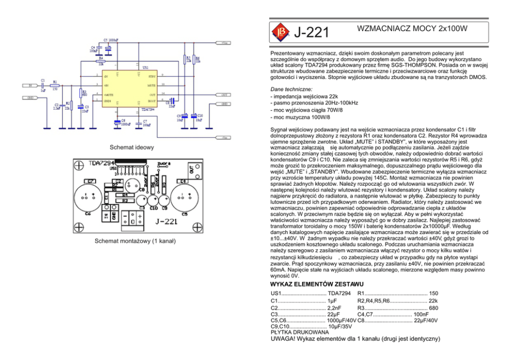 JABEL ® J-221 WZMACNIACZ MOCY 2x100W Prezentowany wzmacniacz, dziêki swoim doskona³ym parametrom polecany jest szczególnie do wspó³pracy z domowym sprzêtem audio. Do jego budowy wykorzystano uk³ad scalony TDA7294 produkowany przez firmê SGS-THOMPSON. Posiada on w swojej strukturze wbudowane zabezpieczenie termiczne i przeciwzwarciowe oraz funkcjê gotowoœci i wyciszenia. Stopnie wyjœciowe uk³adu zbudowane s¹ na tranzystorach DMOS. Dane techniczne: - impedancja wejœciowa 22kW - pasmo przenoszenia 20Hz-100kHz - moc wyjœciowa ci¹g³a 70W/8W - moc muzyczna 100W/8W Schemat ideowy Schemat monta¿owy (1 kana³) Sygna³ wejœciowy podawany jest na wejœcie wzmacniacza przez kondensator C1 i filtr dolnoprzepustowy z³o¿ony z rezystora R1 oraz kondensatora C2. Rezystor R4 wprowadza ujemne sprzê¿enie zwrotne. Uk³ad „MUTE” i STANDBY”, w które wyposa¿ony jest wzmacniacz za³¹czaj¹ siê automatycznie po pod³¹czeniu zasilania. Je¿eli zajdzie koniecznoœæ zmiany sta³ej czasowej tych obwodów, nale¿y odpowiednio dobraæ wartoœci kondensatorów C9 i C10. Nie zaleca siê zmniejszania wartoœci rezystorów R5 i R6, gdy¿ mo¿e groziæ to przekroczeniem maksymalnego, dopuszczalnego pr¹du wejœciowego dla wejœæ „MUTE” i „STANDBY”. Wbudowane zabezpieczenie termiczne wy³¹cza wzmacniacz przy wzroœcie temperatury uk³adu powy¿ej 145C. Monta¿ wzmacniacza nie powinien sprawiaæ ¿adnych k³opotów. Nale¿y rozpocz¹æ go od wlutowania wszystkich zwór. W nastêpnej kolejnoœci nale¿y wlutowaæ rezystory i kondensatory. Uk³ad scalony nale¿y najpierw przykrêciæ do radiatora, a nastêpnie wlutowaæ w p³ytkê. Zabezpieczy to punkty lutownicze przed ich przypadkowym oderwaniem. Radiator, który nale¿y zastosowaæ we wzmacniaczu, powinien zapewniaæ odpowiednie odprowadzanie ciep³a z uk³adów scalonych. W przeciwnym razie bêdzie siê on wy³¹cza³. Aby w pe³ni wykorzystaæ w³aœciwoœci wzmacniacza nale¿y wyposa¿yæ go w dobry zasilacz. Najlepiej zastosowaæ transformator toroidalny o mocy 150W i bateriê kondensatorów 2x10000µF. Wed³ug danych katalogowych napiêcie zasilaj¹ce wzmacniacza mo¿e zawieraæ siê w przedziale od ±10...±40V. W ¿adnym wypadku nie nale¿y przekraczaæ wartoœci ±40V, gdy¿ grozi to uszkodzeniem kosztownego uk³adu scalonego. Podczas uruchamiania wzmacniacza nale¿y szeregowo z zasilaniem wzmacniacza w³¹czyæ rezystor o mocy kilku watów i rezystancji kilkudziesiêciu W, co zabezpieczy uk³ad w przypadku gdy na p³ytce wyst¹pi zwarcie. Pr¹d spoczynkowy wzmacniacza, przy zasilaniu ±40V, nie powinien przekraczaæ 60mA. Napiêcie sta³e na wyjœciach uk³adu scalonego, mierzone wzglêdem masy powinno wynosiæ 0V. WYKAZ ELEMENTÓW ZESTAWU US1.............................. TDA7294 R1.......................................... 150W C1................................ 1µF R2,R4,R5,R6......................... 22kW C2................................ 2,2nF R3.......................................... 680W C3................................ 22µF C4,C7.......................... 100nF C5,C6.......................... 1000µF/40V C8................................ 22µF/40V C9,C10......................... 10µF/35V P£YTKA DRUKOWANA UWAGA! Wykaz elementów dla 1 kana³u (drugi jest identyczny)