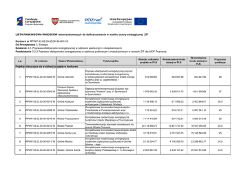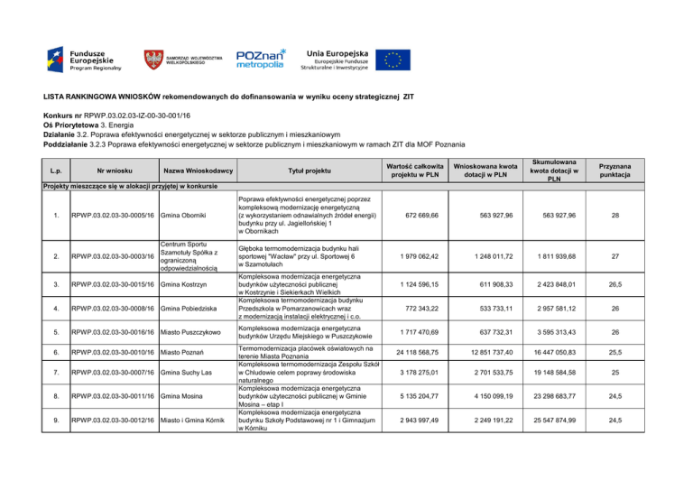 LISTA RANKINGOWA WNIOSKÓW rekomendowanych do dofinansowania w wyniku oceny strategicznej ZIT Konkurs nr RPWP.03.02.03-IZ-00-30-001/16 Oś Priorytetowa 3. Energia Działanie 3.2. Poprawa efektywności energetycznej w sektorze publicznym i mieszkaniowym Poddziałanie 3.2.3 Poprawa efektywności energetycznej w sektorze publicznym i mieszkaniowym w ramach ZIT dla MOF Poznania L.p. Nr wniosku Nazwa Wnioskodawcy Tytuł projektu Wartość całkowita projektu w PLN Wnioskowana kwota dotacji w PLN Projekty mieszczące się w alokacji przyjętej w konkursie RPWP.03.02.03-30-0005/16 Gmina Oborniki Poprawa efektywności energetycznej poprzez kompleksową modernizację energetyczną (z wykorzystaniem odnawialnych źródeł energii) budynku przy ul. Jagiellońskiej 1 w Obornikach 2. RPWP.03.02.03-30-0003/16 Centrum Sportu Szamotuły Spółka z ograniczoną odpowiedzialnością Głęboka termomodernizacja budynku hali sportowej "Wacław" przy ul. Sportowej 6 w Szamotułach 3. RPWP.03.02.03-30-0015/16 Gmina Kostrzyn 4. RPWP.03.02.03-30-0008/16 Gmina Pobiedziska 5. RPWP.03.02.03-30-0016/16 Miasto Puszczykowo 6. RPWP.03.02.03-30-0010/16 Miasto Poznań 7. RPWP.03.02.03-30-0007/16 Gmina Suchy Las 8. RPWP.03.02.03-30-0011/16 Gmina Mosina 9. RPWP.03.02.03-30-0012/16 Miasto i Gmina Kórnik 1. Kompleksowa modernizacja energetyczna budynków użyteczności publicznej w Kostrzynie i Siekierkach Wielkich Kompleksowa termomodernizacja budynku Przedszkola w Pomarzanowicach wraz z modernizacją instalacji elektrycznej i c.o. Kompleksowa modernizacja energetyczna budynków Urzędu Miejskiego w Puszczykowie Termomodernizacja placówek oświatowych na terenie Miasta Poznania Kompleksowa termomodernizacja Zespołu Szkół w Chludowie celem poprawy środowiska naturalnego Kompleksowa modernizacja energetyczna budynków użyteczności publicznej w Gminie Mosina – etap I Kompleksowa modernizacja energetyczna budynku Szkoły Podstawowej nr 1 i Gimnazjum w Kórniku Skumulowana kwota dotacji w PLN Przyznana punktacja 672 669,66 563 927,96 563 927,96 28 1 979 062,42 1 248 011,72 1 811 939,68 27 1 124 596,15 611 908,33 2 423 848,01 26,5 772 343,22 533 733,11 2 957 581,12 26 1 717 470,69 637 732,31 3 595 313,43 26 24 118 568,75 12 851 737,40 16 447 050,83 25,5 3 178 275,01 2 701 533,75 19 148 584,58 25 5 135 204,77 4 150 099,19 23 298 683,77 24,5 2 943 997,49 2 249 191,22 25 547 874,99 24,5 Szpital Rehabilitacyjno Kardiologiczny w Kowanówku Miasto i Gmina Szamotuły 10. RPWP.03.02.03-30-0013/16 11. RPWP.03.02.03-30-0014/16 12. RPWP.03.02.03-30-0004/16 Gmina Skoki 13. RPWP.03.02.03-30-0006/16 Gmina Śrem 14. RPWP.03.02.03-30-0002/16 Miasto i Gmina Buk ul.Ratuszowa 1 64-320 Buk Termomodernizacja budynków C i D oraz administracyjno – leczniczego Kompleksowa modernizacja energetyczna Szkoły Podstawowej nr 1 w Szamotułach Termomodernizacja budynku Urzędu Miasta i Gminy w Skokach Termomodernizacja Szkoły Podstawowej nr 6 w Śremie "Termomodernizacja budynków użyteczności publicznej na terenie Miasta i Gminy Buk wraz z montażem odnawialnych źródeł energii" 2 998 832,43 2 497 300,85 28 045 175,84 24,5 2 077 563,93 1 712 403,43 29 757 579,27 23,5 1 147 637,39 876 801,46 30 634 380,73 23 4 760 327,89 3 596 973,21 34 231 353,94 23 1 641 914,70 1 385 635,49 35 616 989,43 21