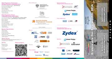 Miejsce Forum: Sponsorzy: BEST WESTERN PREMIER KRAKOW HOTEL **** ul. Opolska 14a, 31-323 Kraków Recepcja Forum: Violetta Górecka, tel. 607 389 357 Wystawa: Karolina Gutowska - Koza, tel. 535 505 660 www.konferencjespecjalistyczne.pl Pobierz program: Partnerzy: Firmy współpracujące: Patroni medialni: p r o g r a m Krajowa Rada Zarządców Dróg Powiatowych Kraków, 26-27 listopada 2014 r. Patronat: Mirosław Bajor Violetta Górecka Grażyna Gutowska Karolina Gutowska-Koza Marlena Kluszczyk Ewelina Nawara – przewodnicząca Andrzej Zygmunt Kontakt Sponsor Specjalny Forum NAWIERZCHNIE DROGOWE 2014 Organizator: Tadeusz Trzmiel Kraków, 25 listopada 2014 r. Ewa Tomala-Borucka Generalny Dyrektor Dróg Krajowych i Autostrad I Zastępca Prezydenta Miasta Krakowa ds. Inwestycji i Infrastruktury Komitet Organizacyjny: Firmy współpracujące: NAWIERZCHNIE DROGOWE 2014 Przewodniczący Sejmowej Komisji Infrastruktury WZMACNIANIE NAWIERZCHNI 2014 Stanisław Żmijan dr inż. Krzysztof Błażejowski – przewodniczący w zakresie asfaltów prof. dr hab. inż. Jan Deja – przewodniczący w zakresie betonów Paweł Czajkowski Wacław Michalski dr inż. Tomasz Rudnicki dr inż. Igor Ruttmar prof. dr hab. inż. Dariusz Sybilski prof. dr hab. inż. Antoni Szydło Adam Wojczuk Andrzej Wyszyński II Ogólnopolskie Forum Specjalistyczne „Drogowe nawierzchnie z mieszanek mineralno-asfaltowych oraz betonu cementowego” Rada Programowa Forum Nawierzchnie Drogowe: I Ogólnopolskie Seminarium Specjalistyczne „Wzmacnianie i remonty konstrukcji nawierzchni drogowych” Maria Wasiak Minister Infrastruktury i Rozwoju 25-27 listopada 2014 r. prof. dr hab. inż.Dariusz Sybilski – przewodniczący dr inż. Krzysztof Błażejowski prof. dr hab. inż. Jan Deja Wacław Michalski dr inż. Igor Ruttmar prof. dr hab. inż. Antoni Szydło Norbert Wyrwich Andrzej Wyszyński Sponsorzy Seminarium WZMACNIANIE NAWIERZCHNI 2014 Krakowskie Dni Nawierzchni 2014 Patronat Honorowy: VII i VIII wydarzenia z cyklu Rada Programowa Seminarium WZMACNIANIE NAWIERZCHNI: Seminarium WZMACNIANIE NAWIERZCHNI 2014 25 listopada 2014 (wtorek) 2. „Poprawa sczepności międzywarstwowej poprzez zabezpieczenie emulsji asfaltowej preparatem Asphacal TC” Dominik Małasiewicz, Lhoist [15’] 3. „Doświadczenia z renowacji nawierzchni asfaltowych zbrojonych geosyntetykami” Adam Kostyra, Inora [15’] Po każdym z wystąpień przewidziano 5 minut na pytania do Prelegentów. Dyskusja [15] 9.00 – Otwarcie recepcji Seminarium 10.00 – 11.00 Kawa i poczęstunek 17.25 – 17.45 Przerwa kawowa 11.00 – 11.15 – Otwarcie Seminarium Ewelina Nawara, Mirosław Bajor, prof. Dariusz Sybilski, dr Krzysztof Błażejowski 11.15 – 13.10 – Sesja I – KONIECZNOŚĆ WZMACNIANIA, OCENA STANU NAWIERZCHNI I DOKUMENTY TECHNICZNE Prowadzenie sesji: Ewelina Nawara, Mirosław Bajor 1. „Konieczność wzmacniania asfaltowych nawierzchni drogowych” prof. Dariusz Sybilski, Instytut Badawczy Dróg i Mostów [20’] 2. „Diagnoza stanu nawierzchni – nowe technologie pomiarowe w GDDKiA oraz kryteria kwalifikowania nawierzchni do wzmocnienia” Wacław Michalski, GDDKiA [20’] 3. „Projekt nowego Katalogu przebudów i remontów nawierzchni podatnych i półsztywnych” prof. Dariusz Sybilski, Instytut Badawczy Dróg i Mostów [20’] 4. „Nowa instrukcja projektowania i wbudowywania mieszanek mineralno – cementowo – emulsyjnych” dr Bohdan Dołżycki, Politechnika Gdańska [20’] Po każdym z wystąpień przewidziano 5 minut na pytania do Prelegentów. Dyskusja [15’] 13.10 – 14.15 – Obiad 14.15 – 15.50 – Sesja II – BIAŁE NA CZARNE, CZARNE NA BIAŁE I RECYKLING Prowadzenie sesji: Piotr Kijowski, prof. Dariusz Sybilski 1. „Technologia whitetopping – założenia i doświadczenia z zastosowań praktycznych” Łukasz Bargenda, Zbigniew Knapik, TPA Instytut Badań Technicznych [20’] 2. „Technologia blacktopping w praktyce wykonawczej” Stanisław Styk, PBI Holding [20’] 3. „Doświadczenia ostatniej dekady we wzmacnianiu przy zastosowaniu recyklingu” dr Piotr Zieliński, Politechnika Krakowska [20’] Po każdym z wystąpień przewidziano 5 minut na pytania do Prelegentów. Dyskusja [20’] 15.50 – 16.10 – Przerwa kawowa 16:10 – 17.25 Sesja III – NOWOCZESNE TECHNOLOGIE I ROZWIĄZANIA Prowadzenie sesji: Wacław Michalski, Andrzej Wyszyński 1. „Wpływ nanotechnologii na poprawę cech mieszanki z materiałem z recyklingu” Piotr Heinrich, Zydex Industries [15’] 17:45 – 18.50 – Sesja IV – MODEROWANE FORUM DYSKUSYJNE WZMACNIANIE NAWIERZCHNI 2014 Moderatorzy: Ewelina Nawara, Mirosław Bajor Paneliści: dr Krzysztof Błażejowski, Adam Czerwiński, Piotr Kijowski, Wacław Michalski, dr Igor Ruttmar, prof. Dariusz Sybilski, prof. Antoni Szydło, Andrzej Wyszyński 18.50 – 19.00 PODSUMOWANIE I ZAKOŃCZENIE SEMINARIUM prof. Dariusz Sybilski, Ewelina Nawara, Mirosław Bajor 19.00 – 20.00 Kolacja Forum NAWIERZCHNIE DROGOWE 2014 26 listopada (środa) 8.30 – Otwarcie recepcji Forum 8.30 – 11.00 Kawa i poczęstunek Wydarzenie towarzyszące Forum 9.00 – 10:00 Spotkanie inauguracyjne inicjatywy Porozumienia na rzecz poprawy wizerunku drogownictwa 11.00 – 11.30 – Oficjalne otwarcie Forum Ewelina Nawara, Mirosław Bajor, dr Krzysztof Błażejowski, Minister Zbigniew Rynasiewicz, prof. Jan Deja, prof. Kazimierz Flaga, prof. Kazimierz Furtak, prof. Stefan Góralczyk, dr Tomasz Rudnicki, prof. Dariusz Sybilski, prof. Antoni Szydło, Zbigniew Tabor, Andrzej Wyszyński 11:30 – 13.20 – Sesja I – I ASFALT I CEMENT Prowadzenie sesji: Ewelina Nawara, Mirosław Bajor 1. „Dlaczego asfalt?” prof. Dariusz Sybilski, Instytut Badawczy Dróg i Mostów [20’] 2. „Dlaczego beton?” prof. Jan Deja, Akademia Górniczo – Hutnicza, Stowarzyszenie Producentów Cementu [20’] Pytania do Prelegentów [10’] 3. „Kryteria wyboru rodzaju nawierzchni w GDDKiA” Wacław Michalski, Generalna Dyrekcja Dróg Krajowych i Auto