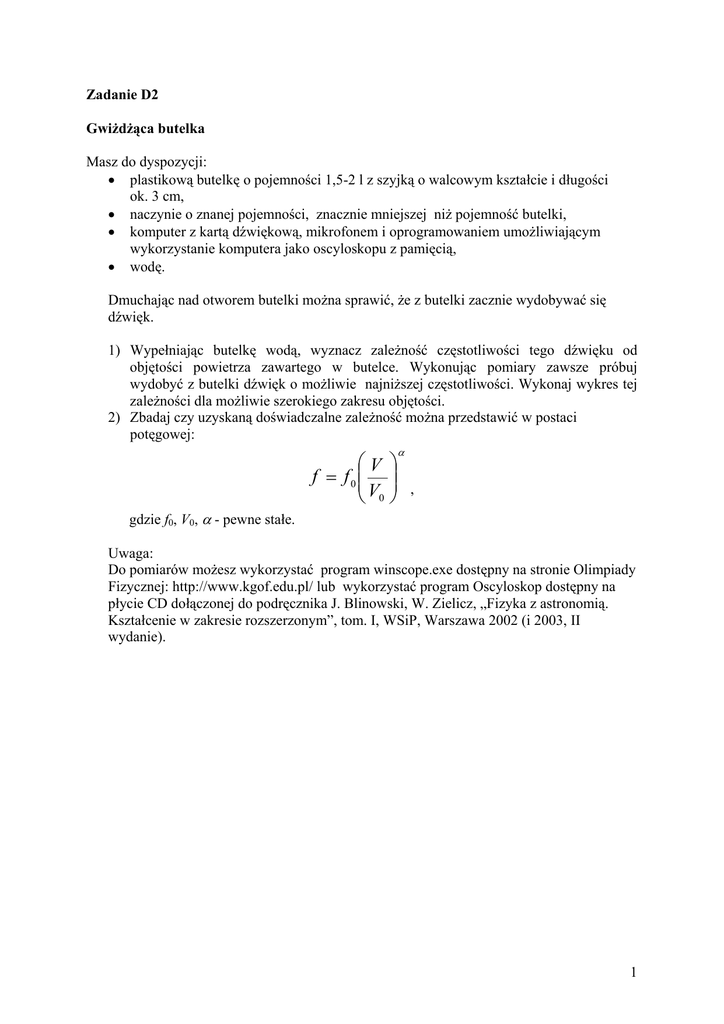 Zadanie D2 Gwiżdżąca butelka Masz do dyspozycji: • plastikową butelkę o pojemności 1,5-2 l z szyjką o walcowym kształcie i długości ok. 3 cm, • naczynie o znanej pojemności, znacznie mniejszej niż pojemność butelki, • komputer z kartą dźwiękową, mikrofonem i oprogramowaniem umożliwiającym wykorzystanie komputera jako oscyloskopu z pamięcią, • wodę. Dmuchając nad otworem butelki można sprawić, że z butelki zacznie wydobywać się dźwięk. 1) Wypełniając butelkę wodą, wyznacz zależność częstotliwości tego dźwięku od objętości powietrza zawartego w butelce. Wykonując pomiary zawsze próbuj wydobyć z butelki dźwięk o możliwie najniższej częstotliwości. Wykonaj wykres tej zależności dla możliwie szerokiego zakresu objętości. 2) Zbadaj czy uzyskaną doświadczalne zależność można przedstawić w postaci potęgowej: ⎛V f = f 0 ⎜⎜ ⎝ V0 ⎞ ⎟⎟ ⎠ α , gdzie f0, V0, α - pewne stałe. Uwaga: Do pomiarów możesz wykorzystać program winscope.exe dostępny na stronie Olimpiady Fizycznej: http://www.kgof.edu.pl/ lub wykorzystać program Oscyloskop dostępny na płycie CD dołączonej do podręcznika J. Blinowski, W. Zielicz, „Fizyka z astronomią. Kształcenie w zakresie rozszerzonym”, tom. I, WSiP, Warszawa 2002 (i 2003, II wydanie). 1 Rozwiązanie Idea rozwiązania zadania nie jest skomplikowana. Po wypełnieniu butelki wodą należy odlewać z niej kolejne porcje wody i dmuchając ponad otworem butelki rejestrować emitowany dźwięk. Do odmierzania wody należy wybrać naczynie o pojemności znacznie mniejszej niż pojemność butelki. Należy się spodziewać, że im więcej punktów pomiarowych będziemy mieć do dyspozycji tym lepiej będzie można zweryfikować hipotezę postawioną w drugiej części zadania. Trzeba jednak wziąć również pod uwagę to, że wybierając zbyt małe naczynie zwiększamy niepewność wyznaczania objętości powietrza zawartego w butelce. W doświadczeniu wykonanym przez recenzenta używane było naczynie o pojemności V0=0.175 l i butelka o pojemności 2 l. Rejestrację sygnałów akustycznych można przeprowadzić używając mikrofonu podłączonego do karty dźwiękowej komputera. Wykorzystując odpowiedni program komputerowy (np. program Oscyloskop) można zapisać uzyskane dane pomiarowe w plikach i analizować je przy użyciu innych programów. Typowa zależność napięcia U odpowiadająca sygnałowi dźwiękowemu, zarejestrowanemu po odlaniu z butelki dwóch porcji wody (2V0=0,35 l) przedstawiona jest na rys. 1. 150 100 U (mV) 50 5T 0 -50 -100 -150 Rys. 1 0 5 10 15 20 25 Czas (ms) Pomimo tego, że amplituda sygnału zmniejsza się z upływem czasu, można wyznaczyć przedział czasu odpowiadający np. pięciokrotnej wielokrotności okresu drgań T. Dzięki pomiarowi czasu trwania kilku okresów drgań można zwiększyć dokładność wyznaczenia częstotliwości dźwięku emitowanego przez butelkę f = 1 T . Na rys. 2 przedstawiono zależność częstotliwości drgań od objętości powietrza w butelce wyznaczoną na podstawie 34 kolejnych rejestracji dźwięku dla danego wypełnienia butelki. Niepewność wyniku pomiarowego oszacowano biorąc pod uwagę rozrzut statystyczny kolejno wyznaczonych częstotliwości drgań. Z wykresu przedstawionego na rys. 2 wynika, że częstotliwość emitowanego dźwięku maleje wraz ze wzrostem objętości powietrza w butelce. Żeby sprawdzić, czy zmiany częstotliwości można opisać zależnością potęgową, wygodnie jest skorzystać z własności funkcji logarytmicznej. Logarytmując obie strony wzoru podanego w treści zadania dostajemy zależność liniową: ⎛V ln f = α ln⎜⎜ ⎝ V0 ⎞ ⎟⎟ + ln f 0 , ⎠ (1) 2 Jeśli więc zależność częstotliwości drgań od objętości zawartego w butelce powietrza można opisać funkcją potęgową, to w skali podwójnie logarytmicznej punkty doświadczalne powinny układać się na prostej o nachyleniu α. 400 350 f (Hz) 300 250 200 150 100 0 2 4 6 8 10 12 V/V 0 rys. 2 Po odpowiednim przeliczeniu danych doświadczalnych sporządzono wykres przedstawiony na rys. 3. 6.2 6.0 5.8 ln(f/Hz) 5.6 5.4 5.2 5.0 4.8 4.6 0.0 0.5 1.0 1.5 2.0 2.5 ln(V/V 0 ) Rys. 3 Wynika z niego, że w ramach dokładności pomiarowej punkty doświadczalne układają się na prostej, co oznacza, że uzyskaną doświadczalne zależność częstotliwości od objętości powietrza w butelce można przedstawić w postaci potęgowej. Z dopasowania prostej otrzymujemy wartość parametru α=(-0,54+0,01). Oznacza to, że częstotliwość dźwięku jest w przybliżeniu odwrotnie proporcjonalna do pierwiastka z objętości powietrza w butelce. Taką zależność można przewidzieć rozważając mechanizm powstawania drgań powietrza w butelce (patrz dodatek). 3 Proponowana punktacja 1) Pomysł wykonania doświadczenia do 1 pkt. 2) Wykonanie pomiarów częstotliwości dźwięku emitowanego przez butelkę do 6 pkt. (w zależności od liczby punktów pomiarowych oraz zakresu objętości, 1 pkt. dla 2 punktów pomiarowych, po jednym punkcie za każdy następny aż do 5 punktów, 1 punkt za zakres stosunku objętości powyżej 7) 3) Wyznaczenie niepewności pomiarowych częstotliwości do 1 pkt. 4) Wykonanie wykresu zależności częstotliwości drgań od objętości do 2 pkt. (zakres objętości, zaznaczenie niepewności pomiarowej) 5) Sprawdzenie hipotezy postawionej w treści zadania do 8 pkt. (sprowadzenie zależności potęgowej do zależności liniowej – do 2pkt, wykonanie wykresu w skali logarytmicznej – do 3 pkt., dopasowanie prostej uwzględniające niepewności pomiarowe do 3 pkt. lub równoważna analiza umożliwiająca sprawdzenie hipotezy) 8) Jeśli z uzyskanych pomiarów wynika poprawny wniosek końcowy do 2 pkt. 4 Dodatek Rozważamy ruch powietrza w szyjce o długości l pod wpływem zmian ciśnienia w środku butelki. Przyjmijmy, że objętość V butelki jest znacznie większa od objętości szyjki. Jeśl