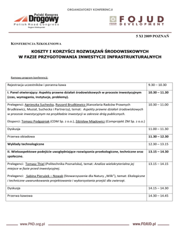 ORGANIZATORZY KONFERENCJI 5 XI 2009 POZNAŃ KONFERENCJA SZKOLENIOWA KOSZTY I KORZYŚCI ROZWIĄZAŃ ŚRODOWISKOWYCH W FAZIE PRZYGOTOWANIA INWESTYCJI INFRASTRUKTURALNYCH Ramowy program konferencji: Rejestracja uczestników i poranna kawa 9.30 – 10.30 I. Panel otwierający: Aspekty prawne działań środowiskowych w procesie inwestycyjnym (czas, wymagania, instytucje, problemy). 10.30 – 11.30 Prelegenci: Agnieszka Suchecka, Ryszard Brudkiewicz (Kancelaria Radców Prawnych Brudkiewicz, Musiał, Suchecka i Partnerzy), temat: Aspekty prawne działań środowiskowych w procesie inwestycyjnym na przykładzie inwestycji w zakresie dróg publicznych. 10.30 – 11.00 Eksperci: Tomasz Podgajniak (CDM Sp. z o.o.), Zdzisław Miądowicz (Comprojekt ZM Sp. z o.o.) Dyskusja 11.00 – 11.30 Przerwa obiadowa 11.30 – 12.30 Wykłady technologiczne 12.30 – 13.15 II. Wieloaspektowe podejście uwzględniające rozwiązania proekologiczne, techniczne oraz społeczne. 13.15 – 14.30 Prelegenci: Tomasz Thiel (Politechnika Poznańska), temat: Analiza wielokryterialna jej miejsce w fazie przed inwestycyjnej. 13.15 – 14.15 Prelegenci: Sabina Pierużek – Nowak (Stowarzyszenie dla Natury „Wilk”), temat: Ekologiczne i techniczne uwarunkowania projektowania i wykorzystania przejść dla zwierząt. Dyskusja 14.15 – 14.30 Przerwa kawowa 14.30 – 14.45 ORGANIZATORZY KONFERENCJI III. Drogowe budownictwo proekologiczne – wspólna odpowiedzialność. 14.45 – 16.00 Prelegenci: Rafał Kurek (Stowarzyszenie Pracownia na Rzecz Wszystkich Żywych Istot), temat: Rola i znaczenie międzysektorowej współpracy na przykładzie ochrony korytarzy ekologicznych przy drogach. 14.45 – 15.15 Eksperci: Jolanta Ratajczak (Regionalny Dyrektor Ochrony Środowiska w Poznaniu), Artur Fojud (Fojud Sp. z o.o.). Dyskusja podsumowująca 15.15 – 15.45 Zakończenie konferencji oraz wręczenie certyfikatów 15.45 – 16.00 Bankiet 19.00 - 21.00 Organizatorzy zastrzegają, że program może ulec zmianie. Patronat medialny: Patronat honorowy: Partnerzy Prezydent Miasta Poznania Regionalny Dyrektor Ochrony Środowiska w Poznaniu Więcej informacji pod adresem: Polski Kongres Drogowy Ul. Jagiellońska 80, 03 – 301 Warszawa [email protected] Fojud Development Sp. z o.o. Ul. 28 Czerwca 1956 nr 398, 61 – 441 Poznań Tel. (061) 668 68 03 ORGANIZATORZY KONFERENCJI PRELEGENCI I EKSPERCI KONFERENCJI: Agnieszka Suchecka, Prawnych Brudkiewicz, partnerzy Kancelaria Radców Musiał, Suchecka i Jest członkiem Ogólnopolskiego Stowarzyszenia Konsultantów Zamówień Publicznych. Doświadczenie zawodowe zdobywała pracując, a następnie współtworząc kancelarię adwokacką w Poznaniu. Agnieszka Suchecka specjalizuje się w prawie zamówień publicznych, procesach inwestycyjnych, w tym w zakresie projektowania ze szczególnym uwzględnieniem infrastruktury kolejowej, a także prawie handlowym. Ryszard Brudkiewicz, Kancelaria Radców Prawnych Brudkiewicz, Musiał, Suchecka i partnerzy Specjalizuje się w obsłudze procesów inwestycyjnych, w szczególności z zakresu obrotu nieruchomościami oraz w przekształceniach i połączeniach podmiotów gospodarczej. Sprawował funkcję członka rady nadzorczej spółki skarbu państwa z branży wydobywczej. W 2007 roku został mianowany Sędzią sądu polubownego przy Krajowym Depozycie Papierów Wartościowych S.A. Tomasz Podgajniak, Wiceprezes Zarządu CDM Sp. z o.o. Tomasz Podgajniak to uznany ekspert w zakresie ochrony środowiska i zrównoważonego rozwoju specjalizującym się w dziedzinach analiz ryzyka, ocen oddziaływania na środowisko, monitoringu środowiska, zintegrowanego zapobiegania zanieczyszczeniom i systemów zarządzania środowiskowego. Posiada bogate doświadczenie w realizacji kompleksowych projektów i ekspertyz z pogranicza techniki, prawa, ekonomii i zarządzania na potrzeby przemysłu, administracji samorządowej i lokalnych społeczności oraz administracji rządowej, również we współpracy międzynarodowej w kraju i za granicą. Od początku lat 90-ych był zaangażowany w rozwój krajowego prawodawstwa w zakresie ochrony środowiska z uwzględnieniem wprowadzania acquis communitare Unii Europejskiej. Karierę zawodową rozpoczął w 1981r. w Państwowej Inspekcji Ochrony Środowiska. W latach 1989-2003 były Wiceprezesem Zarządu Narodowej Fundacji Ochrony Środowiska, a w okresie 2003-2005 pełnił kolejno funkcję podsekretarza i sekretarza stanu w Ministerstwie Środowiska, a następnie Ministra Środowiska. Od 2006r. Wiceprezes Zarządu firmy konsultingowej CDM Sp. z o.o (dawniej Proeko CDM). Jest autorem lub współautorem kilkudziesięciu publikacji z zakresu ocen oddziaływania na środowisko, jakości środowiska w Polsce, pozwoleń zintegrowanych, porównawczych ocen ryzyka, praktycznych metodom realizacji zasady zrównoważonego i trwałego rozwoju. Zdzisław Miądowicz, Comprojekt ZM Sp. z o.o. Doktor nauk technicznych, ekspert i doradca. Posiada szerokie uprawnienia, należą do nich min.: Uprawnienia Biegłego Wojewody Wielkopolskiego w zakresie sporządzania ocen oddziaływania na środowisko oraz Uprawnienia Biegłego i Rzeczoznawcy Ministra Środowiska, Zasobów Naturalnych i Leśnictwa. Przez większą część życia zaangażowany w działalność naukową. Przez wiele lat był pracownikiem naukowo-dydaktycznym na Politechnice Poznańskiej. Do jego dorobku naukowego należy wliczyć min. autorski program nauczania informatyki. Obecnie prowadzi firmę, która zajmuje się wspomaganiem przedsięwzięć inwestycyjnych w zakresie ochrony środowiska. Rafał Kurek, Stowarzyszenie Pracownia na Rzecz Wszystkich Żywych Istot Członek zarządu Stowarzyszenia Pracownia na rzecz Wszystkiej Istot, magister i doktorant biologii specjalizujący się w badaniu korytarzy ekologicznych, fragmentacji środowiska przez infrastrukturę liniową i wpływie dróg oraz linii kolejowych na populacje dziko żyjących zwierząt. Autor kilkudziesięciu opracowań specjal