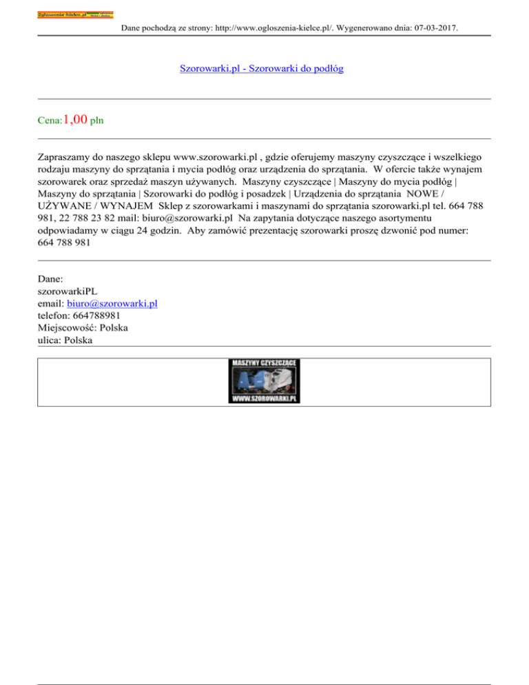 Dane pochodzą ze strony: http://www.ogloszenia-kielce.pl/. Wygenerowano dnia: 07-03-2017. Szorowarki.pl - Szorowarki do podłóg Cena:1,00 pln Zapraszamy do naszego sklepu www.szorowarki.pl , gdzie oferujemy maszyny czyszczące i wszelkiego rodzaju maszyny do sprzątania i mycia podłóg oraz urządzenia do sprzątania. W ofercie także wynajem szorowarek oraz sprzedaż maszyn używanych. Maszyny czyszczące | Maszyny do mycia podłóg | Maszyny do sprzątania | Szorowarki do podłóg i posadzek | Urządzenia do sprzątania NOWE / UŻYWANE / WYNAJEM Sklep z szorowarkami i maszynami do sprzątania szorowarki.pl tel. 664 788 981, 22 788 23 82 mail: [email protected] Na zapytania dotyczące naszego asortymentu odpowiadamy w ciągu 24 godzin. Aby zamówić prezentację szorowarki proszę dzwonić pod numer: 664 788 981 Dane: szorowarkiPL email: [email protected] telefon: 664788981 Miejscowość: Polska ulica: Polska