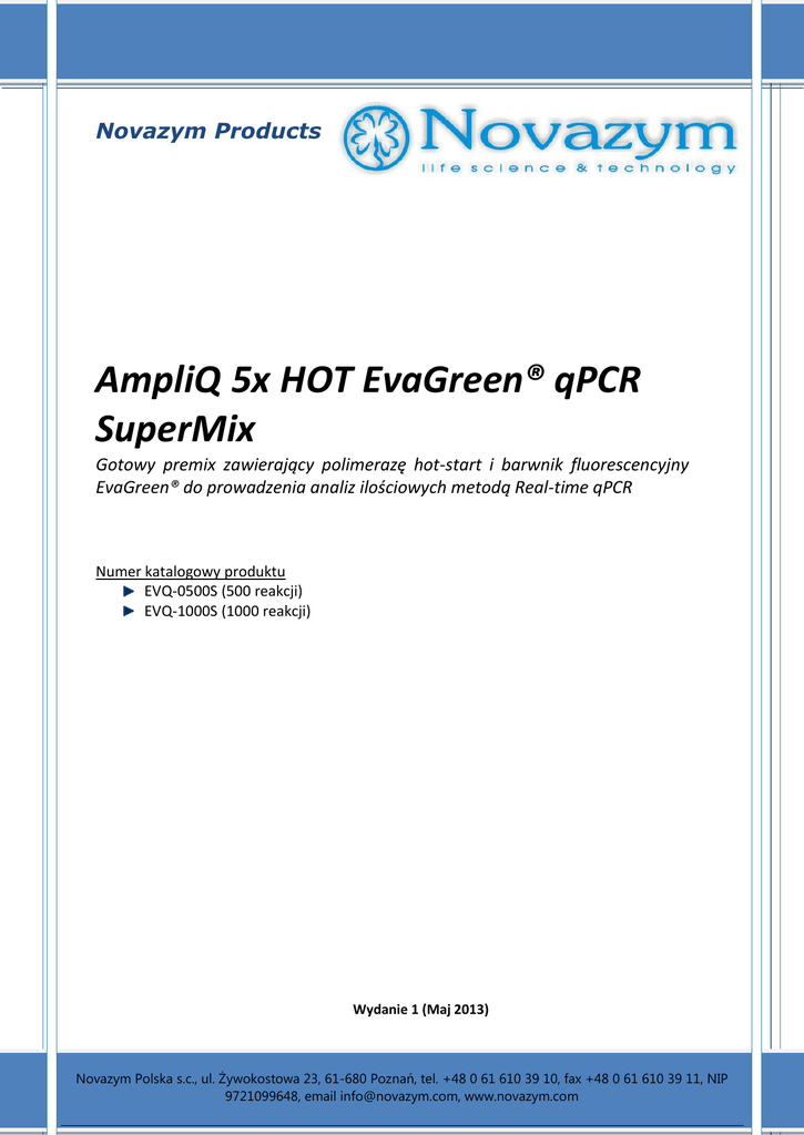 AmpliQ 5x HOT EvaGreen® qPCR SuperMix Novazym Products Novazym Polska ul. Żywokostowa 23, 61-680 Poznań, tel. +48 0 61 610 39 10, 39 11, email [email protected] fax +48 0 61 610 AmpliQ 5x HOT EvaGreen® qPCR SuperMix Gotowy premix zawierający polimerazę hot-start i barwnik fluorescencyjny EvaGreen® do prowadzenia analiz ilościowych metodą Real-time qPCR Numer katalogowy produktu EVQ-0500S (500 reakcji) EVQ-1000S (1000 reakcji) Wydanie 1 (Maj 2013) Novazym Polska s.c., ul. Żywokostowa 23, 61-680 Poznań, tel. +48 0 61 610 39 10, fax +48 0 61 610 39 11, NIP 9721099648, email [email protected], www.novazym.com AmpliQ 5x HOT EvaGreen® qPCR SuperMix 1. Przeznaczenie Premix przeznaczony jest do prowadzenia ilościowych reakcji PCR z analizą ilości produktu w czasie rzeczywistym (ang. Real-time PCR). W Real-time PCR wykorzystuje się barwniki fluorescencyjne lub sondy molekularne w celu monitorowania przyrostu ilości produktu amplifikacji, w każdym cyklu reakcji, w czasie rzeczywistym. Dzięki temu cała procedura analizy jest bardzo szybka i pozwala wyeliminować etap rozdziału i oceny produktu po zakończeniu reakcji. Umożliwia ona także wgląd w kinetykę reakcji, a co za tym idzie pozwala na oszacowanie ilości DNA w matrycy podanej do reakcji, co jest niemożliwe w konwencjonalnej reakcji PCR. Ponadto ryzyko zanieczyszczenia badanej próby jest minimalizowane dzięki temu, że reakcja i detekcja produktu odbywa się w jednym zamkniętym naczyniu. AmpliQ 5x HOT EvaGreen® qPCR SuperMix jest gotową do użycia mieszaniną do prowadzenia analiz qPCR. Premix zawiera wszystkie niezbędne komponenty reakcji, czyli: polimerazę hot-start, mieszaninę ultra czystych dNTPs [10 pmol/µl], MgCl2 oraz wiążący się do dsDNA barwnik EvaGreen®. Aby przygotować reakcję, należy do premixu dodać wodę, startery oraz matrycę DNA. Polimeraza hot-start jest aktywowana przez 12-minutową inkubację w 95 °C. Ta właściwość uniemożliwia wydłużanie starterów, które hybrydyzują do matrycy w miejscach niespecyficznych oraz zapobiega powstawaniu dimerów starterów w niskiej temperaturze podczas reakcji qPCR. EvaGreen® jest barwnikiem fluorescencyjnym nowej generacji, który wiąże się ilościowo do dwuniciowego DNA. W przypadku braku dsDNA fluorescencja pozostaje na bardzo niskim poziomie (1-4 % false positive). Zakres widma barwnika EvaGreen® jest podobny do barwnika SYBR® Green, jednak może stanowić lepszą alternatywę do analiz qPCR ze względu na kilka cech tj. wysoka stabilność, nie inhibuje reakcji PCR oraz udowodniono, że nie jest mutagenny ani cytotoksyczny. EvaGreen® jest kompatybilny z większością dostępnych platform do analiz Real-time PCR, po ustawieniu tych samych parametrów, jak dla SYBR® Green lub FAM. EvaGreen® jest zarejestrowanym znakiem towarowym firmy BIOTUM, INC. Szeroka kompatybilność z aparatami do Real-time PCR (niezależnie od wymagań barwnika ROX): Applied BioSystems: QuantStudio™ 12K Flex, ViiA™ 7, 7900HT, 7500, 7700, StepOneTM & StepOnePlusTM Stratagene: MX3000PTM , MX3005PTM Bio-Rad: CFX96™ & CFX384™, iQ™5 & MyiQ™, Chromo4™, Opticon® 2 & MiniOpticon® Qiagen: Rotor-Gene® Q, Rotor-Gene® 6000 Eppendorf: Mastercycler®: ep realplex2 & ep realplex4 Illumina: The Eco™ Roche: LightCycler® 480 AmpliQ 5x HOT EvaGreen® qPCR SuperMix może być z powodzeniem wykorzystywany w następujących aplikacjach: analiza jakościowa i ilościowa materiału genetycznego DNA i cDNA profilowanie ekspresji genów detekcja mikrobiologiczna określanie obciążeń wirusowych. 2 AmpliQ 5x HOT EvaGreen® qPCR SuperMix Korzyści ze stosowania AmpliQ 5x HOT EvaGreen® qPCR SuperMix: bardzo specyficzne i powtarzalne analizy Real-time PCR doskonała wydajność reakcji w przypadku małej ilości materiału możliwość traktowania próbek UNG, dzięki obecności mieszaniny dUTP/dTTP doskonała wydajność reakcji na matrycach długich (>500pz) oraz bogatych w pary GC niebieski barwnik w premixie ułatwia pipetowanie 2. Zasada działania testu W reakcji Real-time PCR analizowany jest przyrost ilości produktu w czasie rzeczywistym. Przyrost ilości kopii badanej cząsteczki kwasu nukleinowego jest monitorowany w każdym cyklu reakcji amplifikacji. W technice Real-time PCR wyznacznikiem początkowej ilości matrycy DNA w reakcji jest ilość cykli (CT), po których kinetyka reakcji wchodzi w fazę logarytmicznego wzrostu. Ilość produktu w reakcji PCR wzrasta wykładniczo z każdym cyklem, aż do momentu, wyczerpania się któregoś z komponentów reakcji. Zawartość zestawu Lp. [1] KOLOR Pomarańczowy [2] [3] Żółty Biały ELEMENT AmpliQ 5x HOT EvaGreen® qPCR SuperMix MgCl2 [25 mM] H2O MQ do reakcji PCR 500 reakcji 1 1 1 1000 reakcji 4 1 1 Skład mieszaniny AmpliQ 5x HOT EvaGreen® qPCR SuperMix Polimeraza DNA hot-start Bufor reakcyjny 5x EvaGreen® qPCR buffer MgCl2 12.5 mM Mix dNTPs zawierający mieszaninę dUTP/dTTP Barwnik EvaGreen® Wewnętrzny barwnik referencyjny na bazie ROX GC-enhancer Niebieski barwnik wizualizacyjny Przechowywanie -20 °C Chronić przed światłem Unikać wielokrotnego zamrażania i rozmrażania. 3 AmpliQ 5x HOT EvaGreen® qPCR SuperMix 3. Przeprowadzenie testu PCR Zalecany program reakcji Real-time qPCR Etap reakcji Denaturacja wstępna Amplifikacja Krzywa topnienia Chłodzenie 1) Metoda analizy Ilość cykli Temperatura Czas - 1 95 °C 12 min Pomiar fluoresce ncji - Quantification 40 denaturacja hybrydyzacja 95 °C 60 - 65 °C 15 s (1) 20-30 s - elongacja denaturacja hybrydyzacja elongacja 72 °C 90 °C 75 °C 95 °C slope = 0,1 °C/s 40 °C (2) Melting - 1 1 (1) 20-30 s 15 s 15 s 0s single continuo us 30 s Należy zastosować czas 20 sek do amplifikacji matryc o długości < 150 pz Przygotowanie mieszaniny reakcyjnej SKŁADNIK AmpliQ 5x HOT EvaGreen® (2) qPCR SuperMix [5x] OBJĘTOŚĆ STĘŻENIE KOŃCOWE 4 µl [1x] [2] Starter forward [10 pmol/µl] 0,2 – 0,4 µl [100 – 200 nM] [3] Starter reverse [10 p
