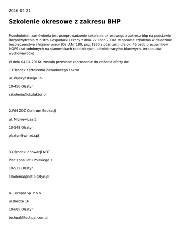 2016-04-21 Szkolenie okresowe z zakresu BHP Przedmiotem zamówienia jest przeprowadzenie szkolenia okresowego z zakresu bhp na podstawie Rozporządzenia Ministra Gospodarki i Pracy z dnia 27 lipca 2004r. w sprawie szkolenia w dziedzinie bezpieczeństwa i higieny pracy (Dz.U.Nr 180, poz.1860 z póżn zm.) dla ok. 46 osób pracowników MOPS (zatrudnionych na stanowiskach robotniczych, administracyjno-biurowych, terapeutów, wychowawców) W dniu 04.04.2016r. zostało przesłane zaproszenie do złożenia oferty do: 1.Ośrodek Kształcenia Zawodowego Faktor ul. Wyszyńskiego 15 10-456 Olsztyn [email protected] 2.WM ZDZ Centrum Edukacji ul. Mickiewicza 5 10-548 Olsztyn [email protected] 3.Ośrodek Innowacji NOT Plac Konsulatu Polskiego 1 10-532 Olsztyn [email protected] 4. Techpal Sp. z o.o. ul.Barcza 16 10-685 Olsztyn [email protected]