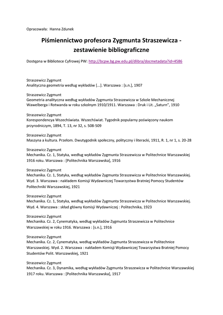 Opracowała: Hanna Zdunek Piśmiennictwo profesora Zygmunta Straszewicza zestawienie bibliograficzne Dostępna w Bibliotece Cyfrowej PW: http://bcpw.bg.pw.edu.pl/dlibra/docmetadata?id=4586 Straszewicz Zygmunt Analityczna geometria według wykładów [...]. Warszawa : [s.n.], 1907 Straszewicz Zygmunt Geometria analityczna według wykładów Zygmunta Straszewicza w Szkole Mechanicznej Wawelberga i Rotwanda w roku szkolnym 1910/1911. Warszawa : Druk i Lit. „Saturn”, 1910 Straszewicz Zygmunt Korespondencya Wszechświata. Wszechświat. Tygodnik popularny poświęcony naukom przyrodniczym, 1894, T. 13, nr 32, s. 508-509 Straszewicz Zygmunt Maszyna a kultura. Przełom. Dwutygodnik społeczny, polityczny i literacki, 1911, R. 1, nr 1, s. 20-28 Straszewicz Zygmunt Mechanika. Cz. 1, Statyka, według wykładów Zygmunta Straszewicza w Politechnice Warszawskiej 1916 roku. Warszawa : [Politechnika Warszawska], 1916 Straszewicz Zygmunt Mechanika. Cz. 1, Statyka, według wykładów Zygmunta Straszewicza w Politechnice Warszawskiej. Wyd. 3. Warszawa : nakładem Komisji Wydawniczej Towarzystwa Bratniej Pomocy Studentów Politechniki Warszawskiej, 1921 Straszewicz Zygmunt Mechanika. Cz. 1, Statyka, według wykładów Zygmunta Straszewicza w Politechnice Warszawskiej. Wyd. 4. Warszawa : skład główny Komisji Wydawniczej : Politechnika, 1923 Straszewicz Zygmunt Mechanika. Cz. 2, Cynematyka, według wykładów Zygmunta Straszewicza w Politechnice Warszawskiej w roku 1916. Warszawa : [s.n.], 1916 Straszewicz Zygmunt Mechanika. Cz. 2, Cynematyka, według wykładów Zygmunta Straszewicza w Politechnice Warszawskiej. Wyd. 2. Warszawa : nakładem Komisji Wydawniczej Towarzystwa Bratniej Pomocy Studentów Polit. Warszawskiej, 1921 Straszewicz Zygmunt Mechanika. Cz. 3, Dynamika, według wykładów Zygmunta Straszewicza w Politechnice Warszawskiej 1917 roku. Warszawa : [Politechnika Warszawska], 1917 Straszewicz Zygmunt Mechanika : wykład przystępny opracowany według Roberta S. Balla. Warszawa : nakładem Spółki Wydawniczej Warszawskiej : skład główny w Księgarni E. Wendego i S-ki (T. Hiża i A. Turkuła), 1912 Biblioteka Popularna Nauk Stosowanych Straszewicz Zygmunt Mechanika : wykład przystępny opracowany według Roberta S. Balla. Wyd. 2. Warszawa : Spółka Akcyjna Polska Składnica Pomocy Szkolnych, 1922 Straszewicz Zygmunt Motory i maszyny unipolarne. Przegląd Techniczny, 1905, nr 12, s. 143-145 Straszewicz Zygmunt Nauka o ruchu (cynematyka i dynamika) z licznymi przykładami. Warszawa : skład główny w Księgarni Gebethnera i Wolffa, 1918 Straszewicz Zygmunt Nauka o ruchu (cynematyka i dynamika) z licznemi przykładami. Wyd. 2. Lwów ; Warszawa : Wydawnictwo Zakładu Narodowego im. Ossolińskich, 1923 Straszewicz Zygmunt O doświadczeniu w mechanice. Wektor. Czasopismo matematyczno-fizyczne, 1912, R. 2, nr 4, s. 189192 Straszewicz Zygmunt O elektrycznem przenoszeniu energii. Wszechświat. Tygodnik popularny poświęcony naukom przyrodniczym, 1893, T. 12, nr 48, s. 753-757 ; nr 49, s. 772-778 ; nr 50, s. 792-796 Straszewicz Zygmunt O przyspieszeniu Coriolisa. Wektor. Czasopismo matematyczno-fizyczne, 1912, R. 2, nr 10, s. 574-578 Straszewicz Zygmunt Oświetlenie elektryczne Warszawy. Kurjer Warszawski, 1893, nr 134, 135, 136, 139, 144 Straszewicz Zygmunt Oznaczenie pracy niezbędnej do utrzymania ciał w powietrzu. Przegląd Techniczny, 1904, T. 42, nr 43, s. 587-588 Straszewicz Zygmunt Paradoksy fizyczne. Wektor. Czasopismo matematyczno-fizyczne, 1912, R. 2, nr 1, s. 35-36 Straszewicz Zygmunt Początki geometrji. Warszawa : Polska Składnica Pomocy Szkolnych : (Druk L. Bogusławskiego), 1921 Straszewicz Zygmunt Podatek dochodowy i podatek spożywczy w przemyśle. Przegląd Techniczny, 1911, nr 21, s. 269-271 Straszewicz Zygmunt Pole prędkości. Wektor. Czasopismo matematyczno-fizyczne, 1911, R. 1, nr 2, s. 100-108 Straszewicz Zygmunt Przypływy i odpływy morskie. Wszechświat. Tygodnik popularny poświęcony naukom przyrodniczym, 1894, T. 13, nr 23, s. 353-357 Straszewicz Zygmunt Rachunek różniczkowy i całkowy według wykładów Z. Straszewicza w Szkole MechanicznoTechnicznej Wawelberga i Rotwanda w roku szkolnym 1906/7. Wyd. nowe przejrz. i popr. Warszawa : Drukarnia "Saturn”, 1907 z dodatkiem Zadania z rachunku różniczkowego i całkowego Straszewicz Zygmunt Rachunek różniczkowy i całkowy według wykładów Z. Straszewicza w Szkole MechanicznoTechnicznej Wawelberga i Rotwanda w roku szkolnym 1906/7. Warszawa : na składzie w Państwowej Szkole Budowy Maszyn i Elektroniki im. H. Wawelberga i S. Rotwanda, 1920 Straszewicz Zygmunt Rozwiązania zadań z cynematyki. Warszawa : [s.n.], 1922 Straszewicz Zygmunt Rozwiązania zadań z cynematyki ze zbiorku prof. Straszewicza. Warszawa : Drukarnia i Litografja „Saturn”, 1924 Straszewicz Zygmunt Rozwiązania zadań z mechaniki. Statyka. Warszawa : Politechnika Warszawska, 1916 Straszewicz Zygmunt Sposoby mierzenia wilgotności pary. Przegląd Techniczny, 1902, nr 43, s. 524-526 ; nr 45, s. 548-550 Straszewicz Zygmunt Spór o wielkość pracy mechanicznej, niezbędnej do utrzymywania ciał w powietrzu. Przegląd Techniczny, 1905, nr 26, s. 324 Straszewicz Zygmunt Statyka wykreślna : według wykładów prof. Z. Straszewicza w sem. zimowym 1923/23 r. akad. Warszawa : skład główny Komisji Wydawniczej : Politechnika, 1923 Straszewicz Zygmunt Szkic propedeutyki gieometrji. Wektor. Czasopismo matematyczno-fizyczne, 1912, nr 9, s. 514-524 Straszewicz Zygmunt Szkolnictwo wobec zagadnienia pracy. W: Naukowa organizacja pracy. Pierwszy Zjazd Polski 1924. Warszawa : Nakładem Komitetu Wykonawczego Zrzeszeń Naukowej Organizacji Pracy w Polsce, 1925, s. 85-90 Straszewicz Zygmunt Środek ciężkości : rozdział geometryi elementarnej. Warszawa : Wydawnictwo Stanisława Rotwanda : skład główny w Szkole Technicznej H. Wawelberga i S. Rotwanda, 1908 Straszewicz Zygmunt Światło elektryczne. Urządzenie i działanie instalacyj prywatnych o pr