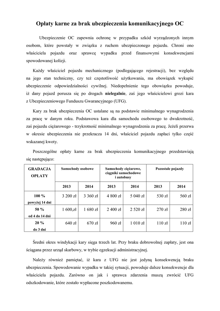 Opłaty karne za brak ubezpieczenia komunikacyjnego OC Ubezpieczenie OC zapewnia ochronę w przypadku szkód wyrządzonych innym osobom, które powstały w związku z ruchem ubezpieczonego pojazdu. Chroni ono właściciela pojazdu oraz sprawcę wypadku przed finansowymi konsekwencjami spowodowanej kolizji. Każdy właściciel pojazdu mechanicznego (podlegającego rejestracji), bez względu na jego stan techniczny, czy też częstotliwość użytkowania, ma obowiązek wykupić ubezpieczenie odpowiedzialności cywilnej. Niedopełnienie tego obowiązku powoduje, iż dany pojazd porusza się po drogach nielegalnie, zaś jego właścicielowi grozi kara z Ubezpieczeniowego Funduszu Gwarancyjnego (UFG). Kary za brak ubezpieczenia OC ustalane są na podstawie minimalnego wynagrodzenia za pracę w danym roku. Podstawowa kara dla samochodu osobowego to dwukrotność, zaś pojazdu ciężarowego - trzykrotność minimalnego wynagrodzenia za pracę. Jeżeli przerwa w okresie ubezpieczenia nie przekracza 14 dni, właściciel pojazdu zapłaci tylko część wskazanej kwoty. Poszczególne opłaty karne za brak ubezpieczenia komunikacyjnego przedstawiają się następująco: GRADACJA Samochody osobowe OPŁATY 2013 100 % 2014 Samochody ciężarowe, ciągniki samochodowe i autobusy 2013 2014 Pozostałe pojazdy 2013 2014 3 200 zł 3 360 zł 4 800 zł 5 040 zł 530 zł 560 zł 1 600,zł 1 680 zł 2 400 zł 2 520 zł 270 zł 280 zł 640 zł 670 zł 960 zł 1 010 zł 110 zł 110 zł powyżej 14 dni 50 % od 4 do 14 dni 20 % do 3 dni Średni okres windykacji kary sięga trzech lat. Przy braku dobrowolnej zapłaty, jest ona ściągana przez urząd skarbowy, w trybie egzekucji administracyjnej. Należy również pamiętać, iż kara z UFG nie jest jedyną konsekwencją braku ubezpieczenia. Spowodowanie wypadku w takiej sytuacji, powoduje dalsze konsekwencje dla właściciela pojazdu. Zarówno on jak i sprawca zdarzenia muszą zwrócić UFG odszkodowanie, które zostało wypłacone poszkodowanemu.