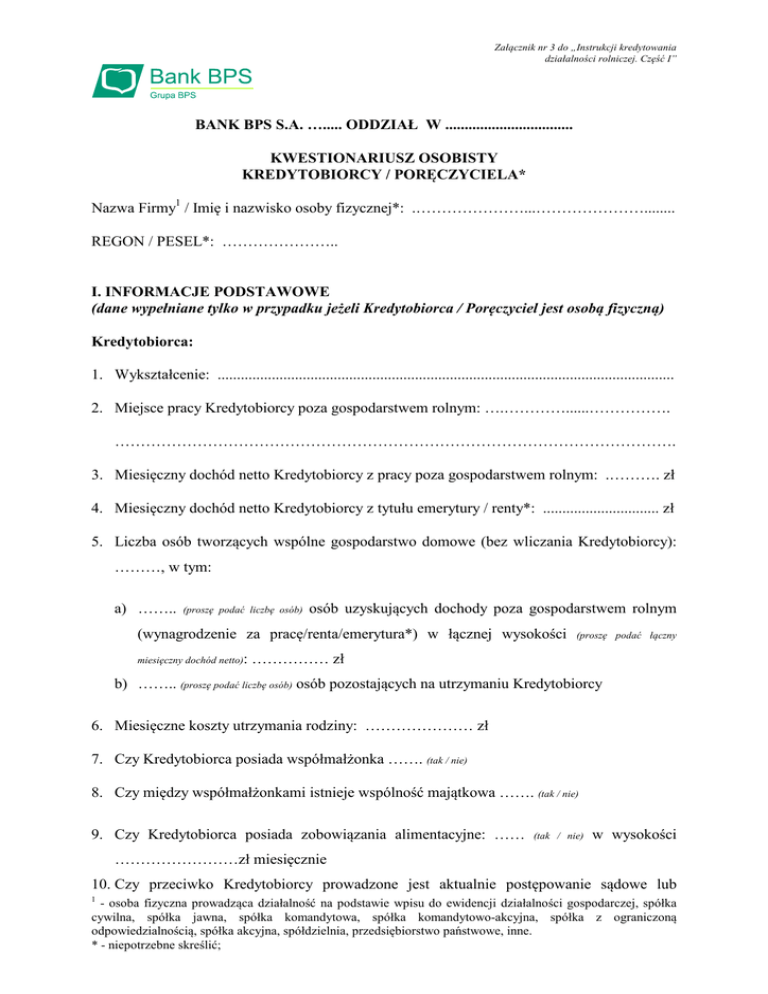 Załącznik nr 3 do „Instrukcji kredytowania działalności rolniczej. Część I” BANK BPS S.A. …..... ODDZIAŁ W ................................. KWESTIONARIUSZ OSOBISTY KREDYTOBIORCY / PORĘCZYCIELA* Nazwa Firmy1 / Imię i nazwisko osoby fizycznej*: .…………………...…………………........ REGON / PESEL*: ………………….. I. INFORMACJE PODSTAWOWE (dane wypełniane tylko w przypadku jeżeli Kredytobiorca / Poręczyciel jest osobą fizyczną) Kredytobiorca: 1. Wykształcenie: ...................................................................................................................... 2. Miejsce pracy Kredytobiorcy poza gospodarstwem rolnym: ….…………......……………. ………………………………………………………………………………………………. 3. Miesięczny dochód netto Kredytobiorcy z pracy poza gospodarstwem rolnym: .………. zł 4. Miesięczny dochód netto Kredytobiorcy z tytułu emerytury / renty*: .............................. zł 5. Liczba osób tworzących wspólne gospodarstwo domowe (bez wliczania Kredytobiorcy): ………, w tym: a) …….. (proszę podać liczbę osób) osób uzyskujących dochody poza gospodarstwem rolnym (wynagrodzenie za pracę/renta/emerytura*) w łącznej wysokości miesięczny dochód netto): (proszę podać łączny …………… zł b) …….. (proszę podać liczbę osób) osób pozostających na utrzymaniu Kredytobiorcy 6. Miesięczne koszty utrzymania rodziny: ………………… zł 7. Czy Kredytobiorca posiada współmałżonka ……. (tak / nie) 8. Czy między współmałżonkami istnieje wspólność majątkowa ……. (tak / nie) 9. Czy Kredytobiorca posiada zobowiązania alimentacyjne: …… (tak / nie) w wysokości ……………………zł miesięcznie 10. Czy przeciwko Kredytobiorcy prowadzone jest aktualnie postępowanie sądowe lub 1 - osoba fizyczna prowadząca działalność na podstawie wpisu do ewidencji działalności gospodarczej, spółka cywilna, spółka jawna, spółka komandytowa, spółka komandytowo-akcyjna, spółka z ograniczoną odpowiedzialnością, spółka akcyjna, spółdzielnia, przedsiębiorstwo państwowe, inne. * - niepotrzebne skreślić; egzekucyjne: ………… (tak / nie). Jeżeli tak, proszę podać z jakiego tytułu: ...…………………………………………………………………………………………….. Współmałżonek Kredytobiorcy (dane wypełniane tylko w przypadku gdy między współmałżonkami istnieje wspólność majątkowa): 1. Imię i nazwisko: …..……………………………………………………………………... 2. Adres zamieszkania: ……………………………………………………………………... 3. Seria i nr dowodu tożsamości: ………………………... 4. PESEL: ………………………... II. CHARAKTERYSTYKA GOSPODARSTWA ROLNEGO (Poręczyciel nie prowadzący gospodarstwa rolnego wypełnia jedynie punkty 2, 3, 6, 7, 8 w części dotyczącej „Stanu majątkowego” oraz wszystkie punkty w części dotyczącej „Zewnętrznych źródeł finansowania”) Liczba osób zatrudnionych w gospodarstwie rolnym: ………, w tym sezonowo: ……….. Stan majątkowy: 1. Grunty w gospodarstwie - powierzchnia (ha): Wyszczególnienie Grunty własne Grunty dzierżawione Razem (ha) Grunty orne Trwałe użytki zielone Plantacje wieloletnie Grunty pod zabudowę Razem użytki rolne Las i parki Stawy i jeziora Pozostałe grunty OGÓŁEM (ha) Wartość szacunkowa w zł. 2. Użytkowane grunty wg klas bonitacyjnych (w ha): Grunty Wartość Klasa bonitacyjna własne rynkowa zł. ilość (ha) I II IIIa IIIb IVa * niepotrzebne skreślić 2 Grunty dzierżawione ilość (ha) Wartość rynkowa zł. IVb V VI Trwałe użytki zielone Tereny pod zabudowaniami Pozostałe grunty Razem: Użytkowe grunty łącznie 3. Nieruchomości stanowiące własność Kredytobiorcy niewchodzące w skład gospodarstwa rolnego): Rodzaj nieruchomości (działka gruntu – powierzchnia, działka zabudowana – opis jakie budynki znajdują się na działce i ich powierzchnia użytkowa; numer księgi wieczystej prowadzonej dla nieruchomości; nazwa sądu prowadzącego KW) * niepotrzebne skreślić Szacunkowa wartość nieruchomości (w zł; informacja na jakiej podstawie określono wartość nieruchomości – wycena, faktura, polisa, itp.) 3 (również nieruchomości Czy nieruchomość jest obciążona? Czy nieruchomość jest ubezpieczona? (nie / tak; na czyją rzecz jest obciążona? wysokość obciążenia w zł) (tak / nie; na jaką sumę jest ubezpieczona? do kiedy ważne jest ubezpieczenie?) 4. Maszyny, urządzenia i środki transportu stanowiące własność Kredytobiorcy, również ruchomości nie wchodzące w skład gospodarstwa rolnego (np. prywatny samochód) oraz użytkowane przez Kredytobiorcę (np. na podstawie umowy leasingu, dzierżawy, itp.): Rodzaj ruchomości (nazwa ruchomości; rok produkcji; czy ruchomość stanowi własność Kredytobiorcy? tak / nie) * niepotrzebne skreślić Szacunkowa wartość ruchomości Czy ruchomość jest obciążona? (w zł; informacja na jakiej podstawie określono wartość ruchomości – wycena, faktura, polisa, itp.) (nie / tak; na czyją rzecz jest obciążona) 4 Czy nieruchomość jest ubezpieczona? (tak / nie; na jaką sumę jest ubezpieczona? do kiedy ważne jest ubezpieczenie?) 5. Posiadany inwentarz żywy: Nazwa Ilość sztuk ogółem 1 2 Ilość sztuk przeznaczona do zbycia lub zużycia w ciągu najbliższego roku (stado podstawowe) 3 Bydło ogółem, w tym: a) cielęta (do 1 roku) b) byczki (1-2 lata) c) jałówki (1-2 lata) d) byki (pow. 2 lat) e) jałówki (pow. 2 lat) f) krowy mleczne g) ………………………... Trzoda chlewna ogółem, w tym: a) prosięta (do 20 kg) b) lochy hodowlane c) pozostała trzoda chlewna Drób ogółem, w tym: a) brojlery kurze b) kury nioski c) pozostały drób Inne, w tym: a) owce b) k