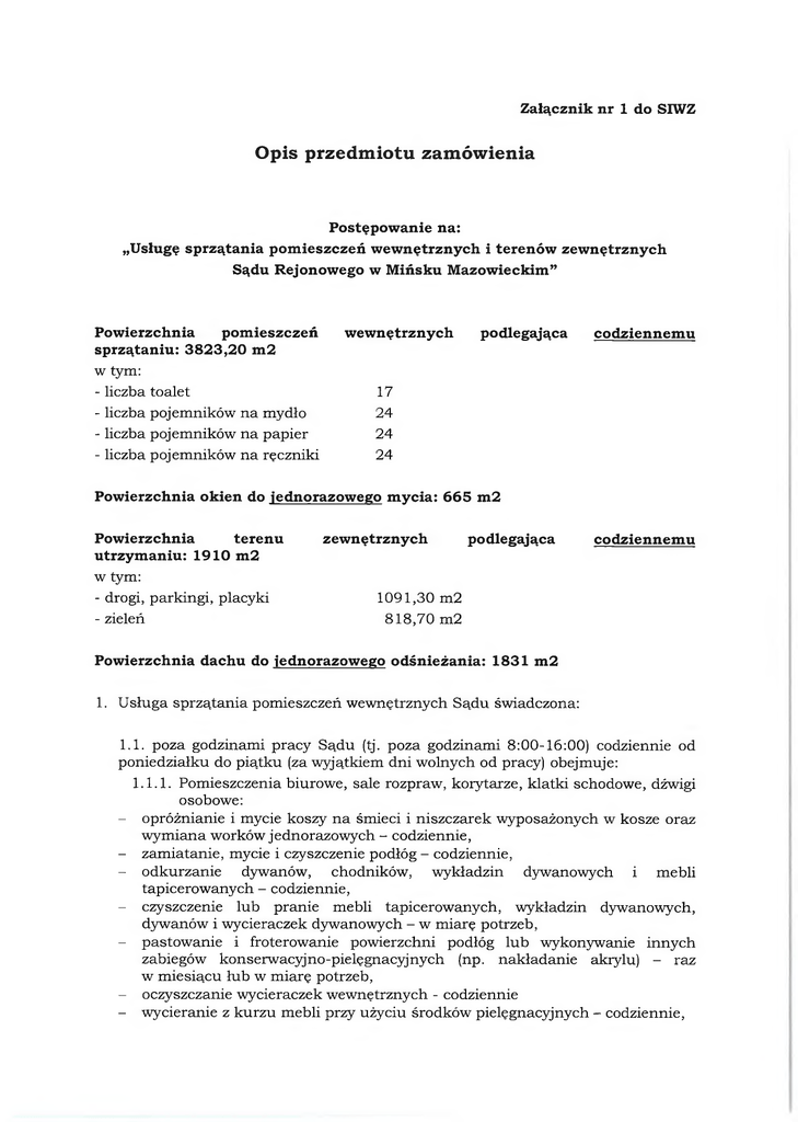 Załącznik nr 1 do SIWZ Opis przedmiotu zamówienia Postępowanie na: „Usługę sprzątania pomieszczeń wewnętrznych i terenów zewnętrznych Sądu Rejonowego w Mińsku Mazowieckim” Powierzchnia pomieszczeń sprzątaniu: 3823,20 m2 wewnętrznych podlegająca codziennemu w tym: - liczba toalet 17 - liczba pojemników na mydło 24 - liczba pojemników na papier 24 - liczba pojemników na ręczniki 24 Powierzchnia okien do jednorazowego mycia: 665 m2 Powierzchnia terenu utrzymaniu: 1910 m2 zewnętrznych podlegająca codziennemu w tym: - drogi, parkingi, placyki -zieleń 1091,30 m2 818,70 m2 Powierzchnia dachu do jednorazowego odśnieżania: 1831 m2 1. Usługa sprzątania pomieszczeń wewnętrznych Sądu świadczona: 1.1. poza godzinami pracy Sądu (tj. poza godzinami 8:00-16:00) codziennie od poniedziałku do piątku (za wyjątkiem dni wolnych od pracy) obejmuje: - - 1.1.1. Pomieszczenia biurowe, sale rozpraw, korytarze, klatki schodowe, dźwigi osobowe: opróżnianie i mycie koszy na śmieci i niszczarek wyposażonych w kosze oraz wymiana worków jednorazowych - codziennie, zamiatanie, mycie i czyszczenie podłóg - codziennie, odkurzanie dywanów, chodników, wykładzin dywanowych i mebli tapicerowanych - codziennie, czyszczenie lub pranie mebli tapicerowanych, wykładzin dywanowych, dywanów i wycieraczek dywanowych - w miarę potrzeb, pastowanie i froterowanie powierzchni podłóg lub wykonywanie innych zabiegów konserwacyjno-pielęgnacyjnych (np. nakładanie akrylu) - raz w miesiącu łub w miarę potrzeb, oczyszczanie wycieraczek wewnętrznych - codziennie wycieranie z kurzu mebli przy użyciu środków pielęgnacyjnych - codziennie, mycie witryn, gablot, luster i drzwi przeszklonych przy użyciu środków do mycia szyb - codziennie lub w miarę potrzeb, wycieranie sprzętu biurowego, parapetów - codziennie, mycie drzwi, lamp, wyłączników i kontaktów prądu, likwidowanie pajęczyn - raz w tygodniu, odkurzanie żaluzji, wertikali pionowych i rolet - 2 razy w roku lub w miarę potrzeb, odkurzanie i mycie trudno dostępnych części mebli, kaloryferów i zakamarków - nie rzadziej niż raz w miesiącu, mycie klamek i poręczy schodowych - codziennie, mycie wind - codziennie, mycie włączników światła i gniazdek elektrycznych - codziennie lub w miarę potrzeb. 1.1.2. Pomieszczenia sanitarne, łazienki: mycie i dezynfekowanie posadzek - codziennie, sprzątanie sanitariatów (miski sedesowe, umywalki, pisuary) z użyciem płynów odkażających i środków usuwających kamień - codziennie, wymiana worków jednorazowych, opróżnianie i mycie koszy na śmieci oraz popielniczek - codziennie, mycie okładzin ściennych przy użyciu płynu do mycia glazury - raz w miesiącu, mycie luster - codziennie (lub w miarę potrzeb), uzupełnianie ręczników papierowych, papieru toaletowego i mydła w płynie - codziennie lub w miarę potrzeb, zapewnienie w toaletach środków zapachowych ustawianych oraz środków zapachowo - odkażających do misek ustępowych - codziennie, mycie opraw oświetleniowych i kaloryferów oraz omiatanie pajęczyn - nie rzadziej niż raz w miesiącu, udrożnianie chemiczne i mechaniczne sanitariatów - w miarę potrzeb. 1.1.3. Korytarze piwniczne: zamiatania i mycie podłóg, wycieranie regałów i innego wyposażenia - raz w tygodniu lub w miarę potrzeb. opróżnianie i mycie koszy na śmieci oraz wymiana worków jednorazowych - codziennie lub w miarę potrzeb, wycieranie drzwi i parapetów oraz omiatanie pajęczyn - raz w tygodniu lub w miarę potrzeb. 1.1.4. Mycie okien obustronne z ramami i parapetami wykonywane będzie 3 razy w roku. 2. w godzinach pracy Sądu (tj. w godzinach 8:00-16:00) codziennie od poniedziałku do piątku (za wyjątkiem dni wolnych od pracy) przez min. 1 osobę. Usługi te stanowią serwis dzienny, który obejmuje: 1.2.1. Sprzątanie pomieszczeń: kancelarii tajnej, kasy, archiwum, serwerowni, dowodów rzeczowych, kotłowni, hydroforowni, głównej rozdzielni prądu i pokoju informatyków, w których to pomieszczeniach sprzątanie musi być wykonywane w obecności osób zatrudnionych w w/w komórkach organizacyjnych przez pracownika serwisu dziennego. 1.2.2. Bieżące czynności w budynku związane z: - utrzymaniem na bieżąco czystości w łazienkach, pomieszczeniach socjalnych, korytarzach, - uzupełnianiem papieru toaletowego, ręczników papierowych oraz dozowników z mydłem, - niezwłocznego sprzątania w miejscach wskazanych przez Zamawiającego. 1.2.3. Bieżące utrzymanie czystości w łazienkach obejmuje czterokrotną w ciągu dnia (przeprowadzanej średnio co 2h) kontrolę czystości i uzupełnianie środków higienicznych w łazienkach. Realizacja tego obowiązku wiąże się z koniecznością każdorazowego potwierdzenia dokonania kontroli czystości i stanu środków higienicznych w łazience poprzez złożenie podpisu pracownika serwisu dziennego na „Karcie kontroli serwisu dziennego” znajdującej się w każdej łazience. Wypełnione karty kontroli przekazywane będą po zakończeniu każdego miesiąca pracy do pracownika sądu odpowiedzialnego za nadzór nad wykonaniem umowy. Proponowane przez Zamawiającego środki do utrzymania czystości: - środki do sprzątania powierzchni kamiennych - Torvan, Procur, Dupomat; - środki do mycia powierzchni szklanych - Ajax, Clarrglass (w płynie); - środki do sprzątania sanitariatów - Domestos, Power fix, Sanpurid, Cif (mleczko), Cif (kamień i rdza); - środki higieniczne do sanitariatów - mydło w płynie do dozowników (o delikatnym zapachu, nawilżające, nie powodujące wysuszania skóry rąk, badane dermatologicznie), papier toaletowy (jumbo, biały, dwuwarstwowy lub gruby, mięsisty, perforowany - w listkach, bezzapachowy lub o przyjemnym zapachu), ręczniki papierowe (ZZ, białe, bezzapachowe lub o przyjemnym zapachu), kostki zapachowe lub inne środki, nie odbiegające jakością od w/w, uzgodnionych z Zamawiającym. Środki utrzymania czystości oferowan