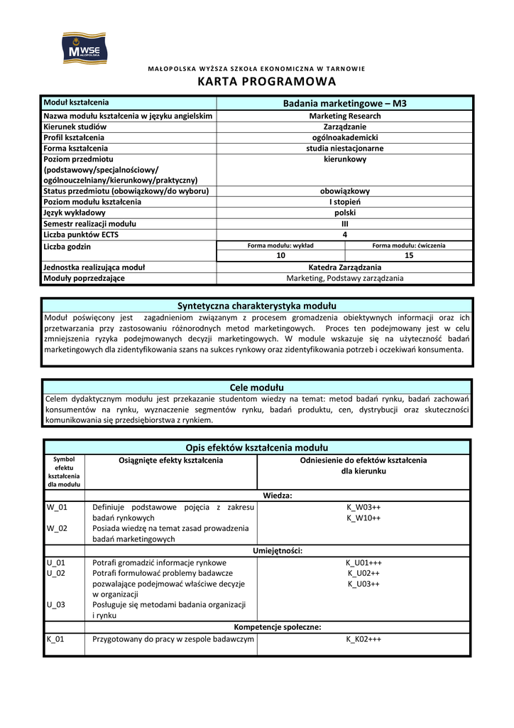 MAŁOP OLSKA WYŻSZ A SZ KOŁA E KONOMICZNA W TARN OW IE KARTA PROGRAMOWA Moduł kształcenia Badania marketingowe – M3 Nazwa modułu kształcenia w języku angielskim Kierunek studiów Profil kształcenia Forma kształcenia Poziom przedmiotu (podstawowy/specjalnościowy/ ogólnouczelniany/kierunkowy/praktyczny) Status przedmiotu (obowiązkowy/do wyboru) Poziom modułu kształcenia Język wykładowy Semestr realizacji modułu Liczba punktów ECTS Liczba godzin Marketing Research Zarządzanie ogólnoakademicki studia niestacjonarne kierunkowy obowiązkowy I stopień polski III 4 Forma modułu: wykład Forma modułu: ćwiczenia 10 15 Jednostka realizująca moduł Moduły poprzedzające Katedra Zarządzania Marketing, Podstawy zarządzania Syntetyczna charakterystyka modułu Moduł poświęcony jest zagadnieniom związanym z procesem gromadzenia obiektywnych informacji oraz ich przetwarzania przy zastosowaniu różnorodnych metod marketingowych. Proces ten podejmowany jest w celu zmniejszenia ryzyka podejmowanych decyzji marketingowych. W module wskazuje się na użyteczność badań marketingowych dla zidentyfikowania szans na sukces rynkowy oraz zidentyfikowania potrzeb i oczekiwań konsumenta. Cele modułu Celem dydaktycznym modułu jest przekazanie studentom wiedzy na temat: metod badań rynku, badań zachowań konsumentów na rynku, wyznaczenie segmentów rynku, badań produktu, cen, dystrybucji oraz skuteczności komunikowania się przedsiębiorstwa z rynkiem. Opis efektów kształcenia modułu Symbol efektu kształcenia dla modułu W_01 W_02 U_01 U_02 U_03 K_01 Osiągnięte efekty kształcenia Odniesienie do efektów kształcenia dla kierunku Wiedza: Definiuje podstawowe pojęcia z zakresu badań rynkowych Posiada wiedzę na temat zasad prowadzenia badań marketingowych Umiejętności: Potrafi gromadzić informacje rynkowe Potrafi formułować problemy badawcze pozwalające podejmować właściwe decyzje w organizacji Posługuje się metodami badania organizacji i rynku Kompetencje społeczne: Przygotowany do pracy w zespole badawczym K_W03++ K_W10++ K_U01+++ K_U02++ K_U03++ K_K02+++ Treści kształcenia modułu Forma modułu: wykład 1. Pojęcie i znaczenie badań marketingowych 2. Etapy badań marketingowych 3. Metody gromadzenia danych 4. Badania zachowań konsumentów 5. Wyznaczanie segmentacji rynku 6. Badania produktu 7. Badania cen 8. Badania systemu dystrybucji 9. Badania skuteczności systemu komunikacji 10. Organizacja badań marketingowych Literatura podstawowa 1. 2. 3. Literatura uzupełniająca 1. 2. 3. 1. 2. 3. 4. 5. 6. Forma modułu: ćwiczenia Etapy procesu badawczego. Metody doboru próby wykorzystywane w badaniach marketingowych. Zasady konstrukcji narzędzi pomiarowych – przykłady. Zastosowanie technik projekcyjnych w badaniach marketingowych. Analiza i interpretacja danych – studium przypadku. Opracowanie raportu z badań – prezentacja zasad konstrukcji raportu na wybranych przykładach. Kaczmarczyk S., Badania marketingowe, PWE, Warszawa 2011 Kaden R.J. , Badania marketingowe, PWE, Warszawa 2008 Badania marketingowe, red. K. Mazurek-Łopacińska, Wyd. PWN, Warszawa 2005 Kaczmarczyk S., Zastosowanie badań marketingowych, PWE, Warszawa 2007 Badania marketingowe, red. D. Maison, A. Noga-Bogomilski, Gdańskie Wydawnictwo Psychologiczne, Gdańsk 2007 Kędzior Z., Karcz K., Badania marketingowe w praktyce, PWE, Warszawa 2007 Metody dydaktyczne Wykład Ćwiczenia Opracowanie raportu projektu Krytyczna dyskusja wyników realizacji projektu z prowadzącym ćwiczenia Prezentacja projektu Egzamin w formie pisemnej