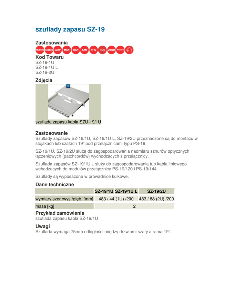 szuflady zapasu SZ-19 Zastosowania Kod Towaru SZ-19-1U SZ-19-1U L SZ-19-2U Zdjęcia szuflada zapasu kabla SZU-19/1U Zastosowanie Szuflady zapasów SZ-19/1U, SZ-19/1U L, SZ-19/2U przeznaczone są do montażu w stojakach lub szafach 19” pod przełącznicami typu PS-19. SZ-19/1U, SZ-19/2U służą do zagospodarowania nadmiaru sznurów optycznych łączeniowych (patchcordów) wychodzących z przełącznicy. Szuflada zapasów SZ-19/1U L służy do zagospodarowania tub kabla liniowego wchodzących do modułów przełącznicy PS-19/120 i PS-19/144. Szuflady są wyposażone w prowadnice kulkowe. Dane techniczne SZ-19/1U SZ-19/1U L SZ-19/2U 483 / 44 (1U) /200 483 / 88 (2U) /200 wymiary szer./wys./głęb. [mm] masa [kg] 2 Przykład zamówienia szuflada zapasu kabla SZ-19/1U Uwagi Szuflada wymaga 75mm odległości między drzwiami szafy a ramą 19”.