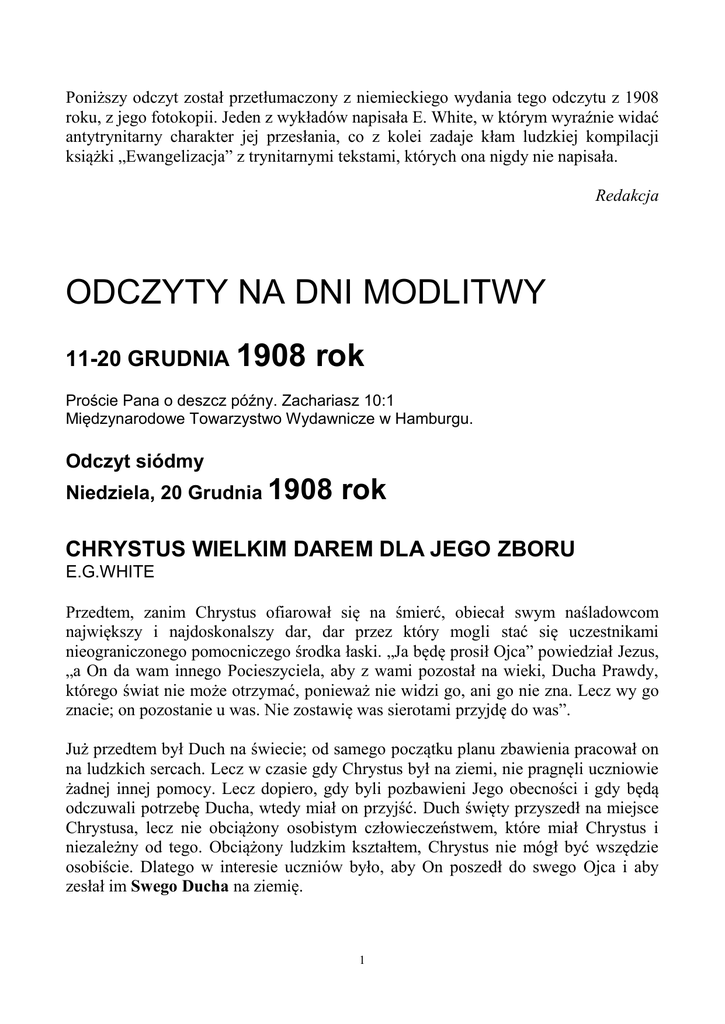 Poniższy odczyt został przetłumaczony z niemieckiego wydania tego odczytu z 1908 roku, z jego fotokopii. Jeden z wykładów napisała E. White, w którym wyraźnie widać antytrynitarny charakter jej przesłania, co z kolei zadaje kłam ludzkiej kompilacji książki „Ewangelizacja” z trynitarnymi tekstami, których ona nigdy nie napisała. Redakcja ODCZYTY NA DNI MODLITWY 11-20 GRUDNIA 1908 rok Proście Pana o deszcz późny. Zachariasz 10:1 Międzynarodowe Towarzystwo Wydawnicze w Hamburgu. Odczyt siódmy Niedziela, 20 Grudnia 1908 rok CHRYSTUS WIELKIM DAREM DLA JEGO ZBORU E.G.WHITE Przedtem, zanim Chrystus ofiarował się na śmierć, obiecał swym naśladowcom największy i najdoskonalszy dar, dar przez który mogli stać się uczestnikami nieograniczonego pomocniczego środka łaski. „Ja będę prosił Ojca” powiedział Jezus, „a On da wam innego Pocieszyciela, aby z wami pozostał na wieki, Ducha Prawdy, którego świat nie może otrzymać, ponieważ nie widzi go, ani go nie zna. Lecz wy go znacie; on pozostanie u was. Nie zostawię was sierotami przyjdę do was”. Już przedtem był Duch na świecie; od samego początku planu zbawienia pracował on na ludzkich sercach. Lecz w czasie gdy Chrystus był na ziemi, nie pragnęli uczniowie żadnej innej pomocy. Lecz dopiero, gdy byli pozbawieni Jego obecności i gdy będą odczuwali potrzebę Ducha, wtedy miał on przyjść. Duch święty przyszedł na miejsce Chrystusa, lecz nie obciążony osobistym człowieczeństwem, które miał Chrystus i niezależny od tego. Obciążony ludzkim kształtem, Chrystus nie mógł być wszędzie osobiście. Dlatego w interesie uczniów było, aby On poszedł do swego Ojca i aby zesłał im Swego Ducha na ziemię. 1 Przez to nikt nie mógł mieć wzajemnej pretensji odnośnie miejsca lub osobistej łączności z Chrystusem. Przez Ducha mógł być Zbawiciel dla wszystkich dostępny. W tym sensie mógł On być bliżej nich, niż w tym wypadku gdyby nie wstąpił w górę. Pocieszyciel jest nazwany Duchem prawdy. Jego dziełem jest umocnienie i utwierdzenie prawdy. Najpierw musi zamieszkać w sercu jako Duch prawdy i wtedy będzie Pocieszycielem. Prawda ma w sobie pocieszenie i pokój, lecz w kłamstwie nie ma żadnego pokoju i żadnego pocieszenia. Przez fałszywe teorie i tradycje szatan zdobył moc nad ludźmi. Przez skierowanie ich do fałszywej chorągwi, zniekształca ich charakter. Przez Pismo Święte przemawia Duch święty do (ludzi) człowieka i wpaja prawdę w serca. W ten sposób sprzeciwia się on błędowi i wypędza go z duszy. Przez Ducha prawdy, który działa przez Słowo Boże, przyciąga Bóg swój wybrany lud do Siebie. Poprzez opisanie przez Jezusa Jego uczniom urzędu Ducha świętego, usiłował On napełnić ich tą samą radością i nadzieją, którą On sam odczuwał. On radował się, że mógł dla swego zboru postarać się o bogato-obfitą pomoc. Duch Święty był najwyższym darem z pośród wszystkich darów, które mógł uprosić u Jego Ojca dla podniesienia Jego ludu. Duch Święty miał być dany jako moc odradzająca bez której ofiara Chrystusa byłaby nieskuteczna. Siła złego wzmacniała się w ciągu stuleci i zdumiewające było poddaństwo ludzi niewoli szatańskiej. Grzechowi można było się sprzeciwić i zwyciężyć go przez potężną moc Ducha świętego, który nie w mniejszej, lecz tylko w pełni boskiej mocy musiał przyjść. To jest Duch, który wprowadza w działalność to, co dokonał Zbawiciel świata. To jest Duch, który oczyszcza serce. Przez Ducha staje się wierzący uczestnikiem boskiej natury. Chrystus dał Ducha jako Boską moc, aby zostały wszystkie odziedziczone i nabyte skłonności do złego zwyciężone i aby Jego własny charakter mógł zostać przyswojony przez Jego zbór. O tym Duchu Jezus mówi: „On mnie uwielbi”. Zbawiciel przyszedł aby uwielbić Ojca przez to, że obiecał Jego miłość; tak też miał ten Duch uwielbić Chrystusa przez objawienie światu Jego łaski. Chwała Boża i chwała Chrystusa jest złączona z udoskonaleniem charakteru Jego ludu „Gdy on przyjdzie (Duch prawdy) będzie świat karał z powodu grzechu, dla sprawiedliwości i sądu”. Głoszenie Słowa Bożego będzie bez pożytku bez stałej obecności i pomocy Ducha świętego. On jest jedynym skutecznym nauczycielem boskiej prawdy. Jedynie wtedy, 2 gdy prawda zostanie zbliżona przez Ducha do serca, ożywi ona (serce) sumienie i przekształci życie. Może być ktoś wystarczająco zdolny aby przedstawić literalnie słowo Boże, może być zapoznany z wszystkimi nakazami i obietnicami; a jednak jego dusza nie upadnie na skałę i nie roztrąci się, jeżeli Duch święty nie wpoi prawdy w jego serce. Żadne wychowanie, żadne utalentowanie jakie by też były wielkie, nie mogą z kogoś uczynić nosicielem światłości bez działalności Ducha Bożego. Siew nasienia Ewangelii pozostanie bezskuteczny, gdy nasienie nie zostanie ożywione przez rosę z niebios. Przedtem zanim jakaś księga Nowego Testamentu została napisana lub głoszone było kazanie Ewangelii po zmartwychwstaniu Chrystusa, zstąpił Duch święty na modlących się apostołów i ich nieprzyjaciele musieli o nich powiedzieć: „napełniliście Jeruzalem waszą nauką”. Chrystus obiecał Jego zborowi dar Ducha świętego i ta obietnica przysługuje tak samo nam jak i pierwszym uczniom. Lecz tak samo jak każda inna obietnica jest ona dana pod pewnymi warunkami. Istnieje wielu wierzących, którzy również twierdzą, że obietnice Pana należą też do nich, którzy mówią o Chrystusie i Jego Duchu, lecz nie mają z tego żadnego błogosławieństwa. Oni nie poddają swych duszy pod kierownictwo i przewodnictwo boskiej mocy. Oni nie umieją rozpoznać potrzeby Duch świętego. Duch nie pomaga im. Przez Ducha świętego dokonuje Bóg „chcenie i wykonanie według Jego upodobania”. Lecz oni nie chcą się temu podporządkować, oni chcą o to sami si