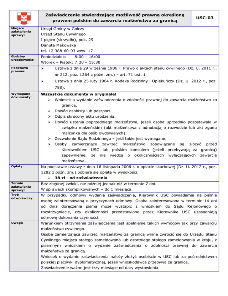 Zaświadczenie stwierdzające możliwość prawną określoną prawem polskim do zawarcia małżeństwa za granicą Miejsce załatwienia sprawy: USC-03 Urząd Gminy w Gołczy Urząd Stanu Cywilnego I piętro (skrzydło), pok. 29 Danuta Makowska tel. 12 388-60-03 wew. 17 Godziny urzędowania: Poniedziałek: Podstawa prawna: 8:00 – 16:00 Wtorek – Piątek: 7:30 – 15:30 Ustawa z dnia 29 września 1986 r. Prawo o aktach stanu cywilnego (Dz. U. 2011 r., nr 212, poz. 1264 z późn. zm.) – art. 71 ust. 1 Ustawa z dnia 25 luty 1964 r. Kodeks Rodzinny i Opiekuńczy (Dz. U. 2012 r., poz. 788). Wymagane dokumenty: Wszystkie dokumenty w oryginale! Wniosek o wydanie zaświadczenia o zdolności prawnej do zawarcia małżeństwa za granicą. Dowód osobisty lub paszport. Odpis skrócony aktu urodzenia. Dowód ustania poprzedniego małżeństwa, jeżeli osoba uprzednio pozostawała w związku małżeńskim (akt małżeństwa z adnotacją o rozwodzie lub akt zgonu małżonka dla osób owdowiałych). Zezwolenie Sądu Rodzinnego – jeśli takie jest wymagane. Osoby zamierzające zawrzeć małżeństwo zobowiązane są złożyć przed Kierownikiem USC lub polskim konsulem (jeżeli przebywają za granicą) zapewnienie, że nie wiedzą o okolicznościach wyłączających zawarcie małżeństwa. Opłaty: Na podstawie ustawy z dnia 16 listopada 2006 r. o opłacie skarbowej (Dz. U. 2012 r., poz. 1282 z późn. zm.) pobiera się opłatę w wysokości: 38 zł - od zaświadczenia Termin załatwienia sprawy: Bez zbędnej zwłoki, nie później jednak niż w terminie 7 dni. Tryb odwoławczy: W przypadku odmowy wydania zaświadczenia, Kierownik USC powiadamia na piśmie W sprawach skomplikowanych – do 1 miesiąca. osobę zainteresowaną o przyczynach odmowy. Osoba zainteresowana w terminie 14 dni od dnia doręczenia pisma może wystąpić z wnioskiem do Sądu Rejonowego o rozstrzygniecie, czy okoliczności przedstawione przez Kierownika USC uzasadniają odmowę dokonania czynności. Uwagi: Warunkiem otrzymania zaświadczenia jest spełnienie takich wymogów jak przy zawarciu małżeństwa cywilnego. Osoba zamierzająca zawrzeć małżeństwo za granicą winna zwrócić się do Urzędu Stanu Cywilnego miejsca stałego zameldowana lub ostatniego stałego zameldowania w kraju, z pisemnym wnioskiem o wydanie zaświadczenia o zdolności prawnej do zawarcia małżeństwa za granicą. Wniosek o wydanie zaświadczenia należy złożyć osobiście w USC lub za pośrednictwem polskiej placówki dyplomatycznej, jeżeli wnioskodawca przebywa za granicą. Zaświadczenie ważne jest trzy miesiące od daty wystawienia.