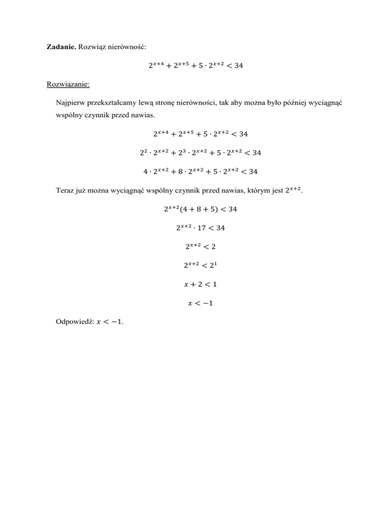 Zadanie. Rozwiąż nierówność: 2௫ାସ 2௫ାହ 5 ∙ 2௫ାଶ 34 Rozwiązanie: Najpierw przekształcamy lewą stronę nierówności, tak aby można było później wyciągnąć wspólny czynnik przed nawias. 2௫ାସ 2௫ାହ 5 ∙ 2௫ାଶ 34 2ଶ ∙ 2௫ାଶ 2ଷ ∙ 2௫ାଶ 5 ∙ 2௫ାଶ 34 4 ∙ 2௫ାଶ 8 ∙ 2௫ାଶ 5 ∙ 2௫ାଶ 34 Teraz już można wyciągnąć wspólny czynnik przed nawias, którym jest 2௫ାଶ . 2௫ାଶ 4 8 5 34 2௫ାଶ ∙ 17 34 2௫ାଶ 2 2௫ାଶ 2ଵ 21 1 Odpowiedź: 1.