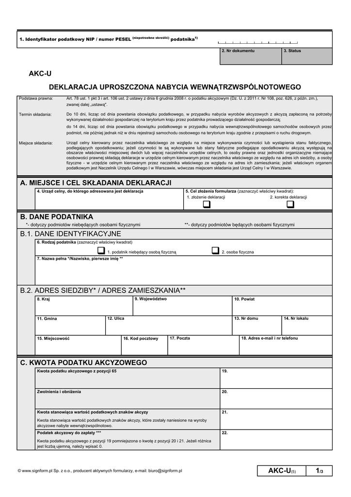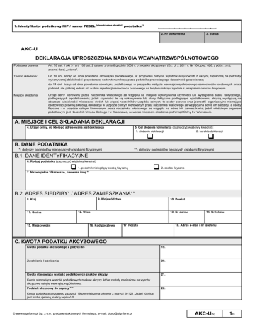 1. Identyfikator podatkowy NIP / numer PESEL (niepotrzebne skreślić) podatnika1) 2. Nr dokumentu 3. Status AKC-U DEKLARACJA UPROSZCZONA NABYCIA WEWNĄTRZWSPÓLNOTOWEGO Podstawa prawna: Art. 78 ust. 1 pkt 3 i art. 106 ust. 2 ustawy z dnia 6 grudnia 2008 r. o podatku akcyzowym (Dz. U. z 2011 r. Nr 108, poz. 626, z późn. zm.), zwanej dalej „ustawą". Termin składania: Do 10 dni, licząc od dnia powstania obowiązku podatkowego, w przypadku nabycia wyrobów akcyzowych z akcyzą zapłaconą na potrzeby wykonywanej działalności gospodarczej na terytorium kraju przez podatnika prowadzącego działalność gospodarczą; do 14 dni, licząc od dnia powstania obowiązku podatkowego w przypadku nabycia wewnątrzwspólnotowego samochodów osobowych przez podmiot, nie później jednak niż w dniu rejestracji samochodu osobowego na terytorium kraju zgodnie z przepisami o ruchu drogowym. Miejsce składania: Urząd celny kierowany przez naczelnika właściwego ze względu na miejsce wykonywania czynności lub wystąpienia stanu faktycznego, podlegających opodatkowaniu; jeżeli czynności te są wykonywane lub stany faktyczne podlegające opodatkowaniu akcyzą występują na obszarze właściwości miejscowej dwóch lub więcej naczelników urzędów celnych, to osoby prawne oraz jednostki organizacyjne niemające osobowości prawnej składają deklaracje w urzędzie celnym kierowanym przez naczelnika właściwego ze względu na adres ich siedziby, a osoby fizyczne - w urzędzie celnym kierowanym przez naczelnika właściwego ze względu na adres ich zamieszkania; jeżeli właściwym organem podatkowym jest Naczelnik Urzędu Celnego I w Warszawie, wówczas miejscem składania jest Urząd Celny I w Warszawie. A. MIEJSCE I CEL SKŁADANIA DEKLARACJI 4. Urząd celny, do którego adresowana jest deklaracja 5. Cel złożenia formularza (zaznaczyć właściwy kwadrat): 1. złożenie deklaracji 2. korekta deklaracji B. DANE PODATNIKA *- dotyczy podmiotów niebędących osobami fizycznymi **- dotyczy podmiotów będących osobami fizycznymi B.1. DANE IDENTYFIKACYJNE 6. Rodzaj podatnika (zaznaczyć właściwy kwadrat) 1. podatnik niebędący osobą fizyczną 2. osoba fizyczna 7. Nazwa pełna */Nazwisko, pierwsze imię ** B.2. ADRES SIEDZIBY* / ADRES ZAMIESZKANIA** 9. Województwo 8. Kraj 11. Gmina 10. Powiat 13. Nr domu 12. Ulica 15. Miejscowość 16. Kod pocztowy 14. Nr lokalu 18. Adres e-mail i nr telefonu 17. Poczta C. KWOTA PODATKU AKCYZOWEGO Kwota podatku akcyzowego z pozycji 65 19. Zwolnienia i obniżenia 20. Kwota stanowiąca wartość podatkowych znaków akcyzy 21. Kwota stanowiąca wartość podatkowych znaków akcyzy, które zostały naniesione na wyroby akcyzowe nabyte wewnątrzwspólnotowo. Podatek akcyzowy do zapłaty *** 22. Kwota podatku akcyzowego z pozycji 19 pomniejszona o kwotę z pozycji 20 i 21. Jeżeli różnica jest liczbą ujemną, należy wpisać 0. © www.signform.pl Sp. z o.o., producent aktywnych formularzy, e-mail: [email protected] AKC-U(5) 1/3 D. OBLICZENIE KWOT PODATKU AKCYZOWEGO OD POSZCZEGÓLNYCH WYROBÓW AKCYZOWYCH ORAZ OD SAMOCHODÓW OSOBOWYCH Lp. Nazwa wyrobów akcyzowych oraz samochodów osobowych, dla których ustalono odrębne stawki podatkowe (w przypadku samochodów osobowych - podać markę, model, rok produkcji, pojemność skokową silnika i nr nadwozia) Data powstania obowiązku 2) podatkowego (dzień-miesiąc-rok) b a Ośmiocyfrowy kod CN Podstawa (dla wyrobów węglowych 3) 4) 5) opodatkowania – pozycja CN) c d Stawka podatku e Kwota podatku w zł (e x f) f g 23. 24. 25. 26. 27. 28. 29. 30. 31. 32. 33. 34. 35. 36. 37. 38. 39. 40. 41. 42. 43. 44. 45. 46. 47. 48. 49. 50. 51. 52. 53. 54. 55. 56. 57. 58. 59. 60. 61. 62. 63. 64. Razem AKC-U(5) 65. 2/3 © www.signform.pl Sp. z o.o., producent aktywnych formularzy, e-mail: [email protected] 5) E. OŚWIADCZENIE PODATNIKA LUB OSOBY REPREZENTUJĄCEJ PODATNIKA Oświadczam, że są mi znane przepisy Kodeksu karnego skarbowego o odpowiedzialności za podanie danych niezgodnych z rzeczywistością. 66. Imię 67. Nazwisko 68. Data wypełnienia deklaracji (dzień - miesiąc - rok) 69. Podpis (i pieczątka) podatnika lub osoby reprezentującej podatnika 70. Numer telefonu i adres e-mail podatnika lub osoby reprezentującej podatnika F. ADNOTACJE URZĘDU CELNEGO 71. Uwagi urzędu celnego 72. Identyfikator przyjmującego formularz 73. Podpis przyjmującego formularz *** Pouczenie: W przypadku niewpłacenia w obowiązującym terminie kwoty z poz. 22 lub wpłacenia jej w niepełnej wysokości, niniejsza deklaracja stanowi podstawę do wystawienia tytułu wykonawczego, zgodnie z przepisami ustawy z dnia 17 czerwca 1966 r. o postępowaniu egzekucyjnym w administracji (Dz. U. z Nr 229, poz. 1954, z późn.zm.). Objaśnienia: 1) 2) 3) 4) 5) Numer PESEL należy podać w przypadku podatników będących osobami fizycznymi objętymi rejestrem PESEL nieprowadzących działalności gospodarczej lub niebędących zarejestrowanymi podatnikami od towarów i usług. Datę powstania obowiązku podatkowego w przypadku nabycia wewnątrzwspólnotowego samochodu osobowego niezarejestrowanego wcześniej na terytorium kraju zgodnie z przepisami o ruchu drogowym określa się na podstawie art. 101 ust. 2 ustawy. Datę powstania obowiązku podatkowego z tytułu nabycia wewnątrzwspolnotowego wyrobów akcyzowych z zapłaconą akcyzą, dokonanego na potrzeby wykonywanej działalności gospodarczej na terytorium kraju, określa się na podstawie art. 10 ust 4 ustawy. W przypadku kilogramów i hektolitrów ilość podaje się z dokładnością do dwóch miejsc po przecinku, w przypadku tysięcy litrów, tysięcy kilogramów, tysięcy sztuk i gigadżuli - z dokładnością do trzech miejsc po przecinku. Wartość opałowa odpowiadająca ilości wyrobów węglowych, będąca przedmiotem opodatkowania, w GJ. Podstawy opodatkowania (wyrażone kwotowo) i kwoty podatków zaokrągla się do pełnych złotych w ten sposób, że końcówki kwot wynoszące mniej