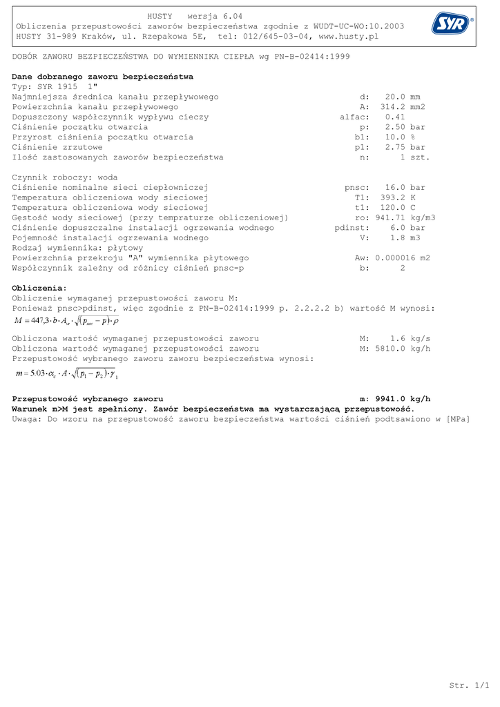 HUSTY wersja 6.04 Obliczenia przepustowości zaworów bezpieczeństwa zgodnie z WUDT-UC-WO:10.2003 HUSTY 31-989 Kraków, ul. Rzepakowa 5E, tel: 012/645-03-04, www.husty.pl DOBÓR ZAWORU BEZPIECZEŃSTWA DO WYMIENNIKA CIEPŁA wg PN-B-02414:1999 Dane dobranego zaworu bezpieczeństwa Typ: SYR 1915 1" Najmniejsza średnica kanału przepływowego Powierzchnia kanału przepływowego Dopuszczony współczynnik wypływu cieczy Ciśnienie początku otwarcia Przyrost ciśnienia początku otwarcia Ciśnienie zrzutowe Ilość zastosowanych zaworów bezpieczeństwa Czynnik roboczy: woda Ciśnienie nominalne sieci ciepłowniczej Temperatura obliczeniowa wody sieciowej Temperatura obliczeniowa wody sieciowej Gęstość wody sieciowej (przy tempraturze obliczeniowej) Ciśnienie dopuszczalne instalacji ogrzewania wodnego Pojemność instalacji ogrzewania wodnego Rodzaj wymiennika: płytowy Powierzchnia przekroju "A" wymiennika płytowego Współczynnik zależny od różnicy ciśnień pnsc-p d: A: alfac: p: b1: p1: n: 20.0 314.2 0.41 2.50 10.0 2.75 1 mm mm2 bar % bar szt. pnsc: 16.0 bar T1: 393.2 K t1: 120.0 C ro: 941.71 kg/m3 pdinst: 6.0 bar V: 1.8 m3 Aw: 0.000016 m2 b: 2 Obliczenia: Obliczenie wymaganej przepustowości zaworu M: Ponieważ pnsc>pdinst, więc zgodnie z PN-B-02414:1999 p. 2.2.2.2 b) wartość M wynosi: Obliczona wartość wymaganej przepustowości zaworu Obliczona wartość wymaganej przepustowości zaworu Przepustowość wybranego zaworu zaworu bezpieczeństwa wynosi: M: 1.6 kg/s M: 5810.0 kg/h Przepustowość wybranego zaworu m: 9941.0 kg/h Warunek m>M jest spełniony. Zawór bezpieczeństwa ma wystarczającą przepustowość. Uwaga: Do wzoru na przepustowość zaworu bezpieczeństwa wartości ciśnień podtsawiono w [MPa] Str. 1/1