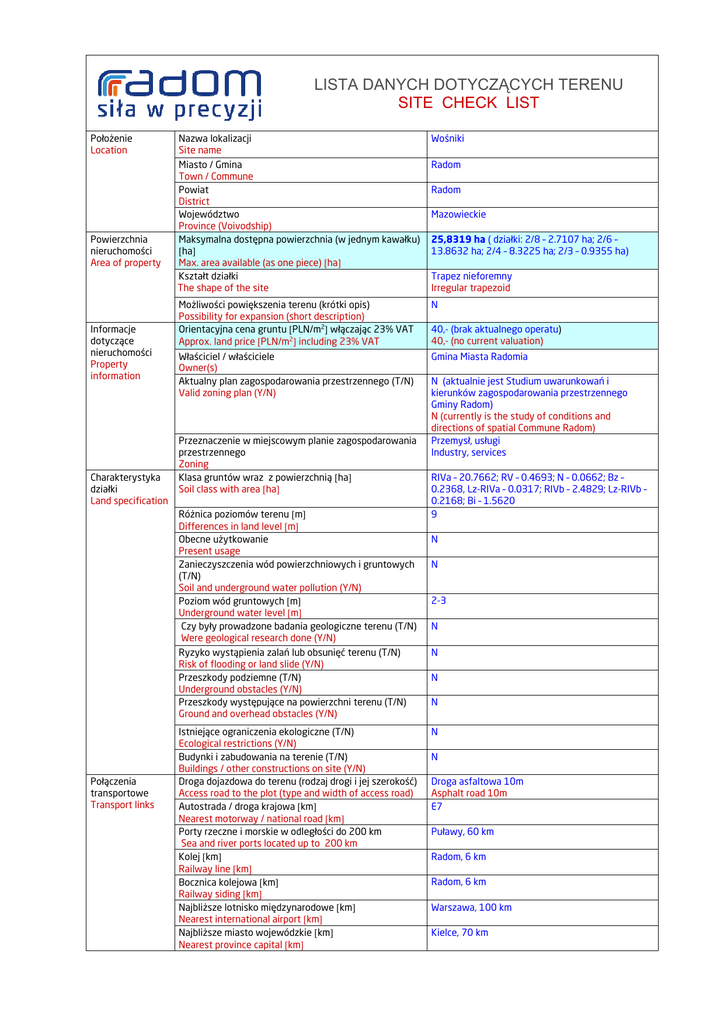 LISTA DANYCH DOTYCZĄCYCH TERENU SITE CHECK LIST Położenie Location Powierzchnia nieruchomości Area of property Informacje dotyczące nieruchomości Property information Charakterystyka działki Land specification Nazwa lokalizacji Site name Wośniki Miasto / Gmina Town / Commune Powiat District Województwo Province (Voivodship) Maksymalna dostępna powierzchnia (w jednym kawałku) [ha] Max. area available (as one piece) [ha] Kształt działki The shape of the site Radom Możliwości powiększenia terenu (krótki opis) Possibility for expansion (short description) Orientacyjna cena gruntu [PLN/m2] włączając 23% VAT Approx. land price [PLN/m2] including 23% VAT N Właściciel / właściciele Owner(s) Aktualny plan zagospodarowania przestrzennego (T/N) Valid zoning plan (Y/N) Gmina Miasta Radomia Przeznaczenie w miejscowym planie zagospodarowania przestrzennego Zoning Klasa gruntów wraz z powierzchnią [ha] Soil class with area [ha] Różnica poziomów terenu [m] Differences in land level [m] Obecne użytkowanie Present usage Zanieczyszczenia wód powierzchniowych i gruntowych (T/N) Soil and underground water pollution (Y/N) Poziom wód gruntowych [m] Underground water level [m] Czy były prowadzone badania geologiczne terenu (T/N) Were geological research done (Y/N) Połączenia transportowe Transport links Radom Mazowieckie 25,8319 ha ( działki: 2/8 – 2.7107 ha; 2/6 – 13.8632 ha; 2/4 – 8.3225 ha; 2/3 – 0.9355 ha) Trapez nieforemny Irregular trapezoid 40,- (brak aktualnego operatu) 40,- (no current valuation) N (aktualnie jest Studium uwarunkowań i kierunków zagospodarowania przestrzennego Gminy Radom) N (currently is the study of conditions and directions of spatial Commune Radom) Przemysł, usługi Industry, services RIVa – 20.7662; RV – 0.4693; N – 0.0662; Bz – 0.2368, Lz-RIVa – 0.0317; RIVb – 2.4829; Lz-RIVb – 0.2168; Bi – 1.5620 9 N N 2-3 N Ryzyko wystąpienia zalań lub obsunięć terenu (T/N) Risk of flooding or land slide (Y/N) Przeszkody podziemne (T/N) Underground obstacles (Y/N) Przeszkody występujące na powierzchni terenu (T/N) Ground and overhead obstacles (Y/N) N Istniejące ograniczenia ekologiczne (T/N) Ecological restrictions (Y/N) Budynki i zabudowania na terenie (T/N) Buildings / other constructions on site (Y/N) Droga dojazdowa do terenu (rodzaj drogi i jej szerokość) Access road to the plot (type and width of access road) Autostrada / droga krajowa [km] Nearest motorway / national road [km] Porty rzeczne i morskie w odległości do 200 km Sea and river ports located up to 200 km Kolej [km] Railway line [km] Bocznica kolejowa [km] Railway siding [km] Najbliższe lotnisko międzynarodowe [km] Nearest international airport [km] Najbliższe miasto wojewódzkie [km] Nearest province capital [km] N N N N Droga asfaltowa 10m Asphalt road 10m E7 Puławy, 60 km Radom, 6 km Radom, 6 km Warszawa, 100 km Kielce, 70 km Istniejąca infrastruktura Existing infrastructure Elektryczność na terenie (T/N) Electricity (Y/N) Odległość przyłącza od granicy terenu Connection point (distance from boundary) [m] Napięcie Voltage [kV] Dostępna moc Available capacity [MW] Gaz na terenie (T/N) Gas (Y/N) Odległość przyłącza od granicy działki Connection point (distance from boundary) [m] Wartość kaloryczna Calorific value [MJ/Nm3] Średnica rury Pipe diameter [mm] Dostępna objętość Available capacity [Nm3/h] Woda na terenie (T/N) Water supply (Y/N) Odległość przyłącza od granicy teren Connection point (distance from boundary) [m] Dostępna objętość Available capacity [m3/24h] Kanalizacja na terenie (T/N) Sewage discharge (Y/N) Odległość przyłącza od granicy teren Connection point (distance from boundary) [m] Dostępna objętość Available capacity [m3/24h] Oczyszczalnia ścieków na terenie bądź w bezpośrednim sąsiedztwie Treatment plant (Y/N) T Niskie napięcie oraz średnie napięcie można dostarczyć z linii wzdłuż ul. Kieleckiej ok. 25 m. Low voltage and medium voltage can be supplied from the line along. Kielce approx. 25 m. 15 kV 2 MW T 10 m 34,43 MJ/m3 34,43 MJ/m3 125 800 T 3m 1500 Ø 160 T Y 8 500 Ø 100,200 i 250 Tak 12 km na północ Yes 12 km to North Uwagi Comments Osoba przygotowująca ofertę Offer prepared by Osoby do kontaktu Contact person Rafał Grzeszczyk, Kierownik Biura Obsługi Inwestora, +48 48 3620332, [email protected] , en, ru Rafał Grzeszczyk, Kierownik Biura Obsługi Inwestora, +48 48 3620332, [email protected] , en, ru