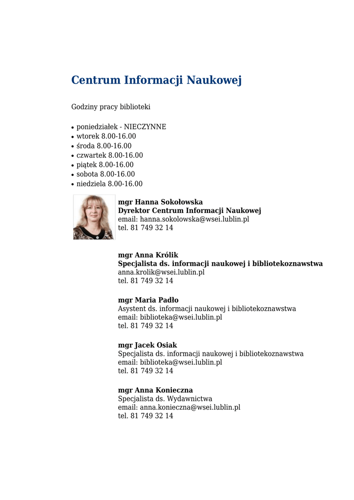 Centrum Informacji Naukowej Godziny pracy biblioteki ● ● ● ● ● ● ● poniedziałek - NIECZYNNE wtorek 8.00-16.00 środa 8.00-16.00 czwartek 8.00-16.00 piątek 8.00-16.00 sobota 8.00-16.00 niedziela 8.00-16.00 mgr Hanna Sokołowska Dyrektor Centrum Informacji Naukowej email: [email protected] tel. 81 749 32 14 mgr Anna Królik Specjalista ds. informacji naukowej i bibliotekoznawstwa [email protected] tel. 81 749 32 14 mgr Maria Padło Asystent ds. informacji naukowej i bibliotekoznawstwa email: [email protected] tel. 81 749 32 14 mgr Jacek Osiak Specjalista ds. informacji naukowej i bibliotekoznawstwa email: [email protected] tel. 81 749 32 14 mgr Anna Konieczna Specjalista ds. Wydawnictwa email: [email protected] tel. 81 749 32 14