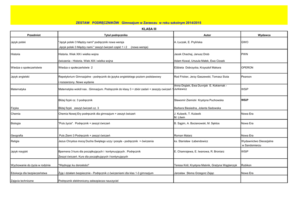 ZESTAW PODRĘCZNIKÓW Gimnazjum w Zarzeczu w roku szkolnym 2014/2015 KLASA III Przedmiot Język polski Tytuł podręcznika Autor "Język polski 3 Między nami" podręcznik nowa wersja Wydawca A. Łuczak, E. Prylińska GWO Historia. Wiek XIX i wielka wojna Jacek Chachaj, Janusz Drob PWN ćwiczenia - Historia. Wiek XIX i wielka wojna Adam Kowal, Urszula Małek, Ewa Ciosek Wiedza o społeczeństwie Wiedza o społeczeństwie 2 Elżbieta Dobrzycka, Krzysztof Makara OPERON Język angielski Repetytorium Gimnazjalne - podręcznik do języka angielskiego poziom podstawowy Rod Fricker, Jerzy Gaszewski, Tomasz Siuta Pearson Język polski 3 Między nami." zeszyt ćwiczeń część 1 i 2 Historia (nowa wersja) i rozszerzony. Nowe wydanie Anna Drążek, Ewa Duvnjak E. Kokiernak Matematyka wokół nas . Gimnazjum. Podręcznik do klasy 3 + zbiór zadań + zeszyty cwiczeń 1 Jurkiewicz i2 WSiP Bliżej fizyki cz. 3 podręcznik Sławomir Ziemicki Krystyna Puchowska WSiP Fizyka Bliżej fizyki zeszyt ćwiczeń cz. 3 Barbara Biesiedna, Jolanta Sadowska Chemia Chemia Nowej Ery podręcznik dla gimnazjum + zeszyt ćwiczeń J. Kulawik, T. Kulawik M. Litwin Nowa Era Biologia "Puls życia". Podręcznik + zeszyt ćwiczeń B. Sągim, A. Bocianowski, M. Sęktos Nowa Era Geografia Puls Ziemi 3 Podręcznik + zeszyt ćwiczeń Roman Malarz Nowa Era Religia Jezus Chrystus mocą Ducha Swiętego uczy i posyła - podręcznik + ćwiczenia ks. Stanisław Łabendowicz Wydawnictwo Diecezjalne w Sandomierzu Język rosyjski Bpemena 3 kurs dla początkujących i kontynuujących . Podręcznik E. Chamrajewa, E. Iwanowa, R. Broniarz WSiP Matematyka Zeszyt ćwiczeń. Kurs dla początkujących i kontynujących Wychowanie do życia w rodzinie "Wędrując ku dorosłości" Teresa Król, Krystyna Maśnik, Grażyna Węglarczyk Rubikon Edukacja dla bezpieczeństwa Żyję i działam bezpiecznie - Podręcznik z ćwiczeniami dla klas 1-3 gimnazjum Jarosław Słoma Grzegorz Zając Nowa Era Zajęcia techniczne Podręcznik elektroniczny zabezpiecza nauczyciel
