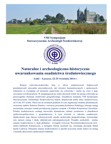 VIII Sympozjum Stowarzyszenia Archeologii Środowiskowej Naturalne i archeologiczno-historyczne uwarunkowania osadnictwa średniowiecznego Łódź – Łęczyca, 22-25 września 2014 r. Relacje człowiek-środowisko leżą w sferze zainteresowań badawczych przedstawicieli dyscyplin przyrodniczych, jak również humanistycznych i społecznych. Zależność ta występuje od momentu pojawienia się człowieka i nasila się wraz z jego rozwojem cywilizacyjnym. W następujących po sobie okresach rośnie też presja człowieka na poszczególne elementy środowiska geograficznego. Zasadniczo tematyka VIII Sympozjum Stowarzyszenia Archeologii Środowiskowej będzie obejmowała pełne ramy średniowiecza, od VI do XV wieku. Okres ten na ziemiach polskich to czas organizacji struktur plemiennych, tworzenia zrębów Państwa Piastów i wreszcie powstania Królestwa Polskiego, którego zasięg terytorialny znacząco został powiększony poprzez związek z Wielkim Księstwem Litewskim. Polskie średniowiecze cechują niezwykle dynamiczne zmiany systemowe o charakterze społeczno-politycznym i gospodarczym, w tym również w zakresie osadniczym. Społeczności tego okresu wykorzystywały zasoby środowiska geograficznego, rozszerzając tym samym zasięg i skalę oddziaływań antropogenicznych. Ponadto zachodziły istotne zmiany środowiskowe w skali globalnej – wystąpiło wówczas Wczesnośredniowieczne (tzw. małe) Optimum Klimatyczne, a następnie klimat zaostrzał się, zwiastując początek Małej Epoki Lodowej. Naturalne zmiany środowiskowe w sposób oczywisty miały wpływ na zasięg i kierunki aktywności społeczności ludzkich. Łęczyckie skupisko osadnicze jest doskonałym poligonem badawczym dla poznawania i śledzenia przemian osadniczych i gospodarczych oraz zmian środowiskowych, zachodzących w tym ważnym okresie dziejów człowieka na ziemiach polskich. Łęczyca, aż do drugiego rozbioru pierwszej Rzeczypospolitej, stanowiła ośrodek centralny obszaru zwanego dziś Polską Środkową. Wyrażamy przekonanie, że wznowione przed kilku laty badania archeologiczne na grodzisku w Tumie, wykorzystujące nowoczesne metody badawcze, w tym również z zakresu archeologii środowiskowej, staną się doskonałą bazą rozważań na temat relacji człowiek-środowisko na terenie ziem polskich oraz sąsiednich obszarów Europy Centralnej i Wschodniej w średniowieczu. Głównym celem naukowym VIII Sympozjum Stowarzyszenia Archeologii Środowiskowej będzie przedyskutowanie w gronie archeologów i przyrodników uwarunkowań osadnictwa średniowiecznego. Punktem wyjścia do osiągnięcia wyżej wymienionego celu, będzie prezentacja wyników interdyscyplinarnych badań archeologicznohistoryczno-przyrodniczych grodziska tumskiego, która nastąpi podczas wyjazdu terenowego do Łęczycy. Uczestnikom Sympozjum zostaną zaprezentowane także inne obiekty w Łęczycy i okolicy (np. romańska kolegiata w Tumie, zamek średniowieczny w Łęczycy oraz Skansen Zagrody Chłopskiej w Kwiatkówku), a także podłódzkie stanowiska terenowe, chronologicznie związane ze średniowieczem (np. Karsznice, Aleksandrów Łódzki/Rąbień, Lutomiersk). Zakładamy, że prezentacja zbadanych obiektów średniowiecznych, przeprowadzona przez pracowników Muzeum Archeologicznego i Etnograficznego w Łodzi oraz Katedry Geomorfologii i Paleogeografii WNG UŁ, z udziałem ich dalszych współpracowników z zakresu botaniki i paleobotaniki, archeozoologii, antropologii, historii, historii sztuki i numizmatyki, stanie się dobrą płaszczyzną do wymiany poglądów i dyskusji. Zapraszamy zainteresowanych problematyką VIII Sympozjum SAS do przygotowania swoich referatów tematycznych, a także szerszego upowszechnienia niniejszych informacji, z jednoczesną zachętą do wzięcia udziału w łódzkim spotkaniu. Przewodniczący Komitetu Organizacyjnego prof. dr hab. Ryszard Grygiel oraz dr hab. Juliusz Twardy, prof. UŁ fot. Mirosław Makohonienko