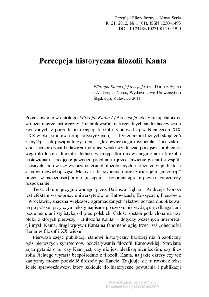 Recenzja - Percepcja historyczna filozofii Kanta