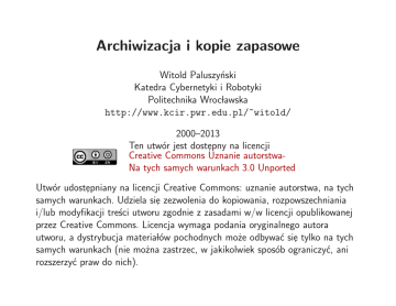 Archiwizacja i kopie zapasowe Witold Paluszyński Katedra Cybernetyki i Robotyki Politechnika Wroclawska http://www.kcir.pwr.edu.pl/~witold/ 2000–2013 Ten utwór jest doste֒ pny na licencji Creative Commons Uznanie autorstwaNa tych samych warunkach 3.0 Unported Utwór udoste֒ pniany na licencji Creative Commons: uznanie autorstwa, na tych samych warunkach. Udziela sie֒ zezwolenia do kopiowania, rozpowszechniania i/lub modyfikacji treści utworu zgodnie z zasadami w/w licencji opublikowanej przez Creative Commons. Licencja wymaga podania oryginalnego autora utworu, a dystrybucja materialów pochodnych może odbywać sie֒ tylko na tych samych warunkach (nie można zastrzec, w jakikolwiek sposób ograniczyć, ani rozszerzyć praw do nich). Zagrożenia bezpieczeństwa systemu komputerowego • Bezpieczeństwo fizyczne systemu: kradzież, zniszczenie, uszkodzenie, np. pożar, zalanie, skok napie֒ cia. • Bezpieczeństwo danych: utrata, uszkodzenie, sabotaż, kradzież, ujawnienie. • Cia֒glość doste֒ pu do systemu: awarie sprze֒ tu, oprogramowania, awarie zasilania, wentylacji, klimatyzacji, ogrzewania, cia֒glości dostaw (np. pra֒du, paliwa do generatorów, albo tonera do drukarki), ataki typu DOS. Wie֒ kszości z tych zagrożeń można zapobiegać, jednak nigdy ze 100%-wym skutkiem. Dlatego wykonuje sie֒ kopie zapasowe (backup). Kopie zapasowe — zagrożenia bezpieczeństwa 3 Terminologia W informatyce istnieje nieścislość terminologiczna zwiazana z procesami tworzenia kopii zapasowych. Cze֒ sto te procesy nazywa sie֒ archiwizacja֒. Ściśle rzecz biora֒c, archiwizacja oznacza przenoszenie danego obiektu do archiwum, czyli wykonanie kopii archiwalnej obiektu, która ma go zasta֒pić. W je֒ zyku polskim mieszanie tych pojeć ֒ jest dodatkowo uzasadnione, ponieważ nie istnieje zgrabny czasownik oznaczaja֒cy tworzenie kopii zapasowych (backup-owanie??). Dlatego w tej prezentacji poje֒ cia archiwizacji i tworzenia kopii zapasowych również be֒ da֒ stosowane zamiennie. Nie należy natomiast mylić tworzenia kopii zapasowych z tworzeniem kopii dodatkowych, jako elementu redundancji, maja֒cej na celu zabezpieczenie przed awaria֒. Na przyklad, macierz RAID-1 zapisuje dane jednocześnie na dwóch dyskach. Po awarii jednego dysku macierz pracuje dalej korzystaja֒c z drugiego. Kopie zapasowe nie chronia֒ przed awaria֒, tylko pomagaja֒ przywrócić stan systemu po be֒ da֒cej skutkiem awarii utracie danych. Kopie zapasowe — terminologia 4 Tworzenie kopii zapasowych • element planowania kryzysowego • zabezpieczenie przed mikro-awariami (przypadkowe skasowanie pliku/ów) i prawdziwymi katastrofami (awaria dysku, wlamanie, pożar) • również pozwala odzyskać poprzednia֒ wersje֒ niedawno zmienionego pliku • wykonywana na mediach ladowalnych, tzn. takich, które wycia֒ga sie֒ z komputera w czasie pracy, co zabezpiecza przed takimi awariami, jak awaria kontrolera dysku (wyla֒czaja֒cego nie jeden ale wiele dysków), jak również przed jednoczesna֒ utrata֒ lub uszkodzeniem wszystkich dysków • wymaga planowania: – cykl nagrywania i rotacja nośników – sposób przechowywania i zabezpieczenie – format danych i oprogramowanie • wymaga testowania — nie wystarczy zaplanować i uruchomić ambitne procedury tworzenie kopii zapasowych, a potem spać spokojnie; trzeba testować nie tylko możliwość odczytania poszczególnych taśm, ale pelne scenariusze awarii, i możliwość odbudowania i ponownego uruchomienia calego systemu lub centrum obliczeniowego Kopie zapasowe — zasady 5 Zasady archiwizacji • Archiwizacja danych – ośrodka obliczeniowego ∗ regularna, globalna, duże ilości danych, dobrze dzialaja֒ca machina – indywidualnego użytkownika ∗ mniejsze ilości danych, inteligentne podejście, cze֒ sto zaniedbywana • Archiwizacja systemu – ośrodka obliczeniowego ∗ przechowywanie nośników instalacyjnych ∗ rozwia֒zywanie problemów w przypadku reinstalacji na innym sprze֒ cie (sterowniki, licencje, numery seryjne) – indywidualnego użytkownika ∗ cze֒ sto zaste֒ powana nowa֒ instalacja֒; możliwe problemy, np. sterowniki • Archiwizacja struktur (calych partycji/dysków) – szybka, wygodna metoda archiwizacji systemu + danych – możliwa tylko przy odbudowie systemu na tym samym sprze֒ cie – wymaga wste֒ pnej instalacji systemu, lub odtwarzania dysków na innym – podobna w przypadku ośrodka IT oraz indywidualnego użytkownika Kopie zapasowe — zasady 6 Planowanie harmonogramu archiwizacji • dyski, partycje dyskowe krytyczne — musza֒ być archiwizowane – szybkozmienne: np. katalogi użytkowników – wolnozmienne: np. systemowe – inne, np. pojedyncze zmienione, lub zmieniaja֒ce sie֒ pliki na ogólnie niezmiennej strukturze, np. plik /etc/passwd, lub pliki konfiguracyjne jakiegoś programu, lub podsystemu • dyski, partycje dyskowe niekrytyczne — niekoniecznie wymagaja֒ce archiwizacji: /tmp, /var/log, /var/spool Kopie zapasowe — planowanie 7 Rodzaje kopii zapasowych • Pelna — kompletna kopia zawieraja֒ca wszystkie dane • Przyrostowa — archiwum zawieraja֒ce wszystkie pliki zmodyfikowane / utworzone od czasu ostatniego ich nagrania na kopii zapasowej. Tworzenie kopii przyrostowych znacznie oszcze֒ dza koszt i naklad pracy, co w efekcie pozwala zaimplementować skuteczniejszy schemat archiwizacji. Na przyklad, wykonanie raz w tygodniu kopii pelnej, a przez pozostale dni kopii przyrostowych daje bardzo dobry poziom bezpieczeństwa, typowo znacznie niższym kosztem, niż codzienne nagrywanie kopii pelnej. Jednak wada֒ tej procedury jest dluższy czas odtwarzania danych. • Różnicowa — archiwum zawieraja֒ce wszystkie pliki zmodyfikowane / utworzone od czasu nagrania ostatniej pelnej kopii zapasowej. Rozwia֒zuje problem odtwarzania z kopii pelnej+przyrostowych. Odtworzenie wszystkich danych wymaga użycia tylko kopii pelnej i ostatniej różnicowej. W systemach, gdzie zm