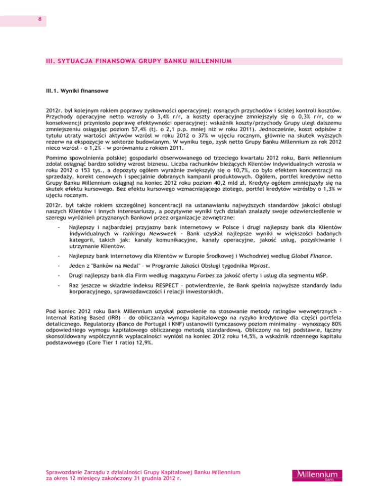 8 III. SYTUACJA FINANSOWA GRUPY BANKU MILLENNIUM III.1. Wyniki finansowe 2012r. był kolejnym rokiem poprawy zyskowności operacyjnej: rosnących przychodów i ścisłej kontroli kosztów. Przychody operacyjne netto wzrosły o 3,4% r/r, a koszty operacyjne zmniejszyły się o 0,3% r/r, co w konsekwencji przyniosło poprawę efektywności operacyjnej: wskaźnik koszty/przychody Grupy uległ dalszemu zmniejszeniu osiągając poziom 57,4% (tj. o 2,1 p.p. mniej niż w roku 2011). Jednocześnie, koszt odpisów z tytułu utraty wartości aktywów wzrósł w roku 2012 o 37% w ujęciu rocznym, głównie na skutek wyższych rezerw na ekspozycje w sektorze budowlanym. W wyniku tego, zysk netto Grupy Banku Millennium za rok 2012 nieco wzrósł - o 1,2% - w porównaniu z rokiem 2011. Pomimo spowolnienia polskiej gospodarki obserwowanego od trzeciego kwartału 2012 roku, Bank Millennium zdołał osiągnąć bardzo solidny wzrost biznesu. Liczba rachunków bieżących Klientów indywidualnych wzrosła w roku 2012 o 153 tys., a depozyty ogółem wyraźnie zwiększyły się o 10,7%, co było efektem koncentracji na sprzedaży, korekt cenowych i specjalnie dobranych kampanii produktowych. Ogółem, portfel kredytów netto Grupy Banku Millennium osiągnął na koniec 2012 roku poziom 40,2 mld zł. Kredyty ogółem zmniejszyły się na skutek efektu kursowego. Bez efektu kursowego wzmacniającego złotego, portfel kredytów wzrósłby o 1,3% w ujęciu rocznym. 2012r. był także rokiem szczególnej koncentracji na ustanawianiu najwyższych standardów jakości obsługi naszych Klientów i innych interesariuszy, a pozytywne wyniki tych działań znalazły swoje odzwierciedlenie w szeregu wyróżnień przyznanych Bankowi przez organizacje zewnętrzne: - Najlepszy i najbardziej przyjazny bank internetowy w Polsce i drugi najlepszy bank dla Klientów indywidualnych w rankingu Newsweek - Bank uzyskał najlepsze wyniki w większości badanych kategorii, takich jak: kanały komunikacyjne, kanały operacyjne, jakość usług, pozyskiwanie i utrzymanie Klientów. - Najlepszy bank internetowy dla Klientów w Europie Środkowej i Wschodniej według Global Finance. - Jeden z "Banków na Medal" – w Programie Jakości Obsługi tygodnika Wprost. - Drugi najlepszy bank dla Firm według magazynu Forbes za jakość oferty i usług dla segmentu MŚP. - Raz jeszcze w składzie indeksu RESPECT – potwierdzenie, że Bank spełnia najwyższe standardy ładu korporacyjnego, sprawozdawczości i relacji inwestorskich. Pod koniec 2012 roku Bank Millennium uzyskał pozwolenie na stosowanie metody ratingów wewnętrznych Internal Rating Based (IRB) – do obliczania wymogu kapitałowego na ryzyko kredytowe dla części portfela detalicznego. Regulatorzy (Banco de Portugal i KNF) ustanowili tymczasowy poziom minimalny – wynoszący 80% odpowiedniego wymogu kapitałowego obliczanego metodą standardową. Obliczony na tej podstawie, łączny skonsolidowany współczynnik wypłacalności wyniósł na koniec 2012 roku 14,5%, a wskaźnik rdzennego kapitału podstawowego (Core Tier 1 ratio) 12,9%. Sprawozdanie Zarządu z działalności Grupy Kapitałowej Banku Millennium za okres 12 miesięcy zakończony 31 grudnia 2012 r. 9 Rachunek zysków i strat Grupy Przychody operacyjne (mln zł) 2012 Wynik z tytułu odsetek * Wynik z tytułu prowizji DOCHÓD NA DZIAŁALNOŚCI PODSTAWOWEJ ** Pozostałe przychody pozaodsetkowe *** w tym walutowe Przychody operacyjne ogółem Zmiana 2012/2011 2011 1 227,3 1190,8 3,1% 546,0 561,8 -2,8% 1 773,3 1 752,6 1,2% 179,3 136,6 31,3% 159,9 113,7 40,6% 1 952,6 1 889,1 3,4% (*) Dane pro-forma: wynik z tytułu odsetek zawiera marże na wszystkich instrumentach pochodnych. Od 1 stycznia 2006 r. Bank stosuje zasady rachunkowości zabezpieczeń. Od dnia wspomnianej zmiany marża z tych operacji jest uwzględniana w wyniku z tytułu odsetek. Jednakże, ponieważ zasady rachunkowości zabezpieczeń nie obejmują całości portfela denominowanego w walutach obcych, Bank przedstawia dane w układzie pro-forma, w którym całość marży na instrumentach pochodnych jest ujmowana w ramach wyniku z tytułu odsetek, podczas gdy rachunkowo, część przedmiotowej marży (66,1 mln zł w 2012 i 48,9 mln zł w 2011) jest wykazywana w pozostałych przychodach pozaodsetkowych. Zdaniem Banku takie podejście pozwala na lepsze zrozumienie rzeczywistego kształtowania się tej pozycji z ekonomicznego punktu widzenia. (**) Suma wyniku z tytułu odsetek i wyniku z tytułu prowizji. (***) Zawiera wynik z pozycji wymiany, wynik na operacjach finansowych (pro-forma) oraz pozostałe przychody i koszty operacyjne netto. Wynik z tytułu odsetek (w ujęciu pro-forma) za 2012 r. osiągnął 1.227,3 mln zł, co oznacza wzrost o 3,1% w porównaniu z rokiem 2011. Poprawa wyniku z tytułu odsetek została uzyskana w środowisku charakteryzującym się presją na marże odsetkowe w związku z szybko spadającymi stopami procentowymi, zwłaszcza widocznymi w ostatnim kwartale roku. Bank zdołał zmniejszyć swój wskaźnik kredyty/depozyty poniżej 100% przy ograniczonym wpływie na marżę odsetkową netto, która spadła z 2,5% średnio w 2011 r. do 2,4% w 2012 roku. Wynik z tytułu prowizji zmniejszył się nieznacznie (-2,8%) w roku 2012 w porównaniu z rokiem 2011 – wzrost w niektórych kategoriach takich jak prowizje z bancassurance, dystrybucji produktów inwestycyjnych i działalności kredytowej skompensowały spadek prowizji, głównie związany z transakcjami maklerskimi i powierniczymi, a także wynikły z dalszej promocji rachunków bieżących. Pozostałe przychody pozaodsetkowe wzrosły w roku 2012 o 31,3% r/r dzięki wyższym przychodom z pozycji wymiany, które wzrosły o 41% w porównaniu z rokiem 2011. Co się tyczy innych niż wynik z pozycji wymiany przychodów pozaodsetkowych, widoczny był wyższy przychód ze sprzedaży papierów dłużnych z portfela inwestycyjnych aktywów finansowych (wzrost o 22,9 mln zł). Z kolei wyni