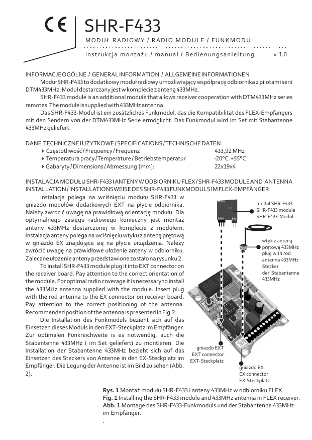 SHR-F433 MODU£ RADIOWY / RADIO MODULE / FUNKMODUL instrukcja monta¿u / manual / Bedienungsanleitung v. 1.0 INFORMACJE OGÓLNE / GENERAL INFORMATION / ALLGEMEINE INFORMATIONEN Modu³ SHR-F433 to dodatkowy modu³ radiowy umo¿liwiaj¹cy wspó³pracê odbiornika z pilotami serii DTM433MHz. Modu³ dostarczany jest w komplecie z anten¹ 433MHz. SHR-F433 module is an additional module that allows receiver cooperation with DTM433MHz series remotes. The module is supplied with 433MHz antenna. Das SHR-F433-Modul ist ein zusätzliches Funkmodul, das die Kompatibilität des FLEX-Empfängers mit den Sendern von der DTM433MHz Serie ermöglicht. Das Funkmodul wird im Set mit Stabantenne 433MHz geliefert. DANE TECHNICZNE I U¯YTKOWE / SPECIFICATIONS / TECHNISCHE DATEN Czêstotliwoœæ / Frequency / Frequenz 433,92 MHz 4 Temperatura pracy / Temperature / Betriebstemperatur -20°C +55°C 4 Gabaryty / Dimensions / Abmessung [mm]: 22x19x4 4 INSTALACJA MODU£U SHR-F433 I ANTENY W ODBIORNIKU FLEX / SHR-F433 MODULE AND ANTENNA INSTALLATION / INSTALLATIONSWEISE DES SHR-F433 FUNKMODULS IM FLEX-EMPFÄNGER Instalacja polega na wciœniêciu modu³u SHR-F433 w modu³ SHR-F433 gniazdo modu³ów dodatkowych EXT na p³ycie odbiornika. SHR-F433 module Nale¿y zwróciæ uwagê na prawid³ow¹ orientacjê modu³u. Dla SHR-F433-Modul optymalnego zasiêgu radiowego konieczny jest monta¿ anteny 433MHz dostarczonej w komplecie z modu³em. Instalacja anteny polega na wciœniêciu wtyku z anten¹ prêtow¹ wtyk z anten¹ w gniazdo EX znajduj¹ce siê na p³ycie urz¹dzenia. Nale¿y prêtow¹ 433MHz zwróciæ uwagê na prawid³owe u³o¿enie anteny w odbiorniku. plug with rod Zalecane u³o¿enie anteny przedstawione zosta³o na rysunku 2. antenna 433MHz Stecker To install SHR-F433 module plug it into EXT connector on der Stabantenne the receiver board. Pay attention to the correct orientation of 433MHz the module. For optimal radio coverage it is necessary to install the 433MHz antenna supplied with the module. Insert plug with the rod antenna to the EX connector on receiver board. Pay attention to the correct positioning of the antenna. Recommended position of the antenna is presented in Fig.2. Die Installation des Funkmoduls bezieht sich auf das Einsetzen dieses Moduls in den EXT-Steckplatz im Empfänger. Zur optimalen Funkreichweite is es notwendig, auch die Stabantenne 433MHz ( im Set geliefert) zu montieren. Die gniazdo EXT Installation der Stabantenne 433MHz bezieht sich auf das EXT connector Einsetzen des Steckers von Antenne in den EX-Steckplatz im EXT-Steckplatz Empfänger. Die Legung der Antenne ist im Bild zu sehen (Abb. gniazdo EX 2). EX connector EX-Steckplatz Rys. 1 Monta¿ modu³u SHR-F433 i anteny 433MHz w odbiorniku FLEX Fig. 1 Installing the SHR-F433 module and 433MHz antenna in FLEX receiver. Abb. 1 Montage des SHR-F433-Funkmoduls und der Stabantenne 433MHz im Empfänger. . antena 433MHz antenna 433MHz Antenne 433MHz antena 868MHz* antenna 868MHz* Antenne 868MHz* Rys. 2 Zalecane u³o¿enie anten w odbiorniku FLEX. Fig. 2 Recommended placement of antennas at FLEX receiver. Abb.2 Die Legung der Antenne im Empfänger. * Fabrycznie odbiornik FLEX dostarczany jest z anten¹ 868MHz u³o¿on¹ w zag³êbieniu œcianki obudowy. W przypadku monta¿u dodatkowego modu³u SHR-F433 zalecane jest u³o¿enie anteny 433MHz w zag³êbieniu œcianki obudowy oraz u³o¿enie anteny 868MHz w komorze obudowy. *In factory settings, FLEX receiver is supplied with 868MHz antenna arranged in the wall hollow of the enclosure. When installing the additional SHRF-433 module it is recommended to put 433MHz antenna in the wall hollow of the enclosure and to put 868MHz antenna in the housing. *Fabrikmäßig wird der FLEX- Empfänger mit Stabantenne 868MHz geliefert. Diese Antenne wird in die Vertiefung des Gehäuse gelegt. Wenn das zusätzliche SHR-F433 Funkmodul mit der Stabantenne 433MHz geliefert sein sollte, sollte diese Antenne in die Vertiefung gelegt werden. Die Stabantenne 868MHz sollte gelassen werden. Wszelkie prace zwi¹zane z pod³¹czaniem, instalowaniem i usuwaniem dodatkowych modu³ów nale¿y wykonywaæ przy od³¹czonym zasilaniu. All work related with connecting, installing and removing additional modules must be done with power supply disconnected. Die Installation oder Entfernung der zusätzlichen Module soll man beim abgeschalteten Strom ausführen. DTM System spó³ka z ograniczon¹ odpowiedzialnoœci¹ spó³ka komandytowa