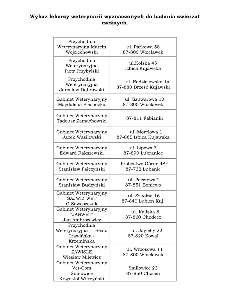 Wykaz lekarzy weterynarii wyznaczonych do badania zwierząt rzeźnych. Przychodnia Weterynaryjna Marcin Wojciechowski ul. Parkowa 58 87-800 Włocławek Przychodnia Weterynaryjna Piotr Przybylski ul.Kolska 45 Izbica Kujawska Przychodnia Weterynaryjna Jarosław Dąbrowski ul. Radziejowska 1a 87-880 Brześć Kujawski Gabinet Weterynaryjny Magdalena Piechocka ul. Szuwarowa 10 87-800 Włocławek Gabinet Weterynaryjny Tadeusz Zamachowski 87-811 Fabianki Gabinet Weterynaryjny Jacek Wasilewski ul. Morelowa 1 87-865 Izbica Kujawska Gabinet Weterynaryjny Edward Rakszewski ul. Lipowa 3 87-890 Lubraniec Gabinet Weterynaryjny Stanisław Pałczyński Gabinet Weterynaryjny Stanisław Budzyński Gabinet Weterynaryjny SAJWIZ WET G.Sawoszczuk Gabinet Weterynaryjny "JANWET" Jan Ambrożewicz Przychodnia Weterynaryjna Beata Trawińska Krzemińska Gabinet Weterynaryjny ZAWIŚLE Wiesław Milewicz Gabinet Weterynaryjny Vet-Com Śmiłowice Krzysztof Wilczyński Probostwo Górne 48E 87-732 Lubanie ul. Pocztowa 2 87-851 Boniewo ul. Szkolna 16 87-840 Lubień Kuj. ul. Kaliska 8 87-860 Chodecz ul. Jagiełły 22 87-820 Kowal ul. Wrzosowa 11 87-800 Włocławek Śmiłowice 23 87-850 Choceń
