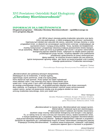 XVI Powiatowy Ostródzki Rajd Ekologiczny „Chrońmy Bioróżnorodność” INFORMACJE DLA DRUŻYNOWYCH (fragment programu – Odznaka Chrońmy Bioróżnorodność – opublikowanego na www.program.zhp.pl) „Od 100 lat skauci otaczają opieką środowisko naturalne oraz życie, które ono podtrzymuje, a także propagują jego ochronę i zachowanie. Inspiracją tych działań jest szacunek dla natury, szacunek, którego niestety w wielu przypadkach brak, co objawia się wzrastającym wymieraniem zwierząt, zwiększającym się wycinaniem drzew i rosnącą utratą siedlisk. Teraz, bardziej niż kiedykolwiek, musimy kontynuować i przyspieszyć skautową tradycję pozostawiania świata lepszym, niż go zastaliśmy. Młodzi ludzie już teraz są przykładem jak chronić i utrzymać różnorodność biologiczną poprzez sadzenie drzew, wpływanie na władze państw poprzez proekologiczne grupy nacisku, recykling odpadów oraz podnoszenie świadomości społeczeństwa na temat zanieczyszczeń. Mamy nadzieję, że niniejsza broszura będzie dla was pomocna, byście kontynuowali ogromny wpływ, jaki macie na swoją przyszłość oraz trwałość waszego społeczeństwa i środowiska naturalnego.” Margaret Treloar Przewodnicząca Światowego Stowarzyszenia Przewodniczek i Skautek „Bioróżnorodność jest podstawą zdrowych ekosystemów, składających się na środowisko, w którym żyjemy, zapewniając czyste powietrze, wodę oraz żyzną glebę, która dostarcza nam żywność. Przez tysiące lat ludzie wyhodowali nowe odmiany roślin i rasy zwierząt przy użyciu różnorodności życia wokół nich i wciąż wiele z tych roślin potrzebuje innych organizmów do swojego prawidłowego rozwoju - na przykład pszczoły zapylają wiele drzew owocowych. Mam nadzieję, że Propozycja Chrońmy Bioróżnorodność rozwinie wasze zainteresowanie cudami natury, zachęci do poszerzenia wiedzy oraz do podjęcia działań na rzecz ochrony środowiska naturalnego, które jest wokół was.” Peter Holmgren Dyrektor Wydziału ds Klimatu, Energii i Dzierżawy Gruntów, Organizacja Narodów Zjednoczonych do spraw Wyżywienia i Rolnictwa (skrót: FAO) „Bioróżnorodność to inaczej życie. Bioróżnorodność jest naszym życiem. Różnorodność i złożoność życia jest zdumiewająca. W najnowszej historii ludzkość jest bardzo nieostrożna; skutkiem czego tracimy różnorodność biologiczną oraz korzyści z niej płynące. To, co robimy teraz na rzecz ochrony lub niszczenia natury, będzie kształtować świat, w którym będziemy żyć w przyszłości. Wyzwania dotyczące przyszłości bioróżnorodności stoją przed dzisiejszą młodzieżą oraz dziećmi - będącymi obywatelami i liderami w przyszłości. Zachęcam do zapoznania się i uświadamiania innych na temat różnorodności biologicznej poprzez Propozycję Chrońmy Bioróżnorodność. To właśnie wasza kreatywność, ciekawość i wytrwałość ostatecznie zapewni życie w harmonii w przyszłości.” Ahmed Djoghlaf Sekretarz Wykonawczy Konwencji o różnorodności biologicznej Wprowadzenie do bioróżnorodności ,,Bio” oznacza życie, „różnorodność” zaś - zbiór wielu rzeczy, które nie są takie same, stąd bioróżnorodność (inaczej różnorodność biologiczna) jest niezwykłym bogactwem różnorodnych organizmów żywych w przyrodzie, a także obejmuje sposób, w jaki one wzajemnie na siebie oddziaływują. Bioróżnorodność odnosi się do wszystkich gatunków zwierząt, roślin i innych form życia, oraz różnorodności, która istnieje w każdym gatunku. Obejmuje ona również różnorodność obecną w ekosystemach – innymi słowy - zmiany, które widzimy w środowisku, w tym zmiany krajobrazów, roślin i zwierząt w nim egzystujących, a także różne sposoby, w których te części ekosystemów współdziałają ze sobą. Bioróżnorodność jest niezwykle złożona i często tłumaczy się ją jako różnorodność i zmienność genów, gatunków i ekosystemów. Geny są jednostkami dziedziczności występującymi we wszystkich komórkach. Zawierają one specjalne kody lub instrukcje, które nadają organizmom różne cechy. Różnorodność genetyczna występuje w obrębie gatunku, a nawet w odmianach danego gatunku. Na przykład w jednej odmianie pomidorów geny jednego osobnika mogą spowodować zakwitnięcie wcześniej niż pozostałe bądź wydanie bardziej czerwonych pomidorów To właśnie różnorodność genetyczna występująca na poziomie indywidualnym sprawia, że każdy organizm jest unikalny. W naturze bowiem nie ma dwóch żywych istot, które byłyby dokładnie takie same. Na świecie żyje niezliczony zbiór zwierząt, roślin, grzybów oraz mikroorganizmów. Wszystkie rodzaje tych organizmów nazywane są gatunkami. Gatunek to grupa podobnych organizmów, które mogą krzyżować się ze sobą i wydać zdrowe, płodne potomstwo. Chociaż możemy sobie tego nie uświadamiać, widzimy różne gatunki w naszym codziennym życiu, np. ludzi, kozy, drzewa czy komary. Różnorodność gatunków jest najbardziej oczywistym typem różnorodności biologicznej. Nasza planeta daje życie milionom gatunków, z których wiele nie zostało jeszcze odkrytych! Zwierzęta, rośliny a nawet mikroorganizmy żyją w społecznościach, tak jak ludzie. Miejsce, gdzie zamieszkują społeczności roślin i zwierząt wraz z glebą oraz klimatem na danej przestrzeni, tworzy ekosystem. Ekosystemy są często nazywane ,,środowiskiem naturalnym” lub „naturą”. Istnieje wiele rodzajów ekosystemów na Ziemi. Ekosystemy mogą być małe jak kałuże, lub duże jak pustynie, lasy, tereny podmokłe, góry, morza, jeziora czy rzeki. Być może najważniejszą cechą różnorodności biologicznej jest to, że wszystkie komponenty są ze sobą powiązane. Na przykład, jeśli mysz zje chemicznie zanieczyszczone nasiono, może przetrwać, ale jeżeli jastrząb zje wiele myszy, które zjadły takie nasiona, mo