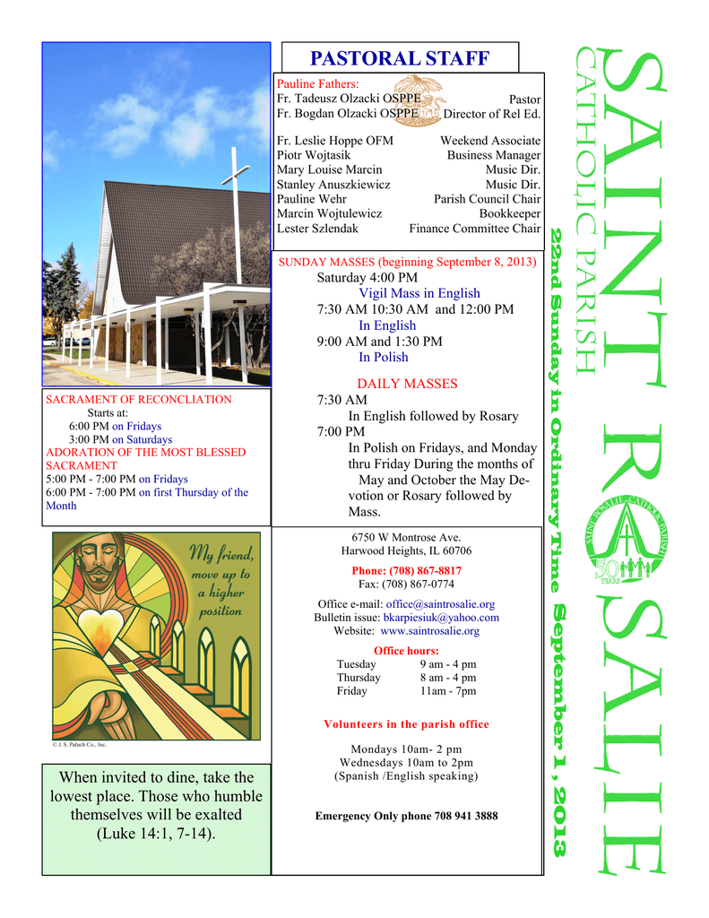 PASTORAL STAFF Pauline Fathers: Fr. Tadeusz Olzacki OSPPE Fr. Bogdan Olzacki OSPPE Weekend Associate Business Manager Music Dir. Music Dir. Parish Council Chair Bookkeeper Finance Committee Chair SUNDAY MASSES (beginning September 8, 2013) Saturday 4:00 PM Vigil Mass in English 7:30 AM 10:30 AM and 12:00 PM In English 9:00 AM and 1:30 PM In Polish SACRAMENT OF RECONCLIATION Starts at: 6:00 PM on Fridays 3:00 PM on Saturdays ADORATION OF THE MOST BLESSED SACRAMENT 5:00 PM - 7:00 PM on Fridays 6:00 PM - 7:00 PM on first Thursday of the Month DAILY MASSES 7:30 AM In English followed by Rosary 7:00 PM In Polish on Fridays, and Monday thru Friday During the months of May and October the May Devotion or Rosary followed by Mass. 6750 W Montrose Ave. Harwood Heights, IL 60706 Phone: (708) 867-8817 Fax: (708) 867-0774 Office e-mail: [email protected] Bulletin issue: [email protected] Website: www.saintrosalie.org Office hours: Tuesday 9 am - 4 pm Thursday 8 am - 4 pm Friday 11am - 7pm Volunteers in the parish office When invited to dine, take the lowest place. Those who humble themselves will be exalted (Luke 14:1, 7-14). Mondays 10am- 2 pm Wednesdays 10am to 2pm (Spanish /English speaking) Emergency Only phone 708 941 3888 22nd Sunday in Ordinary Time September 1 , 2013 Fr. Leslie Hoppe OFM Piotr Wojtasik Mary Louise Marcin Stanley Anuszkiewicz Pauline Wehr Marcin Wojtulewicz Lester Szlendak Pastor Director of Rel Ed. St. Rosalie Dzis jest wymiana tajemnic Rożańcowych. Wszyscy chętni, którzy chcą dołączyć się do odmawiania Różańca proszeni są o kontakt z ojcem Bogdanem. WELCOME BACK, to our Teachers & Students. We are looking forward to an exciting year. Classes started today at 9:00am For anyone still interested in joining our program we are excepting late registrations. Call our office for info at 708-867-4588 Back to School Savings Order forms due in office by Friday, September 13 Internet orders by 11 pm Monday, September 16 Pick- Up Date/Time: Thursday, September 19; 5 - 6pm 2 BAPTISMS: Our Parish celebrates Baptisms on the first Sunday Of the month. Parents are asked to Participate in the preparation meeting before the date is scheduled. Please call the rectory for an appointment. Required Documents: Birth certificate of the child, proof of catholic parish membership (for at least 6 months) for both parents as well as sponsors. WEDDINGS: The Archdiocese of Chicago requires arrangements for weddings be made 6 months in advanced. Please call the office for an appointment. Required Documents: Baptismal certificates for the engaged, proof of membership to a catholic parish ( for at least 6 months) for both bride and groom, proof of completion of pre-Cana Program. SACRAMENT OF THE SICK Please call the office to make arrangements. Our priest visits the sick on the first Friday of the month or as needed. COMMUNION CALLS Please call the office or emergency phone number to make arrangements to receive communion at home or a hospital READINGS FOR THE WEEK Monday Tuesday LK 4:16-30 PS 27:1, 4, 13-14 LK 4:31-37 Wednesday NEW CHURCH FLOOR DONATIONS $500.00 AND OVER 1.MR. MRS. CZESŁAW PAJĄK 2.MRS. DIANA JUN 3.MR. MRS. KAZIMIERZ WOLAK 4.MS. LOTTIE KLUZA 5.MS.PHILOMENA KOLESNIK 6.LORRAINE AND. JOHN BUJEWSKI 7.MS. CASIMIRA KLUZA 8.MR.MRS.STANISŁAW KUĆMIERZ 9.MR.MRS.PETER KOWALSKI 10. MRS.STEPHANIE MAIBUSCH 11. MR.MRS.STANISŁAW ZAWIŚLAK 12. MR.MRS.MICHELE SANTUCCI 13. IN MEMORY OF NORBERT PABICH 14. MS. ADELAIDE SQUIRES 15. MR.MRS.PAT &SUE SANTUCCI 16. MR.MRS.STANLEY DZIELSKI 17. MR.MRS.KAZIMIERZ JAROSZ 18. MR.MRS.LEO KAWCZINSKI 19. DANUTA ANASINSKI 20. MR. JAMES MAPES 21. MONIKA I ROBERT GREBSKI 22. MARIA GOFRON 23. MR. MRS. TOM & ROBERTA ALLEN 24. USHERS CLUB 25. JANINA & CZESŁAW SZLĘDAK 26. MARIA & MARIAN PUDELEK 27. PURISIMA R TAPALLA COL 1:1-8 PS 52:10, 11 LK 4:38-44 Thursday COL 1:9-14 PS 98:2-3AB, 3CD-4, 5-6 LK 5:1-11 Friday COL 1:15-20 PS 100:1B-2, 3, 4, 5 LK 5:33-39 Saturday COL 1:21-23 PS 54:3-4, 6 AND 8 LK 6:1-5 Sunday WIS 9:13-18B PS 90:3-4, 5-6, 12-13, 14-17 PHMN 9-10, 12-17 Please pray for your Parish St. Rosalie 1 THES 4:13-18 PS 96:1 AND 3, 4-5, 11-12, 13 LK 4:16-30 Have you ever thought about a vocation to priesthood or religious life? For information about the priesthood in the Archdiocese of Chicago, contact Fr. Brian Welter at 312-534-8298 or [email protected]. For information about religious life contact Sr. Elyse Ramirez, OP at 312-534-5240 or at [email protected], and for the Permanent Diaconate program contact Deacon Bob Puhala at [email protected] or 847-837-4562. 3 The St. Rosalie Society St. Rosalie Aniela Balek Dan Romza Edward & Geraldine Mish Elsie Passaglia Ernesto Santucci Florence, Richard and Patrick Lewandowski Fred R. Smolinski Sr. Harry Rogacki Noreen and Edward Dorner, Sr. Messina Family Dorothy Daniels Leonard Noccio Thomas and Dorothy Corcoran Adelia, Vincent and Henry Pokrywka Kranty & Bialas Families Mary & William McDonough Michael Delarco Harte Family Walter Lesner Norb Pabich of Carney Family Ted and Helen Wenc Caterina Imperiale Ralph Valentino Vincenza Santinesi Randazzo Jamrozik Family Leonard and Stella Novak Patrick McShane Ronald Welcing Violet Chrzastowski Joseph and Dolores Talarico Joseph and Anna Panici Mary and Andrew Bobor Anthony and Restituta Bellisario Henry and Craig Sienkiewicz Wanda and Steve Jamrozik Kolodziej Family Vincenzo and Nicoletta Santucci Frank and John Kalck Anthony Mollerdino Dominico Imperiale Rudy Gutowski Michal Grajdura Robert Bafundo Sr. Rosalia Badali Stapinski Family Cieslar Family Guy and Helen Millard Tony and Mary Mutchek Jean Kawczinski William Zdeb Josephine and Joseph LaCerra John Restivo James and Margaret Matsie Muto Family 4 Peter Kruk Please pray for Helen and Leo Kawczinski our Parishioners Leonard Kocol and Friends who enrolled as Anna and Joseph Chmiel members of the Saint Frank and Catherine Kogul Rosalie Society and who will Gino Dini, Sr. Jay, James and Catherine be remembered in our Profi