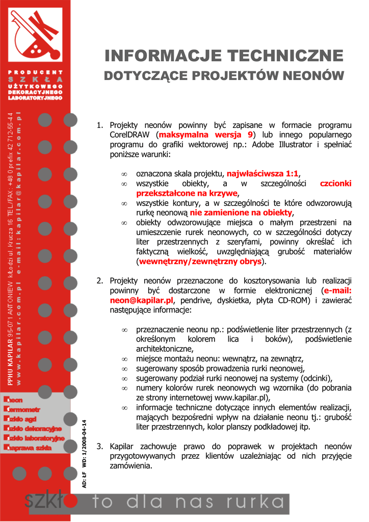 INFORMACJE TECHNICZNE DOTYCZĄCE PROJEKTÓW NEONÓW 1. Projekty neonów powinny być zapisane w formacie programu CorelDRAW (maksymalna wersja 9) lub innego popularnego programu do grafiki wektorowej np.: Adobe Illustrator i spełniać poniŜsze warunki: • • • • oznaczona skala projektu, najwłaściwsza 1:1, czcionki wszystkie obiekty, a w szczególności przekształcone na krzywe, wszystkie kontury, a w szczególności te które odwzorowują rurkę neonową nie zamienione na obiekty, obiekty odwzorowujące miejsca o małym przestrzeni na umieszczenie rurek neonowych, co w szczególności dotyczy liter przestrzennych z szeryfami, powinny określać ich faktyczną wielkość, uwzględniającą grubość materiałów (wewnętrzny/zewnętrzny obrys). 2. Projekty neonów przeznaczone do kosztorysowania lub realizacji powinny być dostarczone w formie elektronicznej (e-mail: [email protected], pendrive, dyskietka, płyta CD-ROM) i zawierać następujące informacje: • • • • • AD: ŁF WD: 1/2008-04-14 • przeznaczenie neonu np.: podświetlenie liter przestrzennych (z określonym kolorem lica i boków), podświetlenie architektoniczne, miejsce montaŜu neonu: wewnątrz, na zewnątrz, sugerowany sposób prowadzenia rurki neonowej, sugerowany podział rurki neonowej na systemy (odcinki), numery kolorów rurek neonowych wg wzornika (do pobrania ze strony internetowej www.kapilar.pl), informacje techniczne dotyczące innych elementów realizacji, mających bezpośredni wpływ na działanie neonu tj.: grubość liter przestrzennych, kolor planszy podkładowej itp. 3. Kapilar zachowuje prawo do poprawek w projektach neonów przygotowywanych przez klientów uzaleŜniając od nich przyjęcie zamówienia.