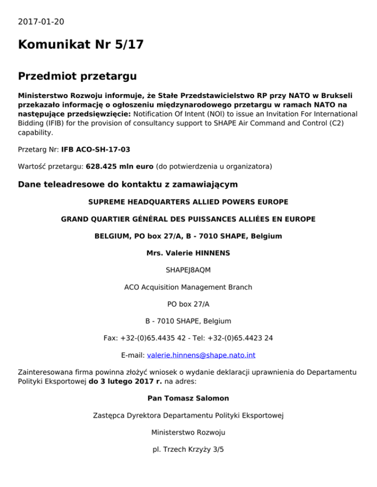 2017-01-20 Komunikat Nr 5/17 Przedmiot przetargu Ministerstwo Rozwoju informuje, że Stałe Przedstawicielstwo RP przy NATO w Brukseli przekazało informację o ogłoszeniu międzynarodowego przetargu w ramach NATO na następujące przedsięwzięcie: Notification Of Intent (NOl) to issue an Invitation For International Bidding (IFIB) for the provision of consultancy support to SHAPE Air Command and Control (C2) capability. Przetarg Nr: IFB ACO-SH-17-03 Wartość przetargu: 628.425 mln euro (do potwierdzenia u organizatora) Dane teleadresowe do kontaktu z zamawiającym SUPREME HEADQUARTERS ALLIED POWERS EUROPE GRAND QUARTIER GÉNÉRAL DES PUISSANCES ALLIÉES EN EUROPE BELGIUM, PO box 27/A, B - 7010 SHAPE, Belgium Mrs. Valerie HINNENS SHAPEJ8AQM ACO Acquisition Management Branch PO box 27/A B - 7010 SHAPE, Belgium Fax: +32-(0)65.4435 42 - Tel: +32-(0)65.4423 24 E-mail: [email protected] Zainteresowana firma powinna złożyć wniosek o wydanie deklaracji uprawnienia do Departamentu Polityki Eksportowej do 3 lutego 2017 r. na adres: Pan Tomasz Salomon Zastępca Dyrektora Departamentu Polityki Eksportowej Ministerstwo Rozwoju pl. Trzech Krzyży 3/5 00-507 Warszawa Osoby do kontaktu Główni specjaliści: Anna Stępniak i Zbigniew Skrzyński tel.: (22) 693 5673, (22) 693 5885 faks: (22) 693 4056 e-mail: [email protected], [email protected]