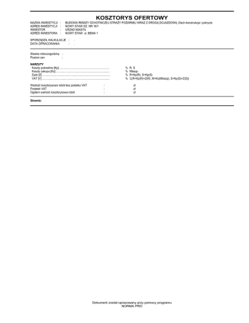 KOSZTORYS OFERTOWY NAZWA INWESTYCJI ADRES INWESTYCJI INWESTOR ADRES INWESTORA : : : : BUDOWA REMIZY OCHOTNICZEJ STRAśY POśARNEJ WRAZ Z DROGĄ DOJAZDOWĄ -Dach-konstrukcja i pokrycie NOWY STAW DZ. NR 16/1 URZAD MIASTA NOWY STAW ul. BEMA 1 SPORZĄDZIŁ KALKULACJE : DATA OPRACOWANIA : . . Stawka roboczogodziny : Poziom cen : NARZUTY Koszty pośrednie [Kp] ................................................................. Koszty zakupu [Kz] ...................................................................... Zysk [Z] ........................................................................................ VAT [V] ........................................................................................ Wartość kosztorysowa robót bez podatku VAT Podatek VAT Ogółem wartość kosztorysowa robót : : : % % % % R, S Mbezp R+Kp(R), S+Kp(S) Σ(R+Kp(R)+Z(R), M+Kz(Mbezp), S+Kp(S)+Z(S)) zł zł zł Słownie: Dokument został opracowany przy pomocy programu NORMA PRO STRAś NOWY STAW dach konstrukcje i pokrycie KSIĄśKA PRZEDMIARÓW Lp. Podst Opis i wyliczenia j.m. 1 KNR-W 2-02 Więźba dachowa o układzie jętkowym ze ścianką kolankową pod pokrycie da- m2 chówką karpiówką podwójnie o rozpiętości 12 m 0404-05 1213.06 m2 2 KNR-W 2-02 Pokrycie dachów blachą dachówkopodobną - PRODEX - płyty dachowe 0512-01 1213.06 m2 3 KNR-W 2-02 Pokrycie dachów blachą dachówkopodobną - PRODEX - gąsiory trójkątne 0512-02 84.12 m 4 KNR-W 2-02 Pokrycie dachów blachą dachówkopodobną - PRODEX - wiatrownice boczne 0512-03 66 m 5 KNR-W 2-02 Obróbki przy szer. w rozwinięciu do 25 cm - z blachy stalowej ocynkowanej 0514-01 23.260 m2 m2 m m m2 6 KNR-W 2-02 Obróbki przy szer. w rozwinięciu ponad 25 cm - z blachy stalowej ocynkowanej m2 0514-02 15.6 m2 7 KNR-W 2-02 Ołacenie połaci dachowych łatami 38x50 mm o rozstawie ponad 24 cm z tarci- m2 cy nasyconej-kontrłaty 0410-04 404.35 m2 8 KNR-W 2-02 Ołacenie połaci dachowych łatami 38x50 mm o rozstawie ponad 24 cm z tarci- m2 cy nasyconej 0410-04 1213.06 m2 9 KNR-W 2-02 Rynny dachowe półokrągłe o śr. 15 cm - z blachy stalowej ocynkowanej 0519-04 121.44 10 KNR-W 2-02 Rury spustowe okrągłe o śr. 12 cm - z blachy stalowej ocynkowanej 0526-03 35 -2- Norma PRO Wersja 4.01, Marzec 2003 r. Poszcz Razem 1213.060 RAZEM 1213.060 1213.060 RAZEM 1213.060 84.120 RAZEM 84.120 66.000 RAZEM 66.000 23.260 RAZEM 23.260 15.600 RAZEM 15.600 404.350 RAZEM 404.350 1213.060 RAZEM 1213.060 121.440 RAZEM 121.440 35.000 RAZEM 35.000 m m m m Lp. 1 Podstawa wyceny Opis 2 1 KNR-W 2-02 0404-05 3 Więźba dachowa o układzie jętkowym ze ścianką kolankową pod pokrycie dachówką karpiówką podwójnie o rozpiętości 12 m 2 KNR-W 2-02 Pokrycie dachów blachą dachówkopodobną PRODEX - płyty dachowe 0512-01 3 KNR-W 2-02 Pokrycie dachów blachą dachówkopodobną PRODEX - gąsiory trójkątne 0512-02 4 KNR-W 2-02 Pokrycie dachów blachą dachówkopodobną PRODEX - wiatrownice boczne 0512-03 5 KNR-W 2-02 Obróbki przy szer. w rozwinięciu do 25 cm - z blachy stalowej ocynkowanej 0514-01 6 KNR-W 2-02 Obróbki przy szer. w rozwinięciu ponad 25 cm - z blachy stalowej ocynkowanej 0514-02 7 KNR-W 2-02 Ołacenie połaci dachowych łatami 38x50 mm o rozstawie ponad 24 cm z tarcicy nasyconej-kontrła0410-04 ty 8 KNR-W 2-02 Ołacenie połaci dachowych łatami 38x50 mm o rozstawie ponad 24 cm z tarcicy nasyconej 0410-04 9 KNR-W 2-02 Rynny dachowe półokrągłe o śr. 15 cm - z blachy stalowej ocynkowanej 0519-04 10 KNR-W 2-02 Rury spustowe okrągłe o śr. 12 cm - z blachy stalowej ocynkowanej 0526-03 Wartość kosztorysowa robót bez podatku VAT Podatek VAT Ogółem wartość kosztorysowa robót Słownie: -3- Norma PRO Wersja 4.01, Marzec 2003 r. Klucz wykonawczy 4 Jedn. miary 5 Ilość m2 6 1213.06 m2 1213.06 m 84.12 m 66 m2 23.260 m2 15.6 m2 404.35 m2 1213.06 m 121.44 m 35 Cena zł 7 Wartość zł (6 x 7) 8 STRAś NOWY STAW dach konstrukcje i pokrycie Lp. Podstawa Opis 1 KNR-W 2-02 Więźba dachowa o układzie jętkowym ze ścianką kolan0404-05 kową pod pokrycie dachówką karpiówką podwójnie o rozpiętości 12 m jm m2 Nakłady Cena jedn. Koszt jedn Ilość 1213.06 -- Robocizna -999 2640102 2641810 2640616 1330499 6800400 1412299 0000000 -- Materiały -Bale igl.obrz.wym.nasyc.gr.50100mm,kl.II Krawędziaki igl. wymiarowe, nasycone kl.II Deski iglaste obrzyn.nas.gr.28-45mm,kl.II Gwoździe budowlane okrągłe gołe Śruby stal.z podkładk.i nakrętk.M 12-14 impregnat materiały pomocnicze -- Sprzęt -wyciąg środek transportowy Koszty pośrednie od (R, S) Koszty zakupu od (Mbezp) Zysk od (R+Kp(R), S+Kp(S)) Razem pozycja 1 2 KNR-W 2-02 Pokrycie dachów blachą dachówkopodobną - PRODEX 0512-01 - płyty dachowe 34000 39000 r-g 1.2200 m3 0.0280 m3 0.0020 m3 0.0080 kg 0.2700 kg 0.0400 kg % 0.0400 1.5000 m-g m-g % % % 0.0300 0.0300 1213.060 1213.06 m2 -- Robocizna -999 1357025 1560370 1332100 0000000 -- Materiały -płyty dachowe 1.32x0.41 m Folia poliet. zbrojona dachowa gwoździe ocynkowane do przybijania dachówek materiały pomocnicze -- Sprzęt -wyciąg środek transportowy Koszty pośrednie od (R, S) Koszty zakupu od (Mbezp) Zysk od (R+Kp(R), S+Kp(S)) Razem pozycja 2 3 KNR-W 2-02 Pokrycie dachów blachą dachówkopodobną - PRODEX 0512-02 - gąsiory trójkątne 34000 39000 r-g 0.3250 szt m2 2.2000 1.3000 kg 0.0410 % 1.5000 m-g m-g % % % 0.0136 0.0021 1213.060 84.12 m -- Robocizna -999 1332100 1357700 0000000 -- Materiały -gwoździe ocynkowane do przybijania dachówek gąsiory trójkątne materiały pomocnicze -- Sprzęt -wyciąg środek transportowy Koszty pośrednie od (R, S) Koszty zakupu od (Mbezp) Zysk od (R+Kp(R), S+Kp(S)) Razem pozycja 3 4 KNR-W 2-02 Pokrycie dachów blachą dachówkopodobną - PRODEX 0512-03 - wiatrownice boczne 34000 39000 r-g 0.2600 kg 0.0084 m % 1.0870 1.5000 m-g m-g % % % 0.0027 0.0008 84.120 66 m -4- Norma PRO Wersja 4.01, Marzec 2003 r. Wartość STRAś NOWY STAW dach konstrukcje i pokrycie Lp. Podstawa Opis jm Nakłady Cena jedn. Kosz
