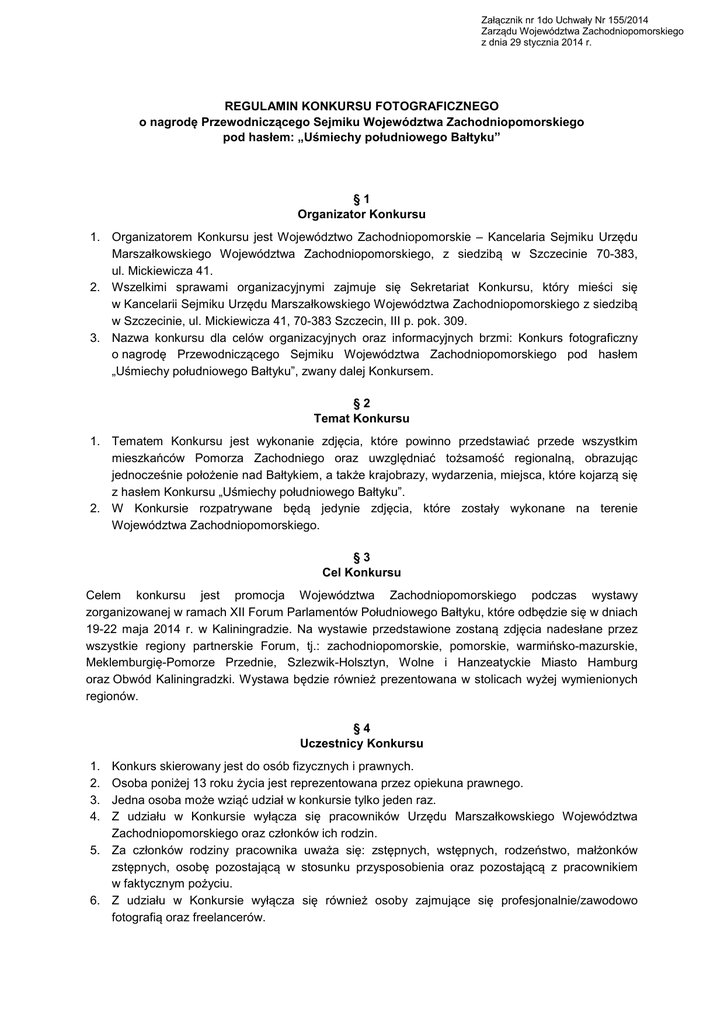Załącznik nr 1do Uchwały Nr 155/2014 Zarządu Województwa Zachodniopomorskiego z dnia 29 stycznia 2014 r. REGULAMIN KONKURSU FOTOGRAFICZNEGO o nagrodę Przewodniczącego Sejmiku Województwa Zachodniopomorskiego pod hasłem: „Uśmiechy południowego Bałtyku” §1 Organizator Konkursu 1. Organizatorem Konkursu jest Województwo Zachodniopomorskie – Kancelaria Sejmiku Urzędu Marszałkowskiego Województwa Zachodniopomorskiego, z siedzibą w Szczecinie 70-383, ul. Mickiewicza 41. 2. Wszelkimi sprawami organizacyjnymi zajmuje się Sekretariat Konkursu, który mieści się w Kancelarii Sejmiku Urzędu Marszałkowskiego Województwa Zachodniopomorskiego z siedzibą w Szczecinie, ul. Mickiewicza 41, 70-383 Szczecin, III p. pok. 309. 3. Nazwa konkursu dla celów organizacyjnych oraz informacyjnych brzmi: Konkurs fotograficzny o nagrodę Przewodniczącego Sejmiku Województwa Zachodniopomorskiego pod hasłem „Uśmiechy południowego Bałtyku”, zwany dalej Konkursem. §2 Temat Konkursu 1. Tematem Konkursu jest wykonanie zdjęcia, które powinno przedstawiać przede wszystkim mieszkańców Pomorza Zachodniego oraz uwzględniać tożsamość regionalną, obrazując jednocześnie położenie nad Bałtykiem, a także krajobrazy, wydarzenia, miejsca, które kojarzą się z hasłem Konkursu „Uśmiechy południowego Bałtyku”. 2. W Konkursie rozpatrywane będą jedynie zdjęcia, które zostały wykonane na terenie Województwa Zachodniopomorskiego. §3 Cel Konkursu Celem konkursu jest promocja Województwa Zachodniopomorskiego podczas wystawy zorganizowanej w ramach XII Forum Parlamentów Południowego Bałtyku, które odbędzie się w dniach 19-22 maja 2014 r. w Kaliningradzie. Na wystawie przedstawione zostaną zdjęcia nadesłane przez wszystkie regiony partnerskie Forum, tj.: zachodniopomorskie, pomorskie, warmińsko-mazurskie, Meklemburgię-Pomorze Przednie, Szlezwik-Holsztyn, Wolne i Hanzeatyckie Miasto Hamburg oraz Obwód Kaliningradzki. Wystawa będzie również prezentowana w stolicach wyżej wymienionych regionów. §4 Uczestnicy Konkursu 1. 2. 3. 4. Konkurs skierowany jest do osób fizycznych i prawnych. Osoba poniżej 13 roku życia jest reprezentowana przez opiekuna prawnego. Jedna osoba może wziąć udział w konkursie tylko jeden raz. Z udziału w Konkursie wyłącza się pracowników Urzędu Marszałkowskiego Województwa Zachodniopomorskiego oraz członków ich rodzin. 5. Za członków rodziny pracownika uważa się: zstępnych, wstępnych, rodzeństwo, małżonków zstępnych, osobę pozostającą w stosunku przysposobienia oraz pozostającą z pracownikiem w faktycznym pożyciu. 6. Z udziału w Konkursie wyłącza się również osoby zajmujące się profesjonalnie/zawodowo fotografią oraz freelancerów. §5 Zasady konkursu 1. Warunkiem uczestnictwa w konkursie jest przesłanie maksymalnie 3 (trzech) zdjęć, wraz z wypełnionym i podpisanym Formularzem zgłoszeniowym, stanowiącym Załącznik nr 1 do Regulaminu Konkursu. 2. Udział w Konkursie jest bezpłatny. 3. Zdjęcia oraz Formularz zgłoszeniowy, o którym mowa w § 5 ust. 1, należy nadsyłać w terminie od dnia 5 lutego do 15 kwietnia 2014 roku poprzez stronę internetową www.sejmik.wzp.pl. 4. Organizator nie przyjmuje prac nadesłanych tradycyjną drogą pocztową (w formie papierowej lub na płytach CD/DVD). 5. Nadesłane zdjęcia muszą być wolne od praw osób trzecich i w całości stanowić własność Uczestnika. 6. Do Konkursu mogą zostać zgłoszone tylko te fotografie, które nie zostały uprzednio nagrodzone bądź wyróżnione w żadnym innym konkursie. 7. Zgłoszone do konkursu fotografie powinny zostać przesłane w formacie plików JPEG, przy czym wielkość pliku nie może przekroczyć 10 MB; minimalna rozdzielczość zdjęcia: ok. 1200x1900 pix przy 75 DPI, optymalna rozdzielczość zdjęcia: 200 DPI 8. Przesłane fotografie powinny odzwierciedlać rzeczywisty sfotografowany obraz, co oznacza, że zabrania się dokonywania własnej obróbki dokonanego zdjęcia, np. poprzez usuwanie zobrazu lub dodawanie do obrazu zbędnych lub dodatkowych zdaniem Autora elementów. 9. Uczestnik Konkursu zgłaszając dane zdjęcie obowiązany jest odpowiednio je opisać poprzez wskazanie miejsca, gdzie zostało wykonane oraz daty, kiedy zostało zrobione. 10. Opisu, o którym mowa w ust. 9, dokonuje się w przeznaczonym do tego miejscu na stronie internetowej Organizatora wskazanej w ust. 3. 11. Organizator zastrzega sobie prawo wyłączenia z udziału w konkursie fotografii o niskiej jakości technicznej, przesłanych w złym formacie, rozdzielczości, wielkości pliku, na awersie których będą się znajdować jakiekolwiek znaki, cyfry (np. daty). 12. Uczestnik, poprzez przesłanie Formularza zgłoszeniowego do Konkursu, potwierdza, że jego zdjęcie/zdjęcia są jego własnością, nie narusza/naruszają praw, dóbr i godności osób trzecich, atakże, iż przysługują mu prawa autorskie do zdjęć w pełnym zakresie. Uczestnik potwierdza 13. 14. 15. 16. 17. również, iż zdjęcia te nie są w żaden sposób ograniczone lub obciążone na rzecz osób trzecich oraz że osoba przekazująca fotografie ma zgodę osób, których wizerunki utrwalono na fotografiach i uprawnienia do wyrażania zgody na wykorzystanie tych wizerunków. W przypadku wystąpienia przez osobę trzecią z roszczeniami wynikającymi z tytułu naruszenia praw określonych powyżej, uczestnik Konkursu zrekompensuje organizatorowi, jako osoba wyłącznie odpowiedzialna, koszty poniesione w związku ze skierowaniem przeciwko niemu roszczeń odszkodowawczych, pokrywając wszelkie zobowiązania organizatora, jakie powstaną z tego tytułu. W przypadku nagrodzenia lub wyróżnienia nadesłanego zdjęcia Uczestnik przenosi na Organizatora autorskie prawa majątkowe do zdjęć w zakresie rozporządzania nimi i korzystania z nich w rozumieniu ustawy z dnia 4 lutego 1994 roku o prawie autorskim i prawach pokrewnych (Dz. U. z 2006 r. Nr 90, po