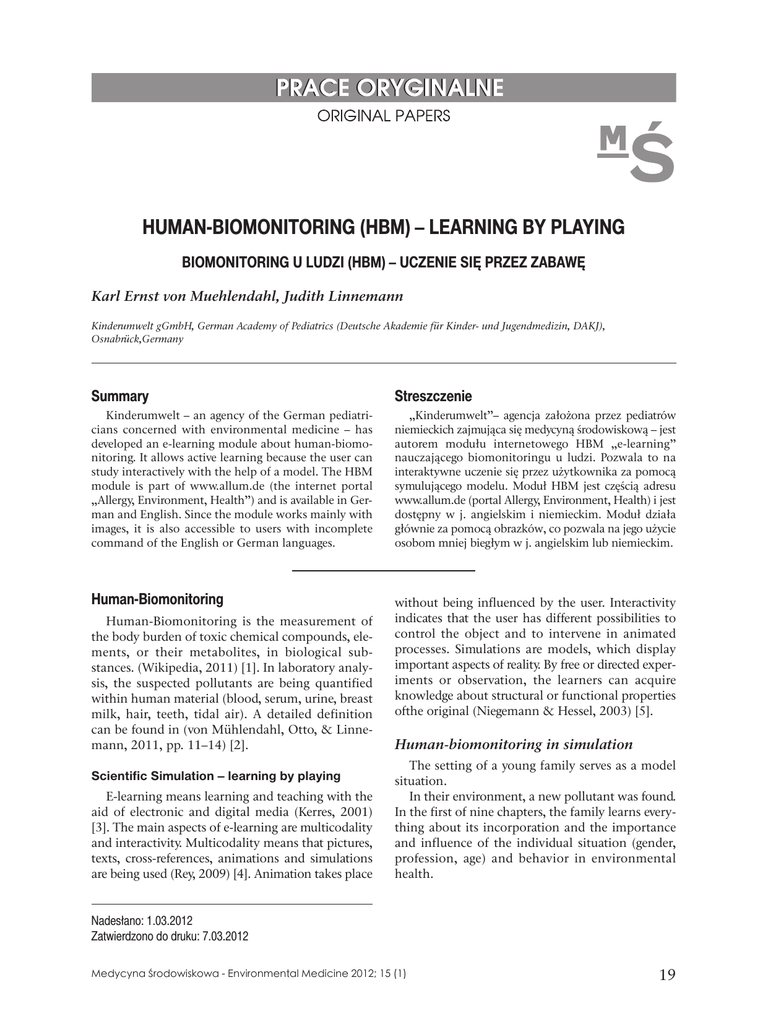 HUMAN-BIOMONITORING (HBM) – LEARNING BY PLAYING BIOMONITORING U LUDZI (HBM) – UCZENIE SIĘ PRZEZ ZABAWĘ Karl Ernst von Muehlendahl, Judith Linnemann Kinderumwelt gGmbH, German Academy of Pediatrics (Deutsche Akademie für Kinder- und Jugendmedizin, DAKJ), Osnabrück,Germany Summary Kinderumwelt – an agency of the German pediatricians concerned with environmental medicine – has developed an e-learning module about human-biomonitoring. It allows active learning because the user can study interactively with the help of a model. The HBM module is part of www.allum.de (the internet portal „Allergy, Environment, Health”) and is available in German and English. Since the module works mainly with images, it is also accessible to users with incomplete command of the English or German languages. Human-Biomonitoring Human-Biomonitoring is the measurement of the body burden of toxic chemical compounds, elements, or their metabolites, in biological substances. (Wikipedia, 2011) [1]. In laboratory analysis, the suspected pollutants are being quantified within human material (blood, serum, urine, breast milk, hair, teeth, tidal air). A detailed definition can be found in (von Mühlendahl, Otto, & Linnemann, 2011, pp. 11–14) [2]. Scientific Simulation – learning by playing E-learning means learning and teaching with the aid of electronic and digital media (Kerres, 2001) [3]. The main aspects of e-learning are multicodality and interactivity. Multicodality means that pictures, texts, cross-references, animations and simulations are being used (Rey, 2009) [4]. Animation takes place Streszczenie „Kinderumwelt”– agencja założona przez pediatrów niemieckich zajmująca się medycyną środowiskową – jest autorem modułu internetowego HBM „e-learning” nauczającego biomonitoringu u ludzi. Pozwala to na interaktywne uczenie się przez użytkownika za pomocą symulującego modelu. Moduł HBM jest częścią adresu www.allum.de (portal Allergy, Environment, Health) i jest dostępny w j. angielskim i niemieckim. Moduł działa głównie za pomocą obrazków, co pozwala na jego użycie osobom mniej biegłym w j. angielskim lub niemieckim. without being influenced by the user. Interactivity indicates that the user has different possibilities to control the object and to intervene in animated processes. Simulations are models, which display important aspects of reality. By free or directed experiments or observation, the learners can acquire knowledge about structural or functional properties ofthe original (Niegemann & Hessel, 2003) [5]. Human-biomonitoring in simulation The setting of a young family serves as a model situation. In their environment, a new pollutant was found. In the first of nine chapters, the family learns everything about its incorporation and the importance and influence of the individual situation (gender, profession, age) and behavior in environmental health. Nadesłano: 1.03.2012 Zatwierdzono do druku: 7.03.2012 Medycyna Środowiskowa - Environmental Medicine 2012; 15 (1) 19 The second chapter shows that uptake, metabolism, accumulation and excretion depend on the chemical properties of pollutants. To illustrate this, solvents, gases and heavy metals are used as examples. In the third chapter, the concept of the half-life period is explained. In addition to this, the user learns about basic cellu1ar processes and their selfregulating forces. Most important, in chapter nine, the similarities and differences between reference values and HBM values are outlined. At this point, the father from chapter 1 reappears. His individual measurement result is compared to the valid reference- and HBM-values. With the aid ofan animation, the derivation ofboth values is vividly described in chapter 9 (see figure 1). 1. 2. 3. 4. 5. 6. 7. 8. 9. 10. In each chapter, the user is asked to start the simulations and to conduct experiments. An „action window” explains what to do. Depending on the situation, a mouse click or a „mouse over” opens the required objects. The project is aimed at an interested public, health personnel and medical journalists who are seeking information on human-biomonitoring. Its didactical approach to the complex issue enables the use in vocational training schools and secondary schools. Opening chapters provide relevant information about environmental medicine and thus, if thoroughly read and understood, contribute significantly to successful risk communication. www.allum.de and the HBM module are free of charge. Have a look! HOW DO ENVIRONMENTAL POLLUTANTS ENTER THE BODY? WHAT IS THE FATE OF ENVIRONMENTAL POLLUTANTS AFTER ABSORPTION? HOW LONG DO POLLUTANTS STAY IN THE BODY? HOW DO ENVIRONMENTAL POLLUTANTS INTERFERE WITH CELLULAR PROCESSES? WHAT DOES THE DOSE–RESPONSE CURVE TELL US? WHO IS AT RISK AND AT WHAT AGE? WHAT TO MEASURE AND WHERE? WHERE TO MEASURE ENVIRONMENTAL CONTAMINENTS? WHAT DO INDIVIDUAL CONCENTRATIONS REALLY MEAN? OUTLOOK TOWARD MODERN BIO-MONITORING Figure 1. Human-biomonitioring in simulation Rycina 1. Symulacja biomonitoringu u ludzi (HBM) References 1. Wikipedia. Biomonitoring. Retrieved August 17, 2011 from http://en.wikipedia.org/wiki/Biomonitoring. May 31, 2011 2. Mühlendahl K.E. Otto M. & Linnemann J.: How to explain the importance of Human Biomonitoring. Medycyna Środowiskowa/Environmental Medicine 2011, 2 (14), 11–14. 3. Kerres M.: Multimediale und telemediale Lernumgebungen. Konzeption und Entwicklung. München: Oldenbourg Wissenschaftsverlag. 2001. 4. Rey G.D.: E-Learning. Theorien, Gestaltungsempfehlung und Forschung. Bern: HansHuber-Verlag. 2009. 5. Niegemann H.M. & Hessel S.: Kompendium E-Learning. Berlin: Springerverlag. 2003. 20 Address for correspondence: Prof. Karl Ernst v. Muehlendahl MD, PhD Kinderumwelt gGmbH der Deutschen Akademie für Kinder- und Jugendmedizin Westerbreite 7, 49084 Osnabrück Tel. +49 541 97789 -00 Fax +49 541 97789 -05 Kinderhospital Osnabrück Iburger Str. 187, 49082 Osnabrück [ema