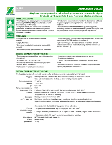 Nr 2245 ARMATERM COLLE 01/2013 Akrylowa masa tynkarska z domieszką cementu w momencie użycia Grubość użytkowa: 2 do 4 mm. Powłoka gładka, delikatna PRZEZNACZENIE * Przyklejanie płyt izolacyjnych w ramach izolacji termicznej ARMATERM (skonsultować ATE lub dokumentację techniczną). * Masy tynkarskie pod natryskowe powlekane granulatem marmurowym w ramach systemu wykończeniowego ARMATERM MARBRE (zobacz kartę tego produktu) * Wyrównanie powierzchni mineralnych (kamionka, szkliwo), miejscowe poprawki lub generalnie odnawianie powłok wodnych * Po wyschnięciu ARMATERM tworzy powłokę gładką, delikatną, gotową do pomalowania wszystkimi rodzajami farb lub pokrywanie innymi, nie zmydlającymi się farbami PODŁOŻE Podłoża mineralne budynku pozbawione powłoki: * Zbrojna warstwa podkładowa w systemie izolacji termicznej zgodnie z ATE (PSE, wełna mineralna…) * Cegła, terakota * Elementy konstrukcji murowanej surowej lub pokrytej Płyty konstrukcyjne dostosowane do budynków lekkich (włókno cementowe, materiał złożony drewno cement lub drewno polimer…) * Kamień wapienny, płyty szkliwione, kamionka CECHY CHARAKTERYSTYCZNE * Doskonała przyczepność do wszystkich podłoży mineralnych * Przepuszczalność pary wodnej * Wzmacnia stabilność mechaniczną systemu * Bardzo dobra podatność * Nakładanie ręczne lub mechaniczne * Szybkie schnięcie, twardnienie oraz malowanie * Produkt grzybobójczy * Cienka i regularna warstwa ułatwiająca wykończenie farbą * Produkt w roztworze wodnym: komfort i bezpieczeństwo użycia, przyjazny dla środowiska CECHY CHARAKTERYSTYCZNE Według obowiązujących norm lub w przypadku ich braku, zgodna z wewnętrznymi normami. Wygląd Sucha substancja Gęstość pH Temperatura zapłonu Zawartość COV Grubość Schnięcie o (20 C, 65% HR Masa plastyczna z domieszką 30% cementu szarego w momencie użycia. Czas użycia mieszaniny: około 2 godziny w temperaturze 20°C 77 ± 2% 1,50 ± 0,10 9,0 ± 0,5 Brak 2 g/l max. Wartość graniczna UE dla tego produktu (kat A/c): 40 g/l Grubość warstwy w systemie zbrojnym: 2,5 mm (PSE) - 4 mm (wełna mineralna) Wygładzanie: 2- 4 mm na warstwę Między warstwami: minimum 24 h Możliwość nałożenia drugiej warstwy swieże na świeże w systemie zbrojnym Wykończenie powłoką malarską: minimum 24 godziny w zależności od grubości warstwy Schnięcie może być opóźnione poprzez zimno lub wilgoć Zużycie przygotowanego produktu Klasyfikacja Kolory Opakowania * Przyklejanie / mocowanie płyt izolacyjnych: 3,0 - 3,5 kg/m 2 * Zbrojna warstwa podkładowa: 5,5 - 6 kg/m 2 na PSE i około 8,5 kg/m2 wełna mineralna * Reperacje: około 1,7 kg/m2 na mm grubości suchej warstwy NF T36-005: Rodzina II klasa 2b jasno - szary 25 kg Nr 2245 ARMATERM COLLE 01/2013 ZASTOSOWANIE Zapoznać się z ATE (Zakład Technicznego Zezwolenia Europejskiego) lub ze specyficznymi kartami technicznymi w ramach prac izolacji termicznej. Podkłady, przygotowanie i warunki stosowania powinny być zgodne z obowiązującymi normami / DTU i wymogami z zakresie sztuki malarskiej. Przygotowanie powierzchni Kłaść na podłożu suchym, zdrowym, spójnym i odpowiednio przygotowanym pod nałożenie produktu. Podłoża należy oczyścić z powłok malarskich oraz innych. Powinno być płaskie i regularne (nieregularność < 1cm) Podłoże może wymagać wykonania następujących operacji: * Usunięcia warstw źle przylegających lub tłustych poprzez skrobanie, szczotkowanie, piaskowanie, mycie pod ciśnieniem… * Usunięcia warstw farby organicznej oraz innych powłok organicznych * Usunięcie mikroorganizmów: FONGIMOUSSE PLUS * Kamionka, płyty szkliwione: usunięcie odstających płytek Nakładanie produktu * Przygotować masę dodając do kleju ARMATERM COLLE 30 % cementu szarego (typu CPJ 32,5 lub 42,5). Dokładnie wymieszać za pomocą mieszadła automatycznego aż do otrzymania jednolitej, plastycznej masy bez grudek. * Czas użycia mieszanki: około 2h w temperaturze 20°C * Nałożyć 1 lub 2 równe warstwy w zależności od stopnia uszkodzenia odnawianych podłoży: - w przypadku popękanych ścian oraz w przypadku prac zabezpieczających powierzchni szczególnie wystawionych na kontakt (tj. krawędzie fliz, ścianki działowe) możliwe grutowanie poprzez przyklejanie zbrojenia typu R131A101 lub 3280/93 na pierwszą warstwę tynku i ponowne nałożenie tynku (możliwość ponownego nałożenia naświeżo lub po wyschnięciu pierwszej warstwy). Kładąc zbrojenie należy zakładać pasy brzegami na szerokość 10 cm. - W innych przypadkach (gdy nie stosujemy zbrojenia) przez położeniem drugiej warstwy musi upłynąć minimum 24 godziny. Narzędzia * Nakładanie ręczne: paca ze stali nierdzewnej, kielnia * Nakładanie mechaniczne: agregat tynkarski (dysza 6-7 mm) Rozcieńczanie: produkt gotowy do użycia po dodaniu cementu. Do 2% wody przy upalnej pogodzie Mycie narzędzi: wodą, bezpośrednio po użyciu Warunki nakładania * Temperatura podłoża i otoczenia powyżej 5°C (ostrożnie jeśli temperatura > 35°C) * Przy suchej pogodzie, z dala od silnego wiatru oraz bezpośredniego działania promieni słonecznych * Nakładanie powłoki po całkowitym wyschnięciu ARMATERM COLLE PRZECHOWYWANIE BEZPIECZEŃSTWO I HIGIENA PRACY * 24 miesiące w oryginalnym zamkniętym opakowaniu Zapoznać się z : * Etykietą informacyjną zasad bezpieczeństwa na opakowaniu * Chronić przed wilgocią, mrozem i temperaturami powyżej 35ºC. * kartą produktu niebezpiecznego zamieszczoną na stronie: www.zolpan.fr UWAGA: Zawarte informacje mają tylko charakter orientacyjny i nie mogą zastąpić instrukcji postępowania dostosowanego do natury oraz stanu konkretnego podłoża. Przedstawiciel ZOLPAN S.A. NIP PL872210886 REGON 691564444 33-100Tarnów, ul.Tuchowska 25 tel. (014) 626 80 20, tel/fax. (014) 626 80 21 www.zolpan-tokato.home.pl, e-mail: [email protected] Sąd Rejonowy dla Krakowa Śródmieścia w Krakowie XII Wydział Gospodarcz