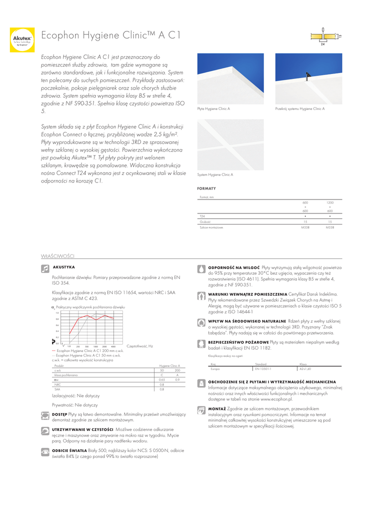 Ecophon Hygiene Clinic™ A C1 Ecophon Hygiene Clinic A C1 jest przeznaczony do pomieszczeń służby zdrowia, tam gdzie wymagane są zarówno standardowe, jak i funkcjonalne rozwiązania. System ten polecamy do suchych pomieszczeń. Przykłady zastosowań: poczekalnie, pokoje pielęgniarek oraz sale chorych służbie zdrowia. System spełnia wymagania klasy B5 w strefie 4, zgodnie z NF S90-351. Spełnia klasę czystości powietrza ISO 5. System składa się z płyt Ecophon Hygiene Clinic A i konstrukcji Ecophon Connect o łącznej, przybliżonej wadze 2,5 kg/m². Płyty wyprodukowane są w technologii 3RD ze sprasowanej wełny szklanej o wysokiej gęstości. Powierzchnia wykończona jest powłoką Akutex™ T. Tył płyty pokryty jest welonem szklanym, krawędzie są pomalowane. Widoczna konstrukcja nośna Connect T24 wykonana jest z ocynkowanej stali w klasie odporności na korozję C1. Płyta Hygiene Clinic A Przekrój systemu Hygiene Clinic A System Hygiene Clinic A Formaty Format, mm 600 x 600 1200 x 600 T24 • • Grubość 15 15 M338 M338 Szkice montażowe. Właściwości Odporność na wilgoć Płyty wytrzymują stałą wilgotność powietrza do 95% przy temperaturze 30°C bez ugięcia, wypaczenia czy też rozwarstwienia (ISO 4611). Spełnia wymagania klasy B5 w strefie 4, zgodnie z NF S90-351. Akustyka Pochłanianie dźwięku: Pomiary przeprowadzone zgodnie z normą EN ISO 354. Klasyfikacja zgodnie z normą EN ISO 11654, wartości NRC i SAA zgodnie z ASTM C 423. Warunki wewnątrz pomieszczenia Certyfikat Dansk Indeklima. Płyty rekomendowane przez Szwedzki Związek Chorych na Astmę i Alergię, mogą być używane w pomieszczeniach o klasie czystości ISO 5 zgodnie z ISO 14644-1 αp Praktyczny współczynnik pochłaniania dźwięku 1.0 0.8 Rdzeń płyty z wełny szklanej o wysokiej gęstości, wykonanej w technologii 3RD. Przyznany “Znak Łabędzia”. Płyty nadają się w całości do powtórnego przetworzenia. Wpływ na środowisko naturalne 0.6 0.4 0.2 0.0 125 250 500 1000 2000 4000 — Ecophon Hygiene Clinic A C1 200 mm c.w.k. Bezpieczeństwo pożarowe Płyty są materiałem niepalnym według badań i klasyfikacji EN ISO 1182. Częstotliwość, Hz ···· Ecophon Hygiene Clinic A C1 50 mm c.w.k. c.w.k. = całkowita wysokość konstrukcyjna Produkt c.w.k klasa pochłaniania αw NRC SAA Klasyfikacja reakcji na ogień Hygiene Clinic A 50 200 C A 0,65 0,9 0,8 0,8 Izolacyjność: Nie dotyczy Prywatność: Nie dotyczy Dostęp Płyty są łatwo demontowalne. Minimalny prześwit umożliwiający demontaż zgodnie ze szkicem montażowym. Utrzymywanie w czystości Możliwe codzienne odkurzanie ręczne i maszynowe oraz zmywanie na mokro raz w tygodniu. Mycie parą. Odporny na działanie pary nadtlenku wodoru. Odbicie światła Biały 500, najbliższy kolor NCS: S 0500-N, odbicie światła 84% (z czego ponad 99% to światło rozproszone) Kraj Europa kg Standard EN 13501-1 Klasa A2-s1,d0 Obchodzenie się z płytami i wytrzymałość mechaniczna Informacje dotyczące maksymalnego obciążenia użytkowego, minimalnej nośności oraz innych właściwości funkcjonalnych i mechanicznych dostępne w tabeli na stronie www.ecophon.pl. Montaż Zgodnie ze szkicem montażowym, przewodnikiem instalacyjnym oraz rysunkami pomocniczymi. Informacje na temat minimalnej całkowitej wysokości konstrukcyjnej umieszczone są pod szkicem montażowym w specyfikacji ilościowej. M338 Szkic montażowy (M338): Ecophon Hygiene Clinic A C1 Specyfikacja ilościowa (wyłączając odpady) Format, mm 600x600 1200x600 1,4/m² 1 Hygiene Clinic A 2,8/m² 2 Connect T24 Profil główny, co 1200 mm (maks. odległość od ściany 300 mm) 0,9m/m² 0,9m/m² 3 Connect T24 Profil poprzeczny, L=1200 mm, co 600 mm 1,7m/m² 1,7m/m² - 4 Connect T24 Profil poprzeczny, L=600 mm 0,9m/m² 5 Connect Wieszak regulowany, co 1200 mm (maks. odległość od ściany 600 mm) 0,7/m² 0,7/m² 6 Connect Uchwyt do wieszaka regulowanego 0,7/m² 0,7/m² 7 Montaż bezpośredni: Connect Blaszka do mocowania bezpośredniego, mocowana co 1200 mm 0,7/m² 0,7/m² 8 Connect Kątownik przyścienny, mocowany co 300 mm wg obmiarów wg obmiarów 9 Connect Listwa cieniowa, mocowana co 300mm wg obmiarów wg obmiarów Δ Minimalna całkowita wysokość konstrukcyjna: 100 mm przy użyciu wieszaków regulowanych, 50 mm przy użyciu zamocowań bezpośrednich - - δ Najmniejszy prześwit umożliwiający demontaż: 120 mm - - Format, mm Patrz Specyfikacja ilościowa Podwieszenie przy użyciu wieszaka regulowanego i uchwytu Podwieszenie przy użyciu mocowania bezpośredniego Maks. obciążenie użytkowe (N) Min. nośność (N) 600x600 50 160 1200x600 50 160 Obciążenie użytkowe/ nośność