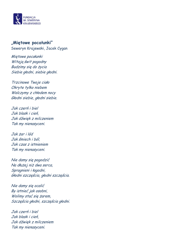 „Miętowe pocałunki” Seweryn Krajewski, Jacek Cygan Miętowe pocałunki Witają świt pogodny Budzimy się do życia Siebie głodni, siebie głodni. Trzcinowe Twoje ciało Okryte tylko niebem Walczymy z chłodem nocy Głodni siebie, głodni siebie. Jak czerń i biel Jak blask i cień, Jak dźwięk z milczeniem Tak my nienasyceni. Jak żar i lód Jak śmiech i ból, Jak czas z istnieniem Tak my nienasyceni. Nie damy się pogodzić Na dłużej niż dwa serca, Spragnieni i łagodni, Głodni szczęścia, głodni szczęścia. Nie damy się ocalić By istnieć jak osobni, Wolimy stać się żarem, Szczęścia głodni, szczęścia głodni. Jak czerń i biel Jak blask i cień, Jak dźwięk z milczeniem Tak my nienasyceni. Jak żar i lód Jak śmiech i ból, Jak czas z istnieniem Tak my nienasyceni. Jak czerń i biel Jak blask i cień, Jak dźwięk z milczeniem Tak my nienasyceni.