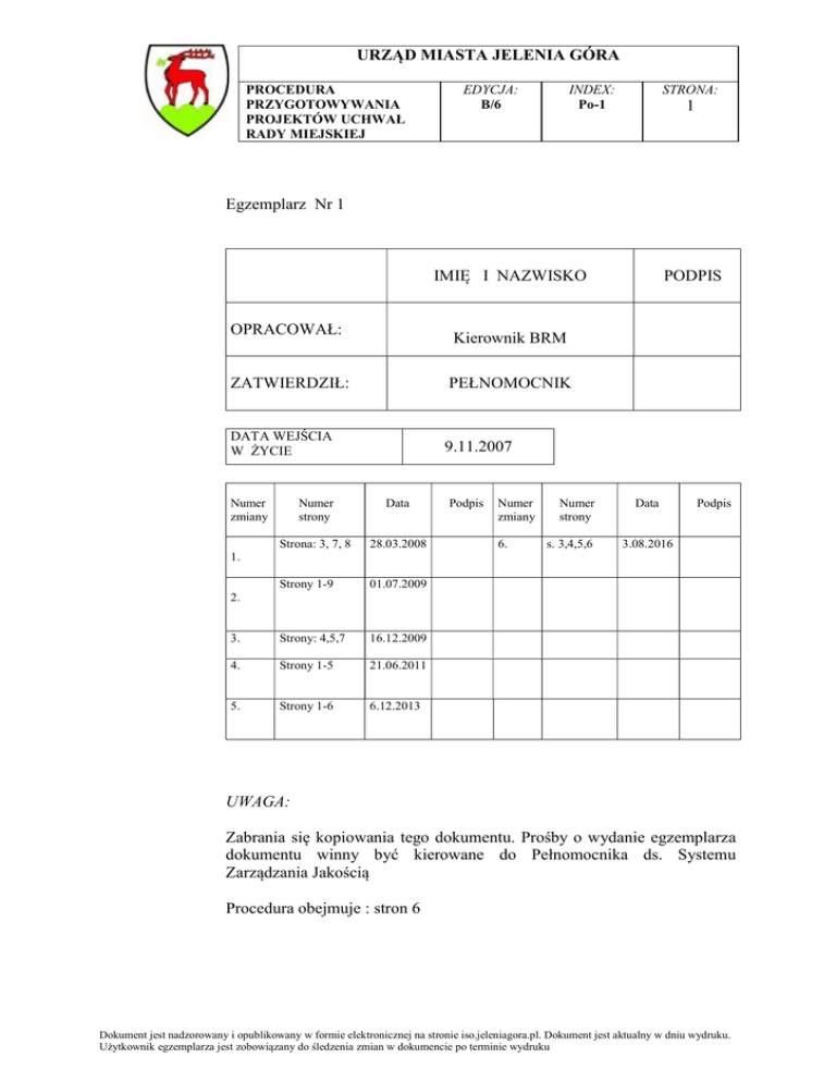 URZĄD MIASTA JELENIA GÓRA PROCEDURA PRZYGOTOWYWANIA PROJEKTÓW UCHWAŁ RADY MIEJSKIEJ EDYCJA: B/6 INDEX: Po-1 STRONA: 1 Egzemplarz Nr 1 IMIĘ I NAZWISKO OPRACOWAŁ: Kierownik BRM ZATWIERDZIŁ: PEŁNOMOCNIK DATA WEJŚCIA W ŻYCIE Numer zmiany 9.11.2007 Numer strony Data Strona: 3, 7, 8 28.03.2008 Strony 1-9 01.07.2009 3. Strony: 4,5,7 16.12.2009 4. Strony 1-5 21.06.2011 5. Strony 1-6 6.12.2013 1. 2. PODPIS Podpis Numer zmiany 6. Numer strony s. 3,4,5,6 Data Podpis 3.08.2016 UWAGA: Zabrania się kopiowania tego dokumentu. Prośby o wydanie egzemplarza dokumentu winny być kierowane do Pełnomocnika ds. Systemu Zarządzania Jakością Procedura obejmuje : stron 6 Dokument jest nadzorowany i opublikowany w formie elektronicznej na stronie iso.jeleniagora.pl. Dokument jest aktualny w dniu wydruku. Użytkownik egzemplarza jest zobowiązany do śledzenia zmian w dokumencie po terminie wydruku URZĄD MIASTA JELENIA GÓRA PROCEDURA PRZYGOTOWYWANIA PROJEKTÓW UCHWAŁ RADY MIEJSKIEJ EDYCJA: B/6 INDEX: Po-1 STRONA: 2 Potrzeba przygotowania Uchwały Pracownik merytoryczny przygotowanie projektu uchwały 1 Naczelnik lub os. upoważniona Przegląd 2 Radca Prawny Opinia 3 Skarbnik Miasta lub osoba upoważniona w przypadku powstania skutków finansowych Opinia 4* Prezydent Miasta lub osoba upoważniona – podpisanie uzasadnienia do projektu uchwały 5 Pracownik merytoryczny Przekazanie projektu Uchwały w formie papierowej i PDF do Biura Rady Miejskiej Radni, grupa Radnych, Komisje, grupa co najmniej 500 mieszkańców Projekt Uchwały Biuro Rady Miejskiej Potwierdzenie wpływu projektu uchwały 6 Przewodniczący Rady Miejskiej Dekretacja 7 Pracownik BRM Wpis do rejestru projektów uchwał 8 Pracownik BRM Umieszczenie projektu Uchwały na BIP 9 Dokument jest nadzorowany i opublikowany w formie elektronicznej na stronie iso.jeleniagora.pl. Dokument jest aktualny w dniu wydruku. Użytkownik egzemplarza jest zobowiązany do śledzenia zmian w dokumencie po terminie wydruku URZĄD MIASTA JELENIA GÓRA PROCEDURA PRZYGOTOWYWANIA PROJEKTÓW UCHWAŁ RADY MIEJSKIEJ EDYCJA: B/6 INDEX: Po-1 STRONA: 3 10 Komisje Rady Miejskiej Opiniowanie Możliwe zakończenie procedury 11 Sesja Rady Miejskiej Możliwe zakończenie procedury Pracownik BRM Nadanie numeru i daty na podjętej Uchwale – wpis do rejestru uchwał Pracownik BRM Przekazanie autopoprawek i/lub poprawek w formie pisemnej lub ustnej do Wydziału merytorycznego Pracownik merytoryczny -przygotowanie Uchwały zgodnej z treścią podjętą na Sesji w formacie XML 12 13* 14 Naczelnik lub os. upoważniona - Akceptacja w ESOD Intradok 15 Kierownik BRM lub os. upoważniona Adnotacja za zgodność z treścią podjętej uchwały 16 Podpisanie Uchwały przez Przewodniczącego Rady Miejskiej lub os. upoważnioną Pracownik BRM Wpięcie do Rejestru Uchwał, Publikacja uchwały w BIP i przekazanie do organu nadzoru 17 18 1. Wymagania dotyczące produktu 1.1. Ustawa o samorządzie gminnym z dnia 8 marca 1990 r. (Dz. U. z 2016 r. poz. 446) Dokument jest nadzorowany i opublikowany w formie elektronicznej na stronie iso.jeleniagora.pl. Dokument jest aktualny w dniu wydruku. Użytkownik egzemplarza jest zobowiązany do śledzenia zmian w dokumencie po terminie wydruku URZĄD MIASTA JELENIA GÓRA EDYCJA: B/6 PROCEDURA PRZYGOTOWYWANIA PROJEKTÓW UCHWAŁ RADY MIEJSKIEJ INDEX: Po-1 STRONA: 4 1.2. Rozporządzenie Prezesa Rady Ministrów z dnia 20 czerwca 2002 roku w sprawie „Zasad techniki prawodawczej” (Dz. U. z 2016 r. poz. 283). 1.3. Statut Miasta Jeleniej Góry 1.4. Uchwała Nr 309/XXV/2000 Rady Miejskiej Jeleniej Góry z dnia 27 czerwca 2000 r. w sprawie określania zasad wykonywania inicjatywy uchwałodawczej mieszkańców. 1.5. Zarządzenie Nr 0152-197/V/09 Prezydenta Miasta Jeleniej Góry z dnia 16 grudnia 2009 r. w sprawie wprowadzenia Edytora Aktów Prawnych XML w Urzędzie Miasta Jelenia Góra. 2. Cel procedury 2.1. Usprawnienie trybu stanowienia uchwał Rady Miejskiej, tak aby w ciągu roku nie wystąpiło więcej niż 10% uchwał uchylonych przez organ nadzorczy. 3. Wytyczne. 3.1.Do Biura Rady Miejskiej przedkłada się projekt uchwały z nadrukowaną metryką. 3.2.Ustala się metrykę projektu uchwały zgodnie z wzorem: L.p. Zakres kompetencji 1. Imię i nazwisko autora projektu Przygotował 2. Naczelnik lub osoba upoważniona Przegląd 3. Radca Prawny 4. Skarbnik Miasta lub osoba upoważniona w przypadku powstania skutków finansowych Opinia radcy prawnego Data i podpis Opinia skarbnika 3.3.Metrykę nadrukowuje się na odwrotnej stronie ostatniej strony projektu uchwały. 3.4.Osoby, składające podpisy w metryce odpowiedzialność w zakresie swoich kompetencji. projektu uchwały, ponoszą 3.5.Każdy projekt uchwały zawiera uzasadnienie, które z prawej strony podpisuje Prezydent lub osoba upoważniona. Dokument jest nadzorowany i opublikowany w formie elektronicznej na stronie iso.jeleniagora.pl. Dokument jest aktualny w dniu wydruku. Użytkownik egzemplarza jest zobowiązany do śledzenia zmian w dokumencie po terminie wydruku URZĄD MIASTA JELENIA GÓRA EDYCJA: B/6 PROCEDURA PRZYGOTOWYWANIA PROJEKTÓW UCHWAŁ RADY MIEJSKIEJ INDEX: Po-1 STRONA: 5 3.6.Każdy projekt uchwały musi zostać sporządzony w formacie XML w Edytorze Aktów Prawnych XML, a następnie w wersji papierowej oraz elektronicznej przekazany do Biura Rady Miejskiej. Forma elektroniczna powinna być przekazana poprzez Intradok w formacie PDF. 3.7. Autopoprawki są zgłaszane do Biura Rady Miejskiej przed Sesją Rady Miejskiej w formie papierowej i zaakceptowane przez Prezydenta lub osobę upoważnioną. 3.8.Wszystkie projekty uchwał Rady Miejskiej, po uzyskaniu opinii radcy prawnego, przed przekazaniem do Biura Rady Miejskiej należy przekazywać do wglądu do Sekretarza Miasta. 4. Wykaz zapisów Nazwa zapisu Oznaczenie Forma zapisu zapisu Osoba realizująca dany zapis Osoba odpowiedzialna za przechowywanie zapisu miejsce Podpis w metryce projektu uchwały 1 D Pracownik merytoryczny Pracowni