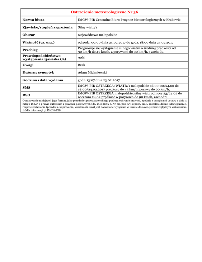 Ostrzeżenie meteorologiczne Nr 36 Nazwa biura IMGW-PIB Centralne Biuro Prognoz Meteorologicznych w Krakowie Zjawisko/stopień zagrożenia Silny wiatr/1 Obszar województwo małopolskie Ważność (cz. urz.) od godz. 00:00 dnia 24.02.2017 do godz. 18:00 dnia 24.02.2017 Przebieg Prognozuje się wystąpienie silnego wiatru o średniej prędkości od 30 km/h do 45 km/h, z porywami do 90 km/h, z zachodu. Prawdopodobieństwo wystąpienia zjawiska (%) 90% Uwagi Brak Dyżurny synoptyk Adam Michniewski Godzina i data wydania godz. 13:07 dnia 23.02.2017 SMS RSO IMGW-PIB OSTRZEGA: WIATR/1 malopolskie od 00:00/24.02 do 18:00/24.02.2017 predkosc do 45 km/h, porywy do 90 km/h, IMGW-PIB OSTRZEGA małopolskie, silny wiatr od nocy 23/24.02 do wieczora 24.02.prędkość w porywach do 90 km/h, zachodni. Opracowanie niniejsze i jego format, jako przedmiot prawa autorskiego podlega ochronie prawnej, zgodnie z przepisami ustawy z dnia 4 lutego 1994r o prawie autorskim i prawach pokrewnych (dz. U. z 2006 r. Nr 90, poz. 631 z późn. zm.). Wszelkie dalsze udostępnianie, rozpowszechnianie (przedruk, kopiowanie, wiadomość sms) jest dozwolone wyłącznie w formie dosłownej z bezwzględnym wskazaniem źródła informacji tj. IMGW-PIB.