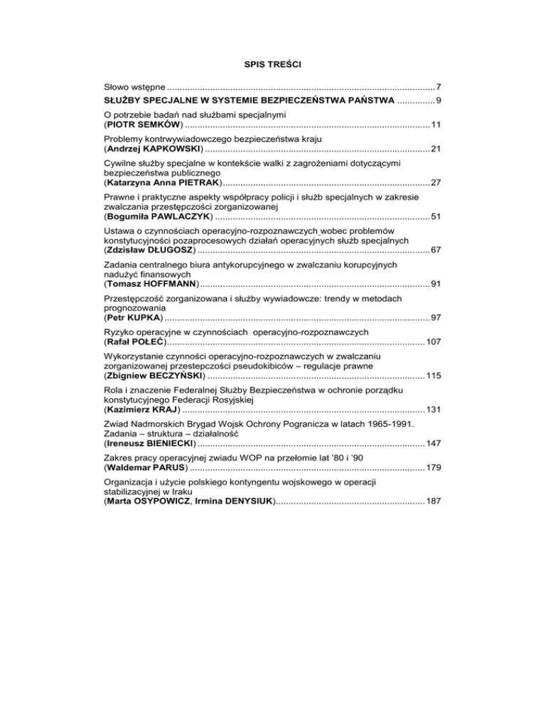 SPIS TREŚCI Słowo wstępne .......................................................................................................... 7 SŁUŻBY SPECJALNE W SYSTEMIE BEZPIECZEŃSTWA PAŃSTWA ............... 9 O potrzebie badań nad służbami specjalnymi (PIOTR SEMKÓW) ................................................................................................. 11 Problemy kontrwywiadowczego bezpieczeństwa kraju (Andrzej KAPKOWSKI) ......................................................................................... 21 Cywilne służby specjalne w kontekście walki z zagrożeniami dotyczącymi bezpieczeństwa publicznego (Katarzyna Anna PIETRAK) .................................................................................. 27 Prawne i praktyczne aspekty współpracy policji i służb specjalnych w zakresie zwalczania przestępczości zorganizowanej (Bogumiła PAWLACZYK) ..................................................................................... 51 Ustawa o czynnościach operacyjno-rozpoznawczych wobec problemów konstytucyjności pozaprocesowych działań operacyjnych służb specjalnych (Zdzisław DŁUGOSZ) ............................................................................................ 67 Zadania centralnego biura antykorupcyjnego w zwalczaniu korupcyjnych nadużyć finansowych (Tomasz HOFFMANN) ........................................................................................... 91 Przestępczość zorganizowana i służby wywiadowcze: trendy w metodach prognozowania (Petr KUPKA) ......................................................................................................... 97 Ryzyko operacyjne w czynnościach operacyjno-rozpoznawczych (Rafał POŁEĆ) ...................................................................................................... 107 Wykorzystanie czynności operacyjno-rozpoznawczych w zwalczaniu zorganizowanej przestepczości pseudokibiców – regulacje prawne (Zbigniew BECZYŃSKI) ...................................................................................... 115 Rola i znaczenie Federalnej Służby Bezpieczeństwa w ochronie porządku konstytucyjnego Federacji Rosyjskiej (Kazimierz KRAJ) ................................................................................................ 131 Zwiad Nadmorskich Brygad Wojsk Ochrony Pogranicza w latach 1965-1991. Zadania – struktura – działalność (Ireneusz BIENIECKI) .......................................................................................... 147 Zakres pracy operacyjnej zwiadu WOP na przełomie lat ’80 i ’90 (Waldemar PARUS) ............................................................................................. 179 Organizacja i użycie polskiego kontyngentu wojskowego w operacji stabilizacyjnej w Iraku (Marta OSYPOWICZ, Irmina DENYSIUK)........................................................... 187 Szkolenie polskich kontyngentów wojskowych do działań w ramach międzynarodowej koalicji antyterorystycznej (Maciej MARCZYK) .............................................................................................. 199 PRAKTYCZNE ASPEKTY BEZPIECZEŃSTWA ................................................. 209 Typologia zagrożeń bezpieczeństwa człowieka (Józef STĘPAK) ................................................................................................... 211 Zarządzanie kryzysowe w aspekcie imprez masowych (Euro 2012) (Tomasz BĄK) ...................................................................................................... 221 Bezpieczeństwo cyberprzestrzeni (Zygmunt PŁOSZYŃSKI)..................................................................................... 235 Krajowy system wykrywania skażeń i alarmowania – rola i zadania w sytuacjach kryzysowych (Bogdan MICHAILIUK) ........................................................................................ 249 Rezultaty współpracy organów administracji publicznej w zarządzaniu bezpieczeństwem na przykładzie wybranych jednostek powiatu puckiego (Cezary TATARCZUK) ......................................................................................... 271 Współpraca cywilno-wojskowa w sytuacjach kryzysowych (Jerzy PYKACZ) ................................................................................................... 291 Bezpieczeństwo instytucji penitencjarnych (Andrzej PIOTROWSKI, Iwona KRÓLIKOWSKA) ............................................. 305 Transport materiałów niebezpiecznych – wybrane problemy (Krzysztof PAJĄK, Ewelina KRYGIER) ............................................................. 319 Wykrywanie zagrożeń w wprzestrzeni powietrznej (Andrzej GAŁECKI) ............................................................................................. 327 Strategia bezpieczeństwa państwa na tle współczesnych zagrożeń (Stanisław ZAROBNY) ........................................................................................ 343 Determinanty bezpieczeństwa gospodarczego państw regionu Morza Bałtyckiego. Studia przypadków (Marek GRZYBOWSKI)........................................................................................ 363 Znaczenie zagadnienia bezpieczeństwa polskich portów morskich w polityce morskiej Rzeczypospolitej Polskiej (Magdalena WINIARSKA) ................................................................................... 387 Miejsce i zadania Straży Granicznej w realizacji zadań SAR na Morzu Bałtyckim (Adam GĘBICZ) ................................................................................................... 401 Ekonomiczne aspekty zagrożeń dla bezpieczeństwa w transporcie morskim i lotniczym – zadania dla polityki bezpieczeństwa (Janusz TOMASZEWSKI).................................................................................... 411 Próby przeciwdziałania terroryzmowi państwowemu – stosunek różnych państw do poszczególnych aktów terroryzmu (Marian 
