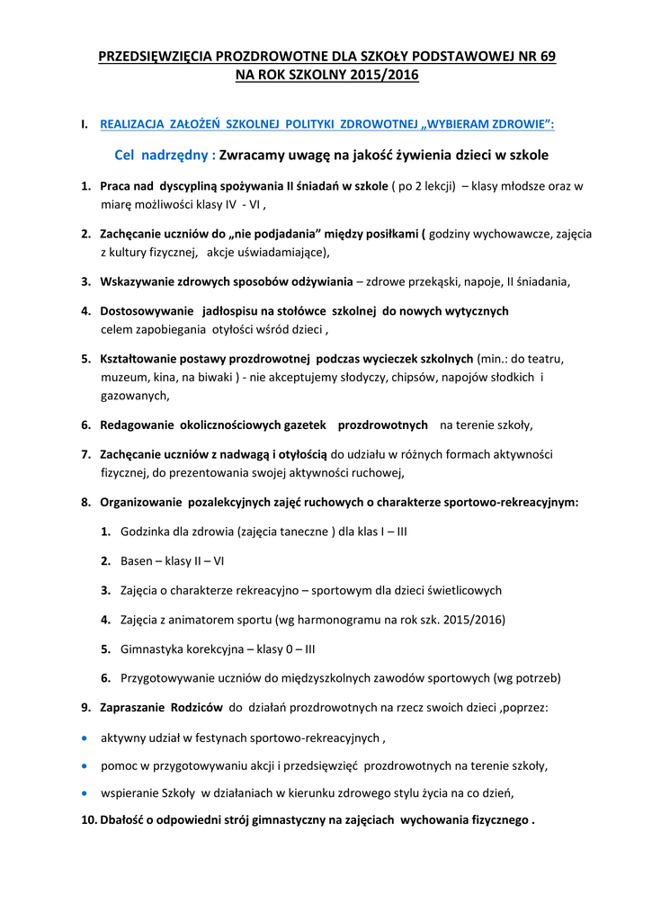 PRZEDSIĘWZIĘCIA PROZDROWOTNE DLA SZKOŁY PODSTAWOWEJ NR 69 NA ROK SZKOLNY 2015/2016 I. REALIZACJA ZAŁOŻEŃ SZKOLNEJ POLITYKI ZDROWOTNEJ „WYBIERAM ZDROWIE”: Cel nadrzędny : Zwracamy uwagę na jakość żywienia dzieci w szkole 1. Praca nad dyscypliną spożywania II śniadań w szkole ( po 2 lekcji) – klasy młodsze oraz w miarę możliwości klasy IV - VI , 2. Zachęcanie uczniów do „nie podjadania” między posiłkami ( godziny wychowawcze, zajęcia z kultury fizycznej, akcje uświadamiające), 3. Wskazywanie zdrowych sposobów odżywiania – zdrowe przekąski, napoje, II śniadania, 4. Dostosowywanie jadłospisu na stołówce szkolnej do nowych wytycznych celem zapobiegania otyłości wśród dzieci , 5. Kształtowanie postawy prozdrowotnej podczas wycieczek szkolnych (min.: do teatru, muzeum, kina, na biwaki ) - nie akceptujemy słodyczy, chipsów, napojów słodkich i gazowanych, 6. Redagowanie okolicznościowych gazetek prozdrowotnych na terenie szkoły, 7. Zachęcanie uczniów z nadwagą i otyłością do udziału w różnych formach aktywności fizycznej, do prezentowania swojej aktywności ruchowej, 8. Organizowanie pozalekcyjnych zajęć ruchowych o charakterze sportowo-rekreacyjnym: 1. Godzinka dla zdrowia (zajęcia taneczne ) dla klas I – III 2. Basen – klasy II – VI 3. Zajęcia o charakterze rekreacyjno – sportowym dla dzieci świetlicowych 4. Zajęcia z animatorem sportu (wg harmonogramu na rok szk. 2015/2016) 5. Gimnastyka korekcyjna – klasy 0 – III 6. Przygotowywanie uczniów do międzyszkolnych zawodów sportowych (wg potrzeb) 9. Zapraszanie Rodziców do działań prozdrowotnych na rzecz swoich dzieci ,poprzez: aktywny udział w festynach sportowo-rekreacyjnych , pomoc w przygotowywaniu akcji i przedsięwzięć prozdrowotnych na terenie szkoły, wspieranie Szkoły w działaniach w kierunku zdrowego stylu życia na co dzień, 10. Dbałość o odpowiedni strój gimnastyczny na zajęciach wychowania fizycznego . II. KONTYNUACJA PROGRAMU „MAŁY MISTRZ” - w tym roku szkolnym program skierowany jest do uczniów klas I i II. Celem głównym programu jest motywowanie uczniów do aktywności fizycznej poprzez zdobywanie różnych sprawności ruchowych: min. rowerzysta – turysta, gimnastyk – tancerz, piłkarz, lekkoatleta, narciarz. Program realizowany jest w ramach planowych zajęć WF. III. KONTYNUACJA INNYCH DZIAŁAŃ PROZDROWOTNYCH 1. „Kolorowy Dzień” - kontynuacja działań (2 x na semestr) - dzień , w którym będzie obowiązywał nie tylko ubiór, ale i dostosowany do niego kolor spożywanych owoców lub warzyw. 2. „Szklanka mleka” i „5 porcji warzyw i owoców” - kontynuacja z poprzednich lat . 3. „Mycia ząbków po jedzeniu” – kontynuacja działań – klasy 0. 4. Promowanie higieny osobistej - prowadzenie całorocznego przeglądu czystości klas – w tym noszenie chusteczek, zmiana obuwia, czystość rąk, ubrań. 5. „Sposób na przerwę” - przygotowanie pomysłów i ciekawych zabaw , które można zrealizować podczas przerwy, np: zabawy ruchowe, tańce, gry planszowe, rebusy. 6. Realizacja treści z zakresu pierwszej pomocy przedmedycznej - Realizacja dwóch godzin z zakresu pierwszej pomocy na lekcjach WF w klasach IV – VI oraz w klasach młodszych elementy I pomocy w ramach zajęć zintegrowanych. HARMONOGRAM DZIAŁAŃ PROZDROWOTNYCH skierowanych do uczniów MIESIĄC WRZESIEŃ DZIAŁANIE Rozmowy nt. zdrowia , bezpieczeństwa , higieny pracy i wypoczynku , ODPOWIEDZIALNI Wychowawcy, nauczyciele WF Powołanie zespołu uczniowskiego ds. promocji zdrowia Rozpoczęcie całorocznych akcji prozdrowotnych , PAŹDZIERNIK LISTOPAD zespół ds. promocji zdrowia „Urodzinki witaminki” - dni poświęcone różnym owocom i N-le klas młodszych warzywom w klasach 0 – III z wykorzystaniem różnych form i metod pracy Dzień Pomarańczowy – akcja „Jemy zdrowo, kolorowo!” dla klas IV – VI zespół „Dzień Wody” – kontynuacja działań ,akcja propagująca picie czyste wody Zespół ds. promocji zdrowia GRUDZIEŃ STYCZEŃ LUTY MARZEC KWIECIEŃ Aktywna zima : Turnieje międzyklasowe klas IV – VI N-le wf Sprawnościowe tory przeszkód klas młodszych n – le klas młodszych Dzień Biały - akcja „Jemy zdrowo, kolorowo!” zespół Warsztaty z Pierwszej Pomocy Przedmedycznej : „Bezpieczna zima” Zespół ,n-le WF, wychowawcy klas 0 III ,,Szkoła pleców” - Przeprowadzenie zajęć propagujących I.Uba właściwą postawę podczas nauki i zabawy dla uczniów klas 0-III uczestniczących w zajęciach gimnastyki korekcyjnej Dzień Zdrowia – impreza ogólnoszkolna promująca zdrowy styl życia Zespół ds. promocji zdrowia MAJ „Trzymaj Formę!” – konkurs wiedzy i sprawności dla uczniów klas IV – V . Zespół CZERWIEC Dzień Sportu - podsumowanie całorocznych działań , zawody międzyklasowe, rywalizacja indywidualna; N – le wf Egzamin teoretyczny i praktyczny na kartę rowerową Zespół ds. promocji zdrowia : Iwona Uba Bożena Winiarczyk Aleksandra Pietruszka Katarzyna Torkowska I.Uba , V. Cielebańska