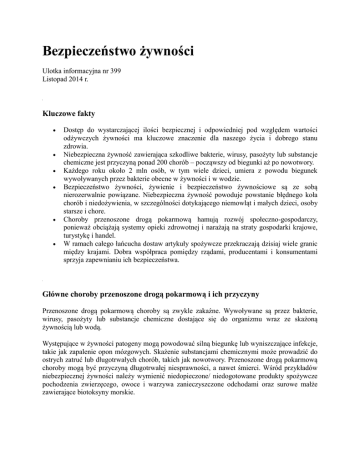 Bezpieczeństwo żywności Ulotka informacyjna nr 399 Listopad 2014 r. Kluczowe fakty Dostęp do wystarczającej ilości bezpiecznej i odpowiedniej pod względem wartości odżywczych żywności ma kluczowe znaczenie dla naszego życia i dobrego stanu zdrowia. Niebezpieczna żywność zawierająca szkodliwe bakterie, wirusy, pasożyty lub substancje chemiczne jest przyczyną ponad 200 chorób – począwszy od biegunki aż po nowotwory. Każdego roku około 2 mln osób, w tym wiele dzieci, umiera z powodu biegunek wywoływanych przez bakterie obecne w żywności i w wodzie. Bezpieczeństwo żywności, żywienie i bezpieczeństwo żywnościowe są ze sobą nierozerwalnie powiązane. Niebezpieczna żywność powoduje powstanie błędnego koła chorób i niedożywienia, w szczególności dotykającego niemowląt i małych dzieci, osoby starsze i chore. Choroby przenoszone drogą pokarmową hamują rozwój społeczno-gospodarczy, ponieważ obciążają systemy opieki zdrowotnej i narażają na straty gospodarki krajowe, turystykę i handel. W ramach całego łańcucha dostaw artykuły spożywcze przekraczają dzisiaj wiele granic między krajami. Dobra współpraca pomiędzy rządami, producentami i konsumentami sprzyja zapewnianiu ich bezpieczeństwa. Główne choroby przenoszone drogą pokarmową i ich przyczyny Przenoszone drogą pokarmową choroby są zwykle zakaźne. Wywoływane są przez bakterie, wirusy, pasożyty lub substancje chemiczne dostające się do organizmu wraz ze skażoną żywnością lub wodą. Występujące w żywności patogeny mogą powodować silną biegunkę lub wyniszczające infekcje, takie jak zapalenie opon mózgowych. Skażenie substancjami chemicznymi może prowadzić do ostrych zatruć lub długotrwałych chorób, takich jak nowotwory. Przenoszone drogą pokarmową choroby mogą być przyczyną długotrwałej niesprawności, a nawet śmierci. Wśród przykładów niebezpiecznej żywności należy wymienić niedopieczone/ niedogotowane produkty spożywcze pochodzenia zwierzęcego, owoce i warzywa zanieczyszczone odchodami oraz surowe małże zawierające biotoksyny morskie. Bakterie Salmonella, Campylobacter i enterokrwotoczny szczep Escherichia coli to jedne z najczęściej spotykanych patogenów obecnych w żywności, które każdego roku wywołują u milionów ludzi choroby i zakażenia, czasami o bardzo ciężkim przebiegu a nawet kończące się zgonem. Występujące objawy to gorączka, ból głowy, nudności, wymioty, bóle brzucha i biegunka. Do żywności mogącej być powodem wybuchu epidemii salmonellozy należą jaja, drób i inne produkty pochodzenia zwierzęcego. Przyczyną chorób wywoływanych bakterią Campylobacter jest głównie spożycie surowego mleka, surowego lub niedopieczonego/niedogotowanego drobiu i zanieczyszczonej wody pitnej. Źródłem zakażenia entero krwotocznym szczepem Escherichia coli jest niepasteryzowane mleko, niedopieczone/niedogotowane mięso oraz świeże owoce i warzywa. Zakażenie bakteriami Listeria może być przyczyną poronień u kobiet i zgonów noworodków. Chociaż wywoływana nimi choroba występuje stosunkowo rzadko, z uwagi na poważne, a czasami śmiertelne skutki, szczególnie w przypadku niemowląt, dzieci i osób starszych, bakterie Listeria uznawane są za powodujące jedne z najcięższych zakażeń pokarmowych. Bakterie Listeria występują w niepasteryzowanych produktach mlecznych i różnych daniach gotowych do spożycia. Rozwijają się także w warunkach chłodniczych. Bakterie Vibrio cholerae dostają się do organizmu człowieka wraz z zanieczyszczoną wodą lub żywnością. Do występujących objawów należą bóle brzucha, wymioty i silna wodnista biegunka, która może prowadzić do ciężkiego odwodnienia, a nawet śmierci. Wybuchy epidemii cholery łączone są ze spożyciem ryżu, warzyw, kleiku jaglanego i różnych rodzajów owoców morza. Kluczową rolę w leczeniu zakażeń bakteryjnych odgrywają leki przeciwbakteryjne , takie jak antybiotyki. Jednak ich nadużywanie i niewłaściwe stosowanie w leczeniu zwierząt i ludzi doprowadziło do rozwoju i rozprzestrzeniania się opornych bakterii, które sprawiają, że leczenie chorób zakaźnych jest nieskuteczne. Oporne bakterie trafiają do łańcucha żywnościowego za pośrednictwem zwierząt (np. bakterie Salmonella za pośrednictwem kurczaków). Lekooporność mikroorganizmów to jedno z głównych zagrożeń dla współczesnej medycyny. Wirusy Zakażeniom norowirusami towarzyszą nudności, chlustające wymioty, wodnista biegunka i bóle brzucha. Wirus zapalenia wątroby typu A może powodować długotrwałą chorobę wątroby. Zwykle rozprzestrzenia się za pośrednictwem surowych lub niedogotowanych owoców morza i skażonych surowych produktów. Źródłem skażenia produktów spożywczych jest często zainfekowany personel pracujący przy tej żywności. Pasożyty Niektóre pasożyty, takie jak przywry występujące w organizmach ryb, trafiają do organizmu człowieka wyłącznie po spożyciu skażonej żywności. Inne, np. Echinococcus spp, mogą dostawać się tam za pośrednictwem żywności lub w wyniku bezpośredniego kontaktu ze zwierzętami. Jeszcze inne, takie jak Ascaris, Cryptosporidium, Entamoeba histolytica i Giardia, trafiają do łańcucha żywnościowego za pośrednictwem wody i mogą powodować skażenie świeżych produktów. Priony Priony, czynniki zakaźne zbudowane z białka, powodują niektóre choroby neurodegeneracyjne. Gąbczasta encefalopatia bydła (BSE, choroba szalonych krów) to atakująca zwierzęta choroba prionowa uznawana za odpowiedzialną za wywoływanie wariantu choroby Creutzfeldta-Jakoba (vCJD) u ludzi. Najbardziej prawdopodobną drogą dostawania się prionów do organizmu człowieka jest spożycie produktów z wołowiny zawierających tkanki stanowiące szczególne zagrożenie (np. tkankę mózgu). Substancje chemiczne Największe zagrożenie dla zdrowia stanowią naturalnie występuj